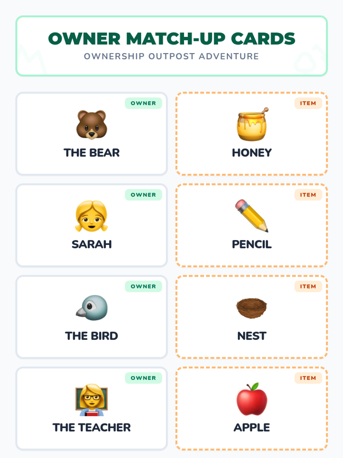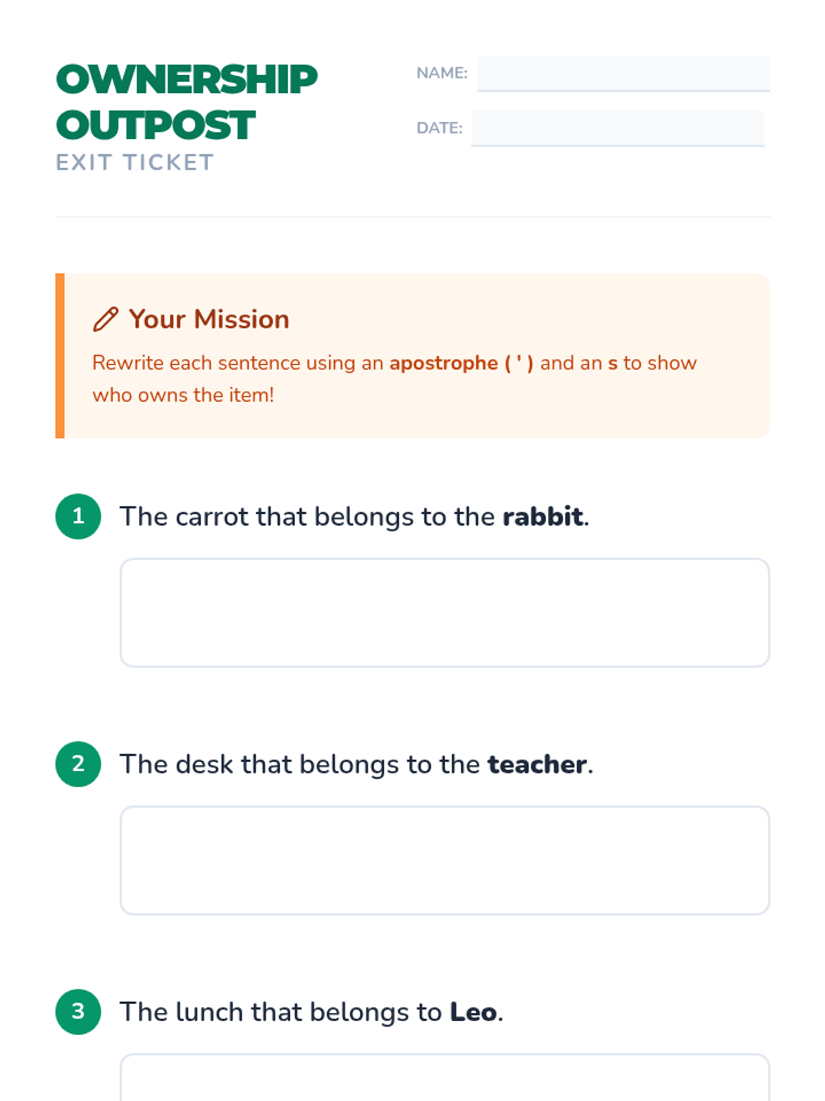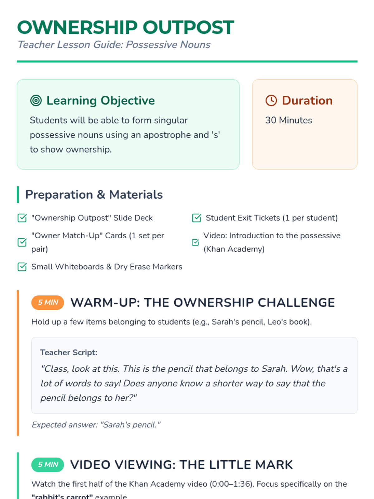 A 2nd grade grammar lesson focused on forming singular possessive nouns using an apostrophe and 's'. Students watch a video, engage in a hands-on 'Owner Match-Up' activity, and complete a possessive exit ticket.