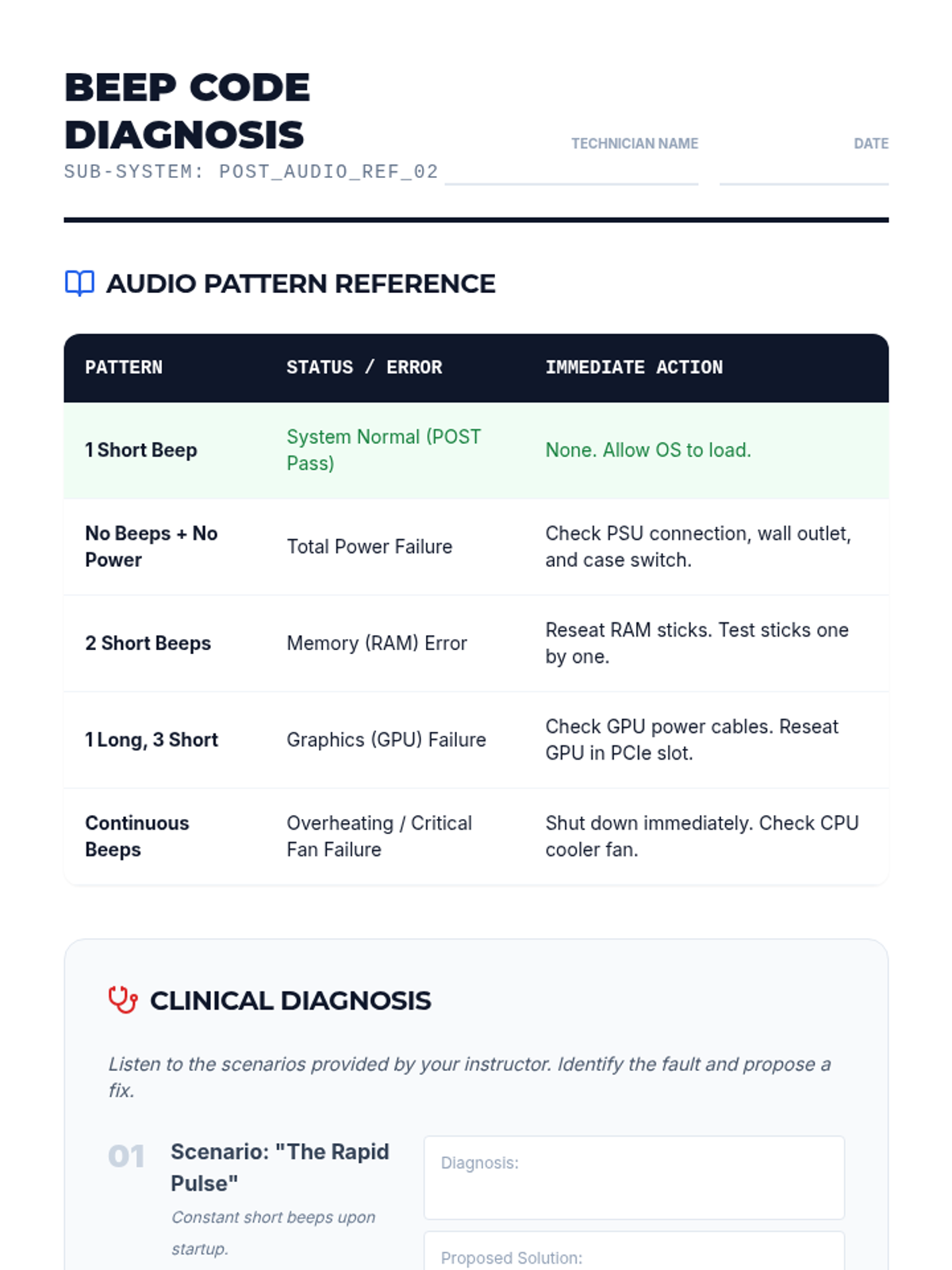 This lesson breaks down the Power-On Self-Test (POST). Students learn to interpret beep codes and BIOS/UEFI messages to identify hardware faults that occur before the OS loads.