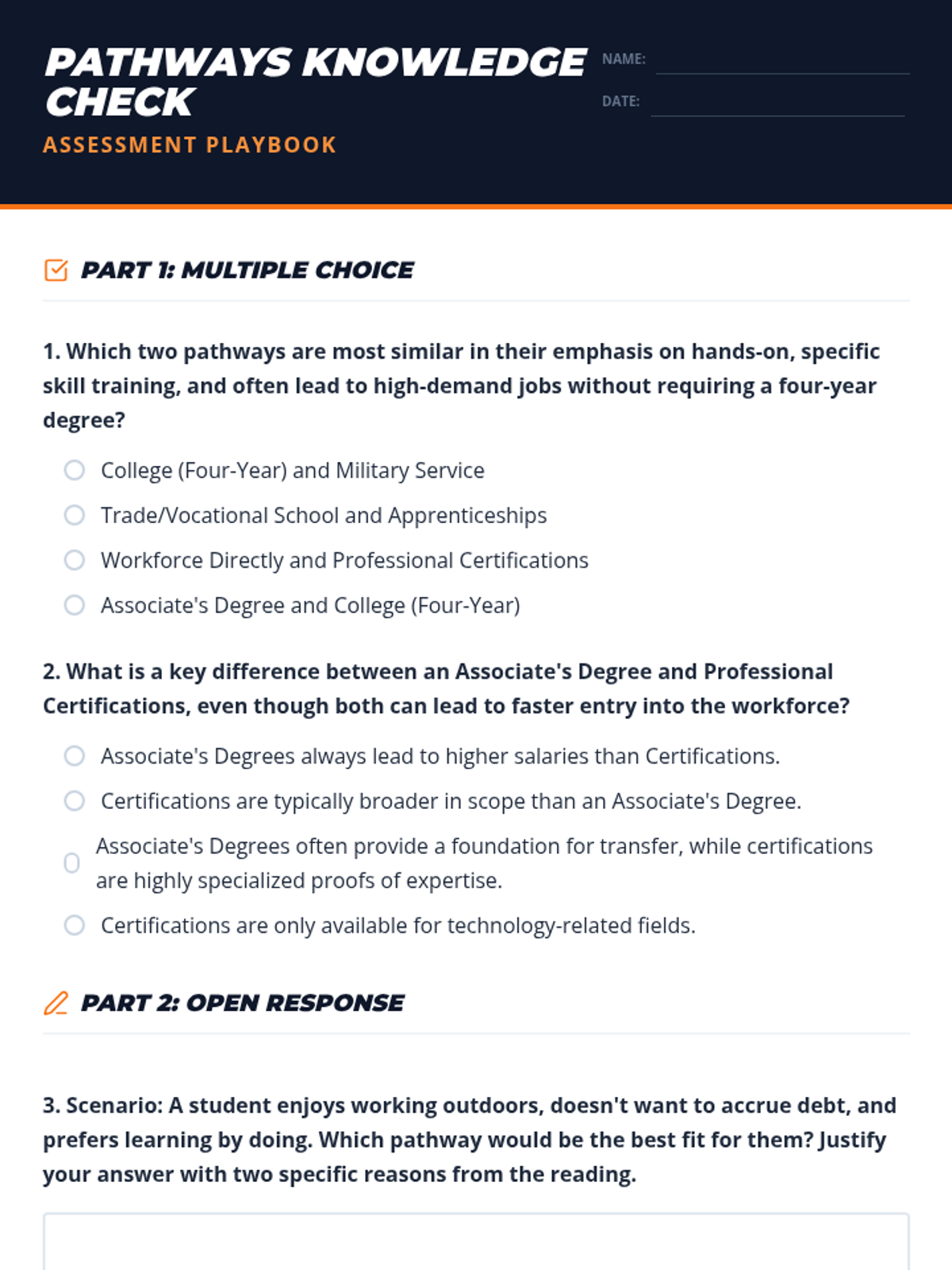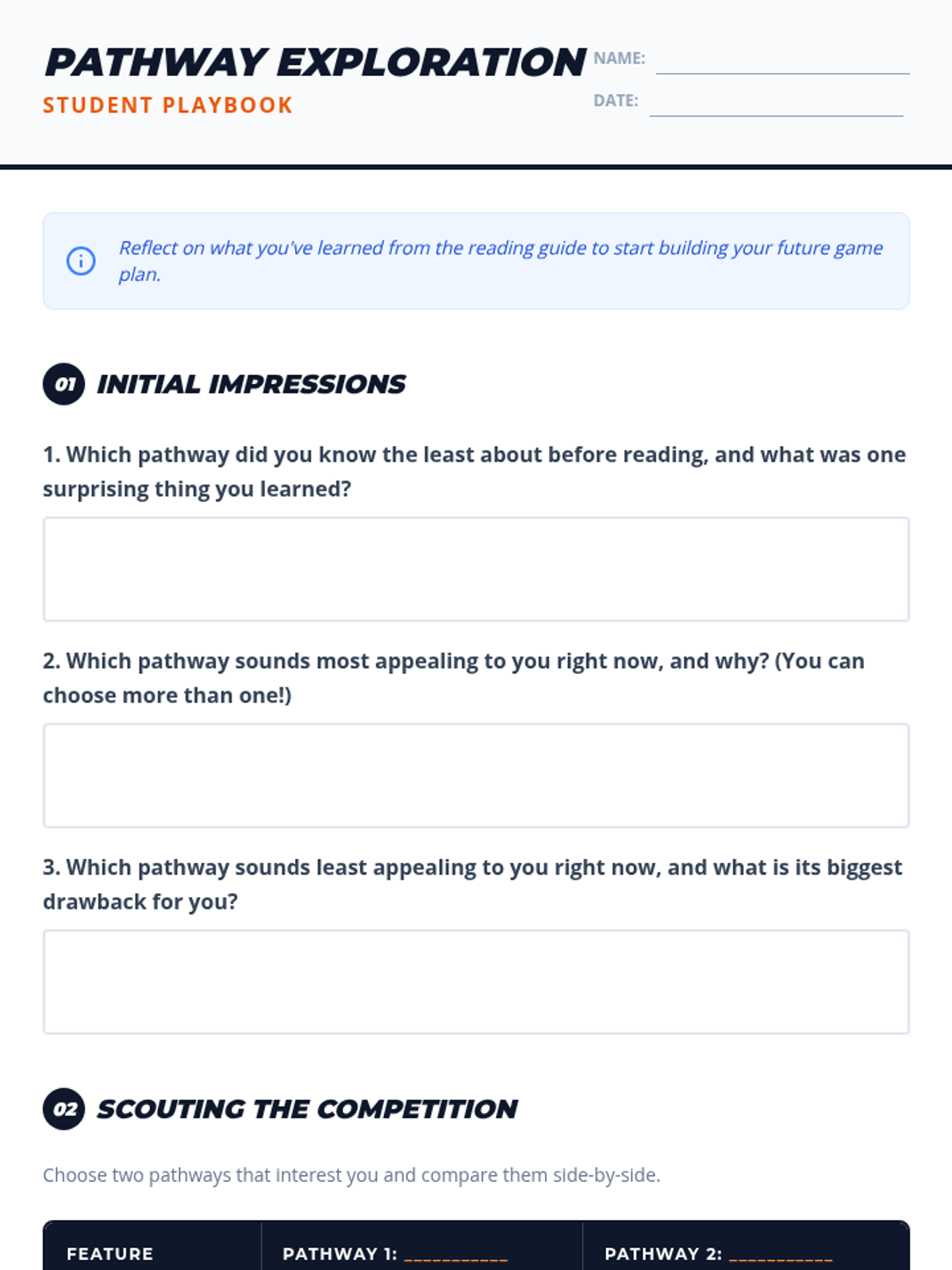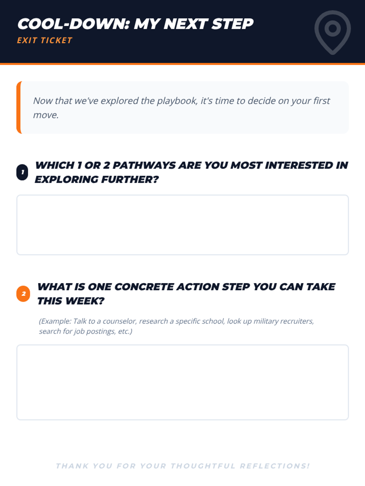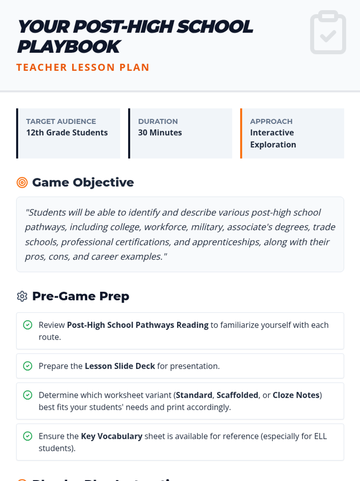 A comprehensive 30-minute lesson for 12th graders to explore various post-secondary options, from college to trade schools and military service, helping them build their personal 'playbook' for the future.