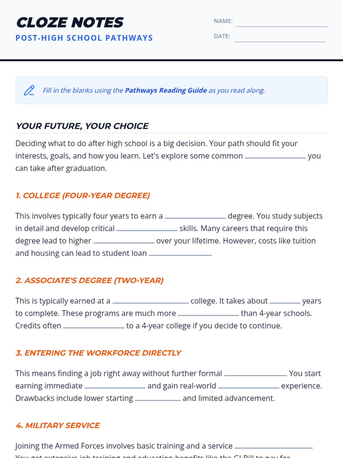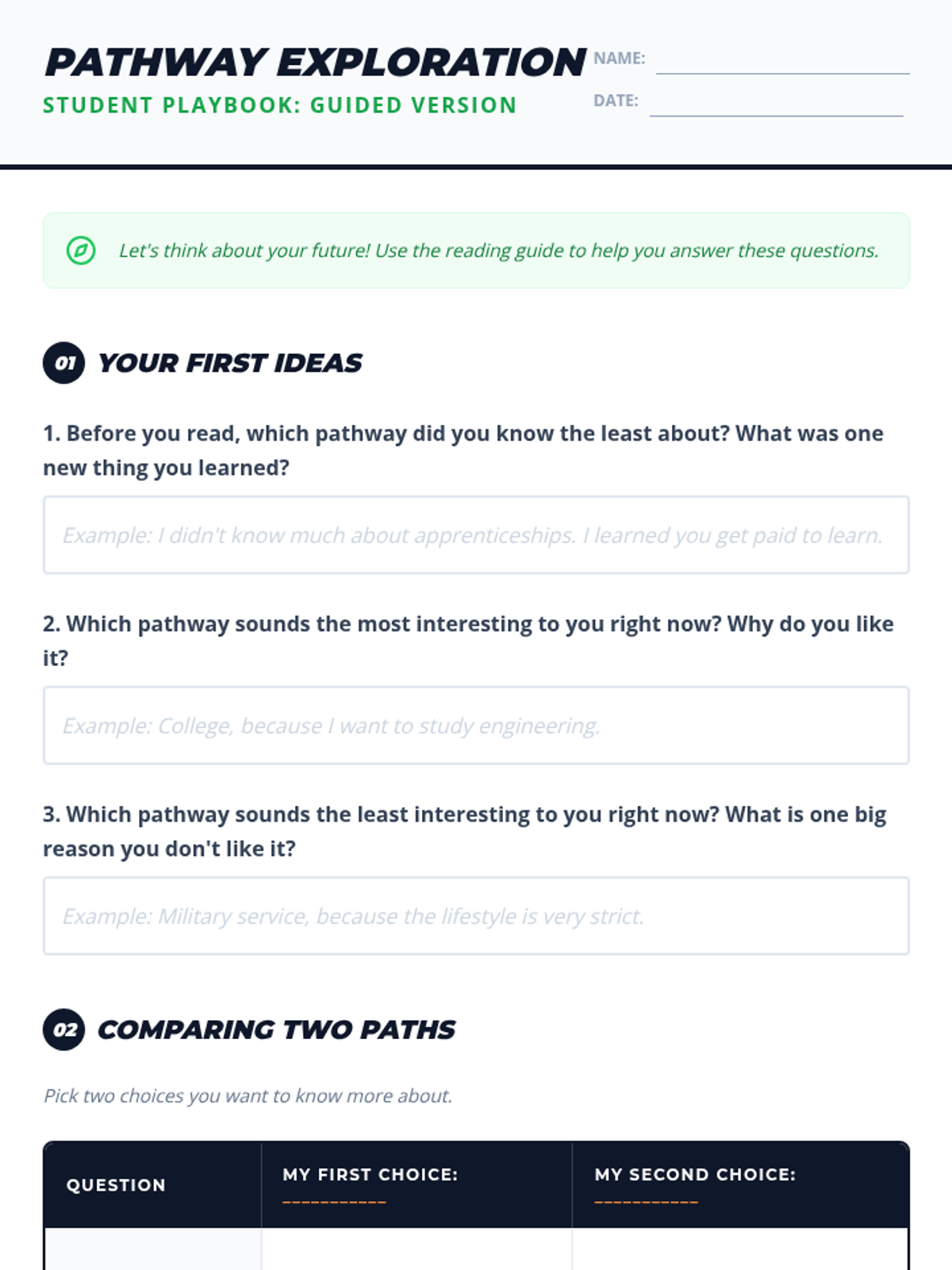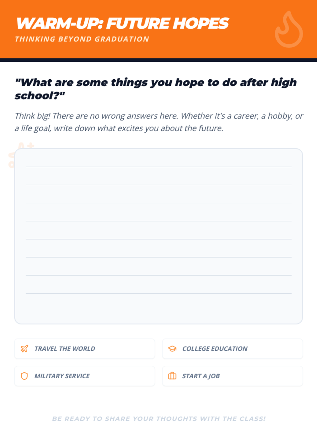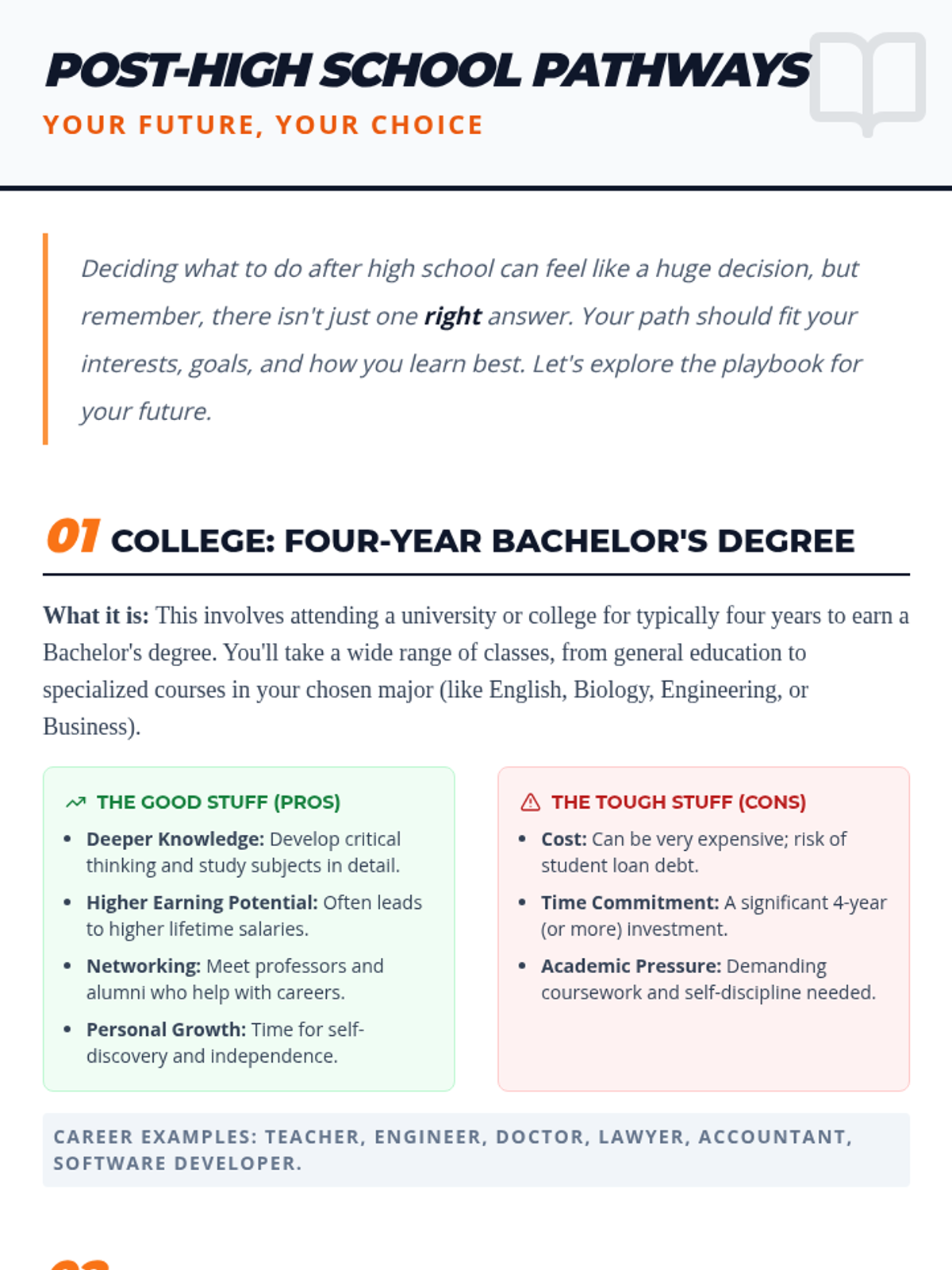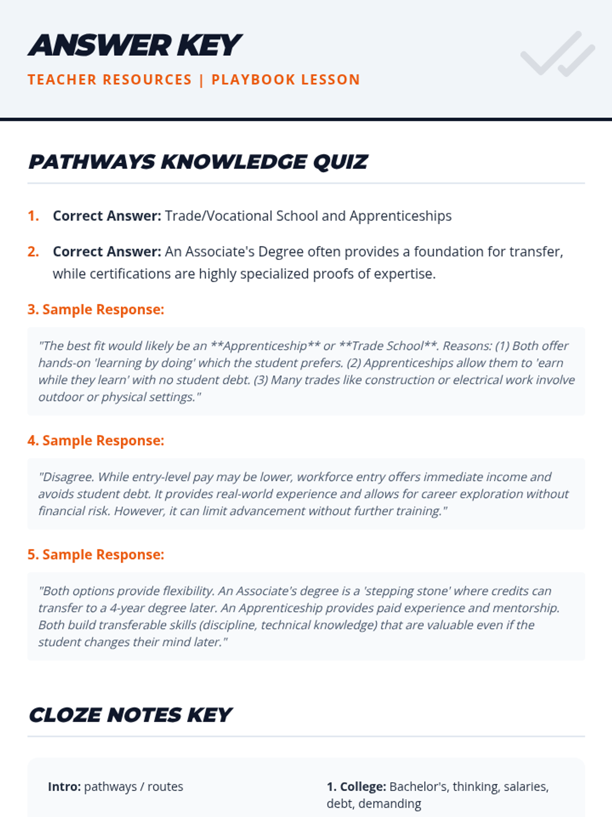A comprehensive 30-minute lesson for 12th graders to explore various post-secondary options, from college to trade schools and military service, helping them build their personal 'playbook' for the future.