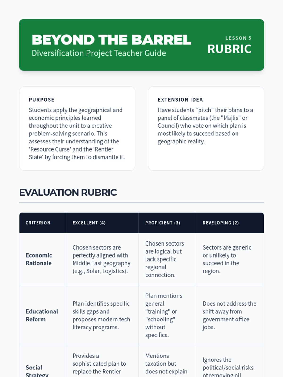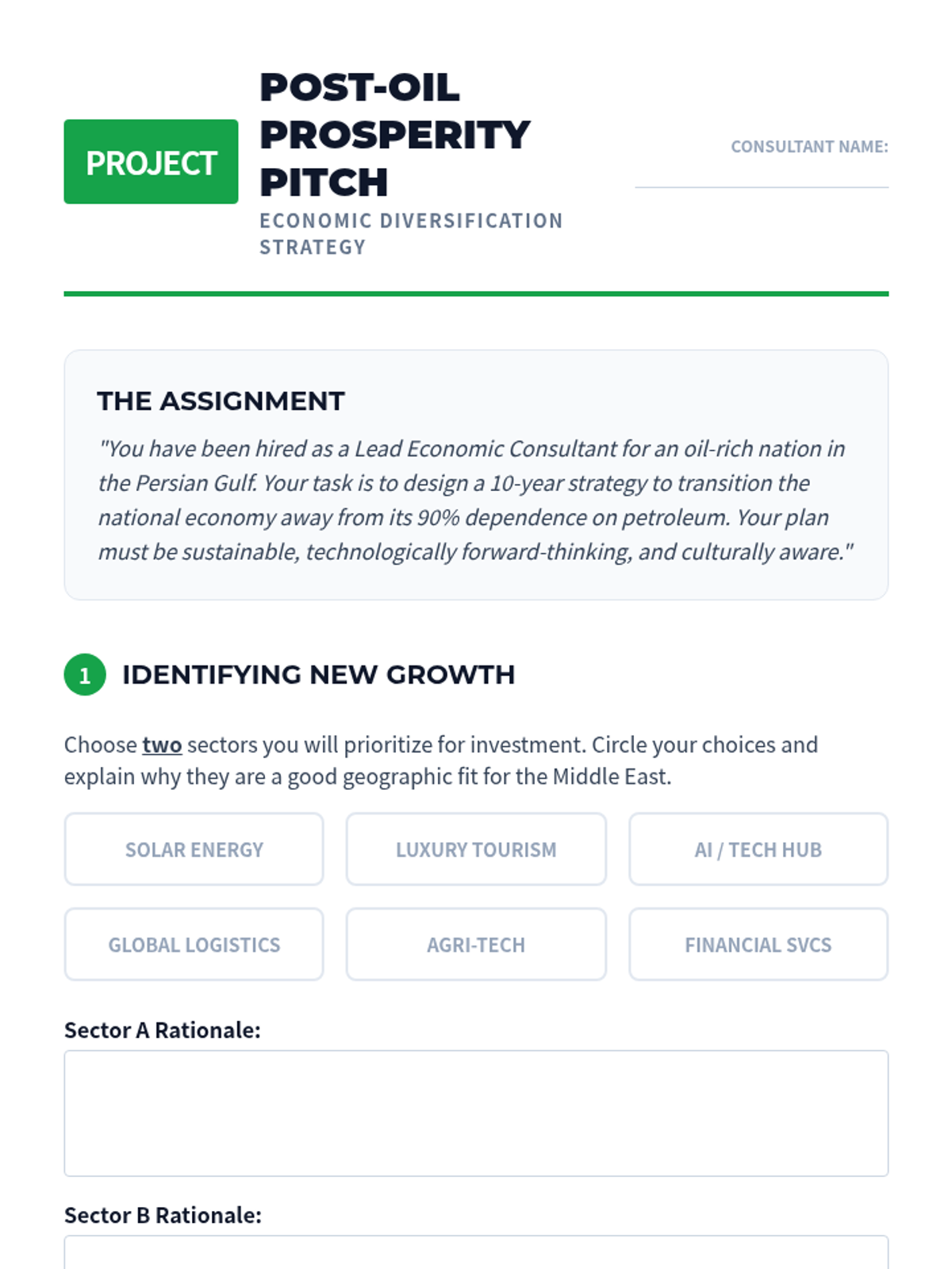 Evaluating national plans to transition away from oil dependence, focusing on tourism, technology, and renewable energy investments.