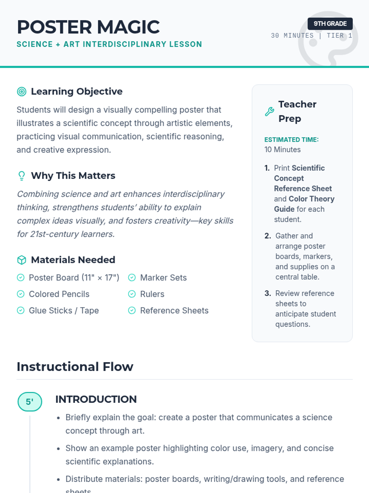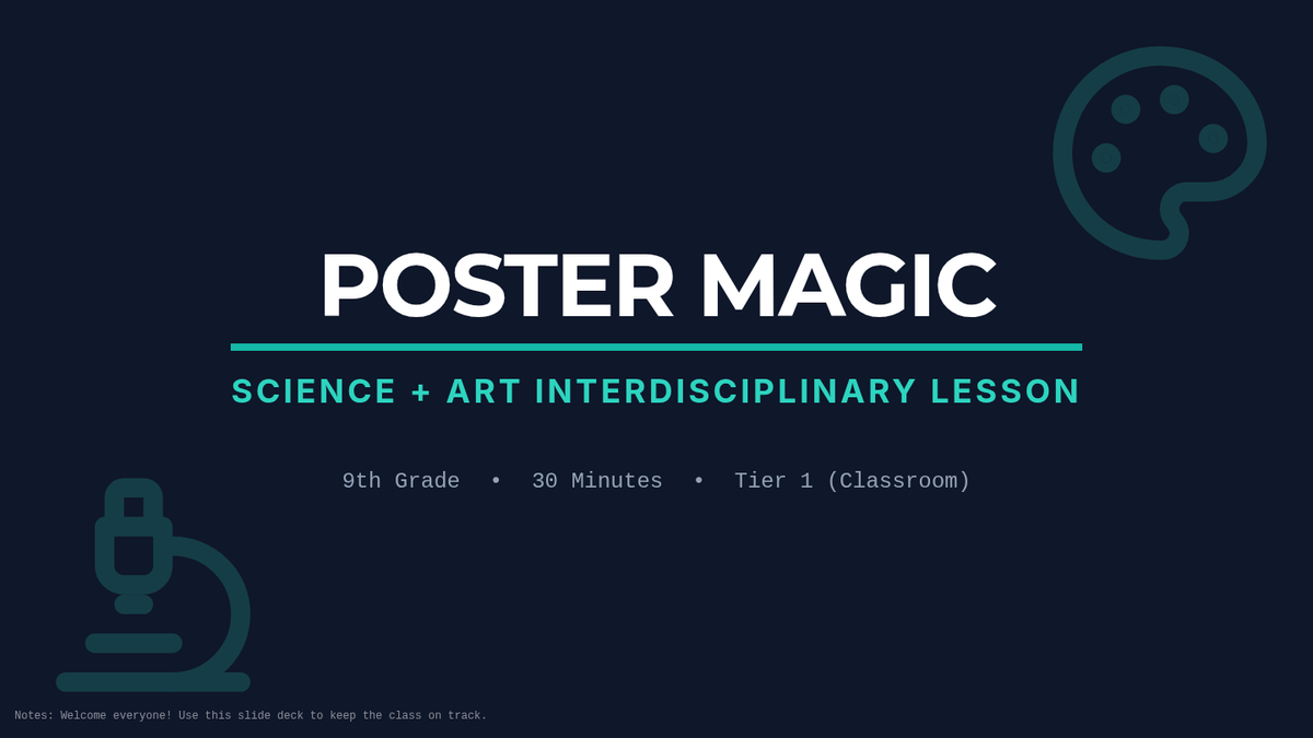 A 30-minute interdisciplinary lesson for 9th graders that combines scientific concepts with artistic color theory to create visually compelling educational posters.