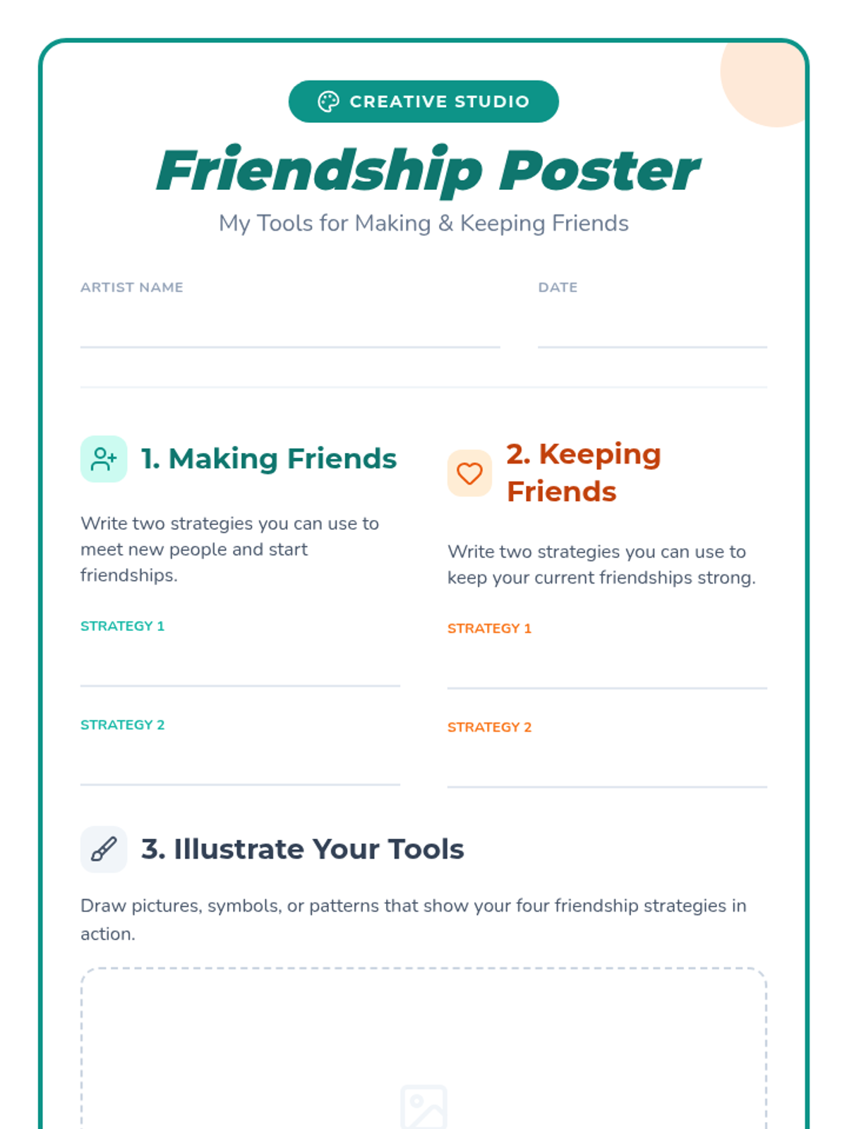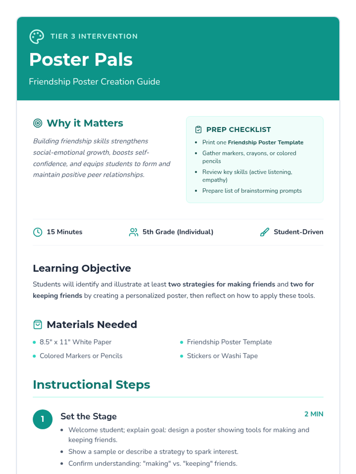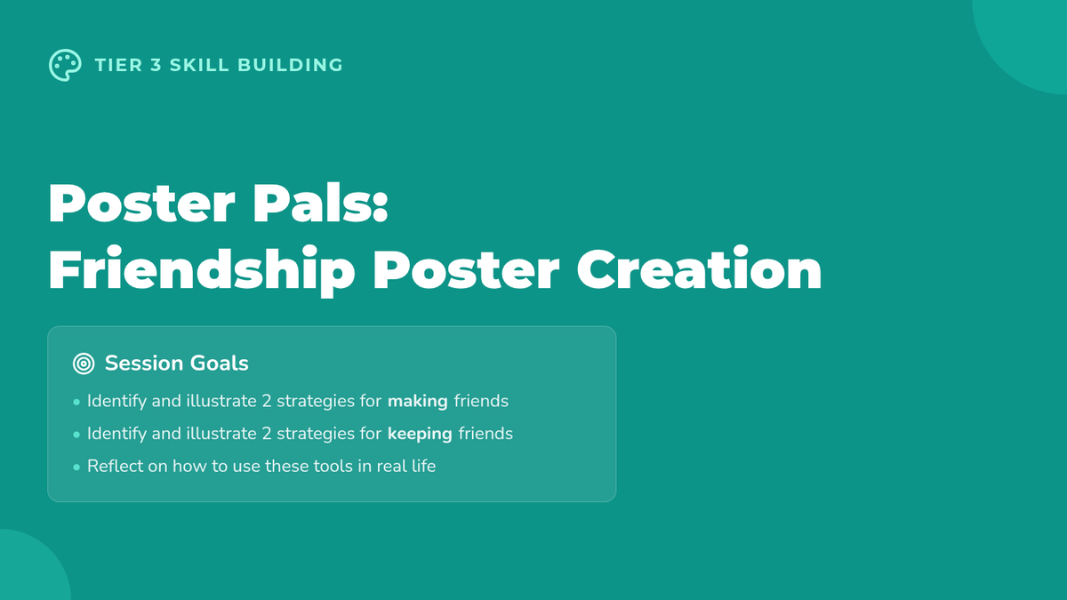 An individual Tier 3 counseling session where 5th graders design personalized friendship posters to learn and reflect on tools for making and keeping friends.