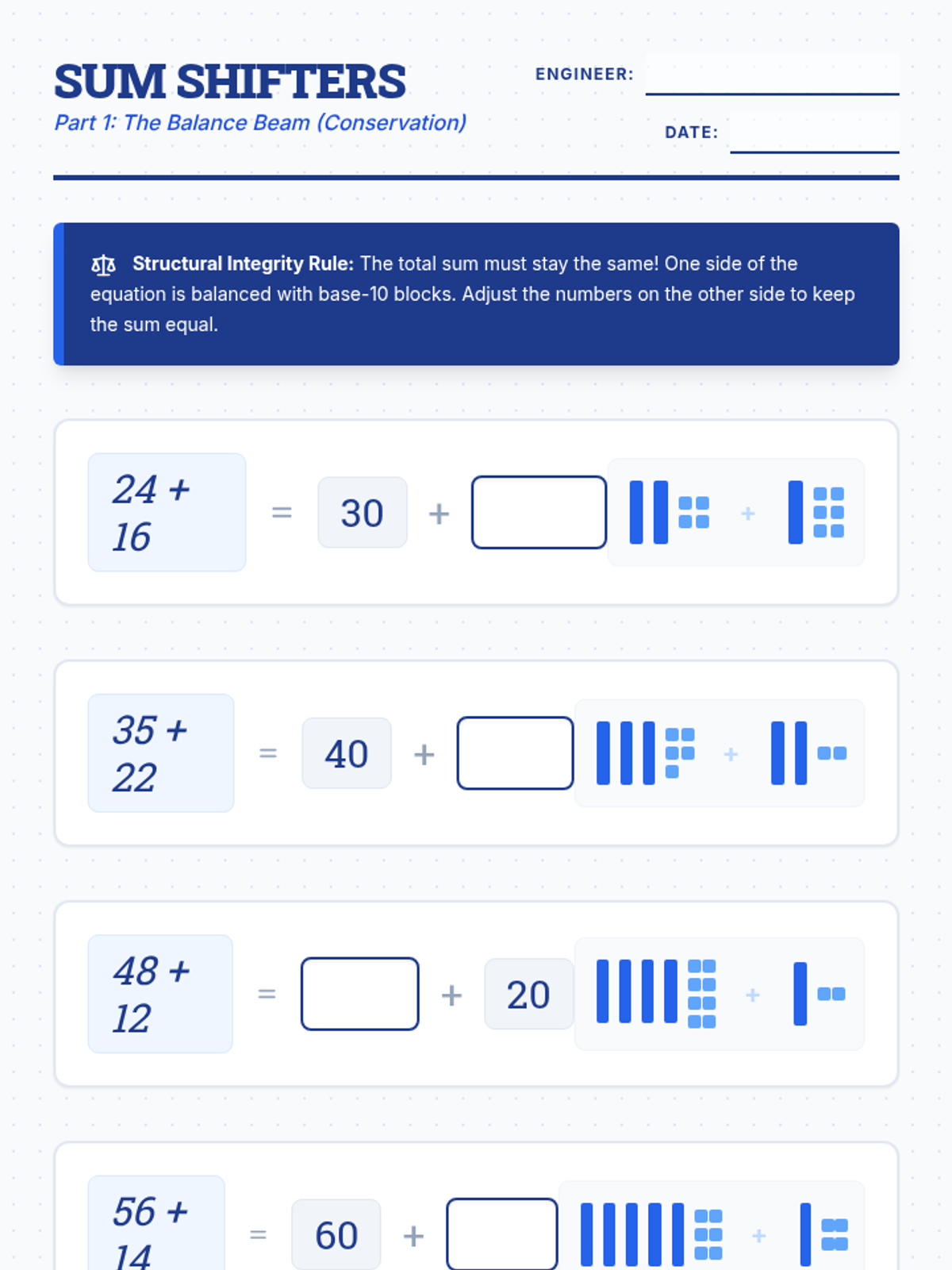 A lesson focused on mental math strategies for double-digit addition, specifically exploring how to maintain a sum while changing addends (conservation) and how to efficiently add increments of tens and ones.