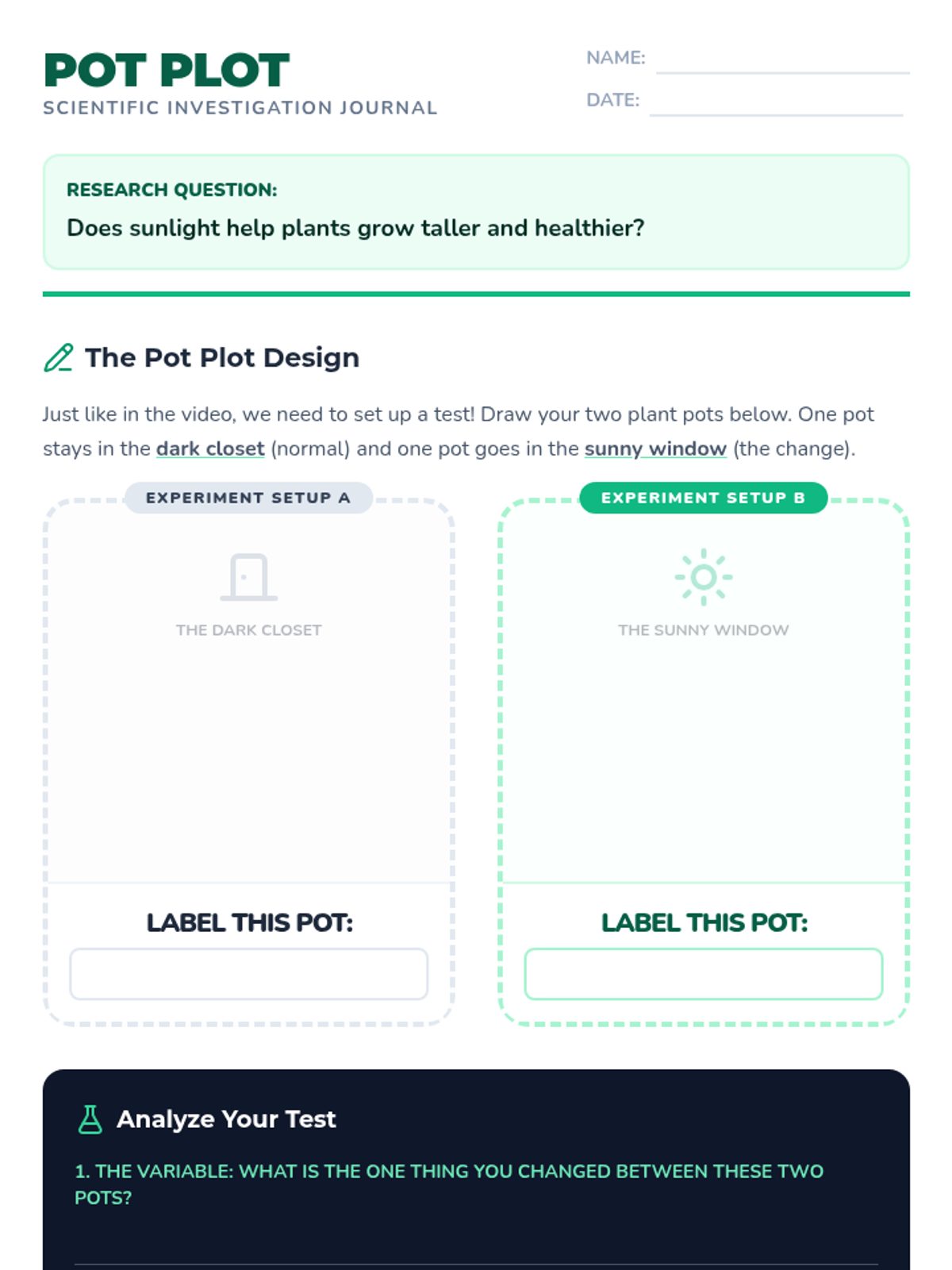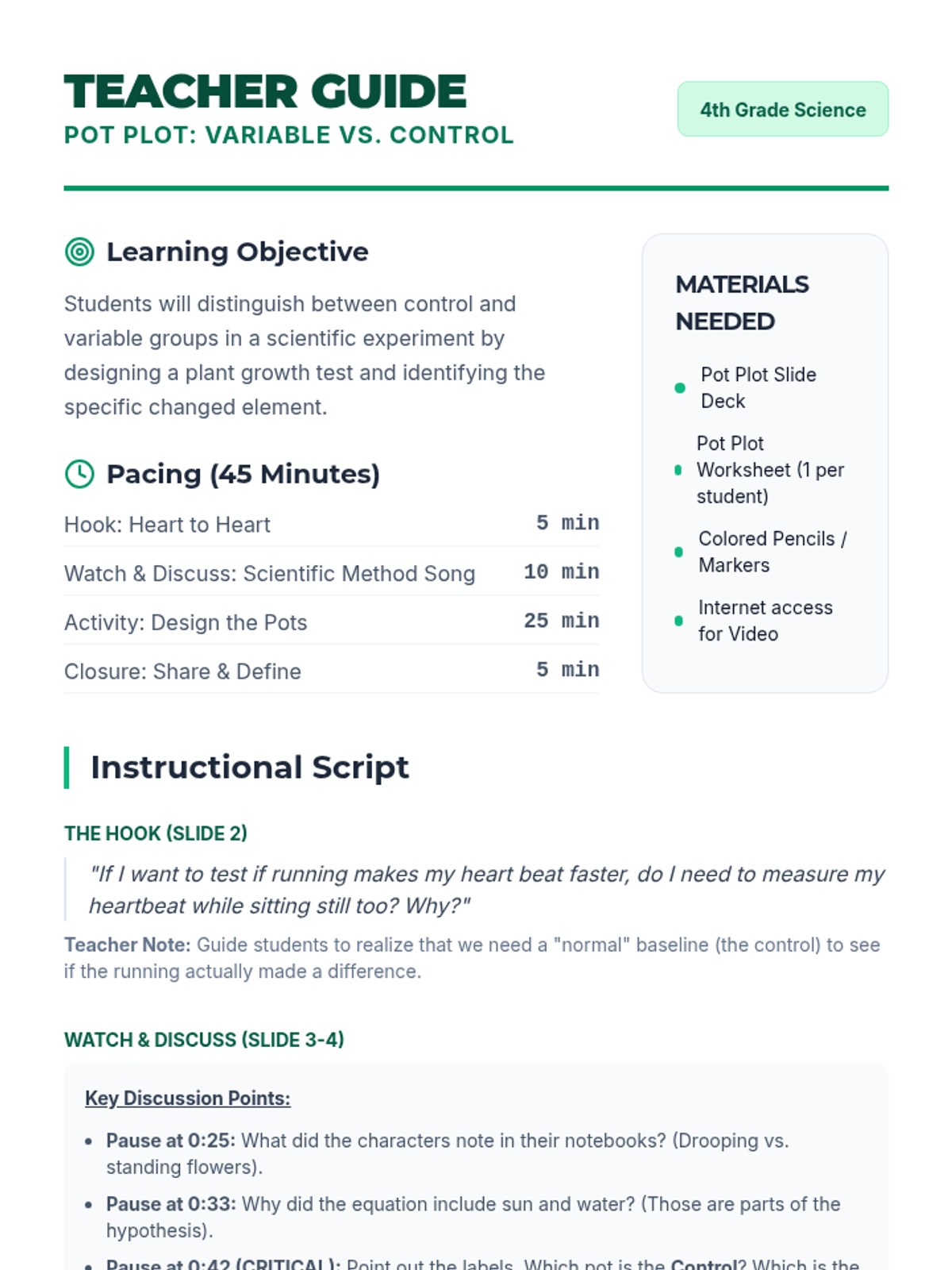 A lesson where students use a scientific method song to identify the difference between control and variable groups through a plant growth experiment.