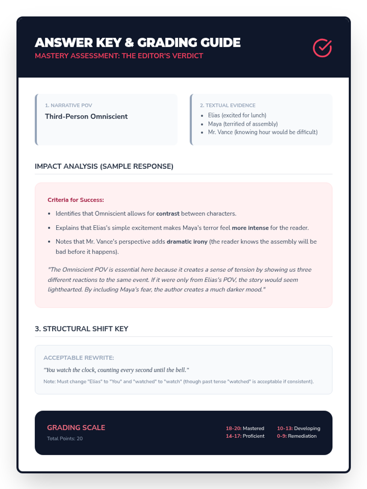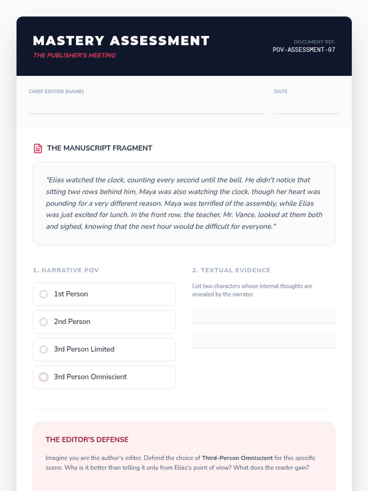 A mastery check where students analyze a text's POV and defend an author's choice of perspective in a simulated professional context.