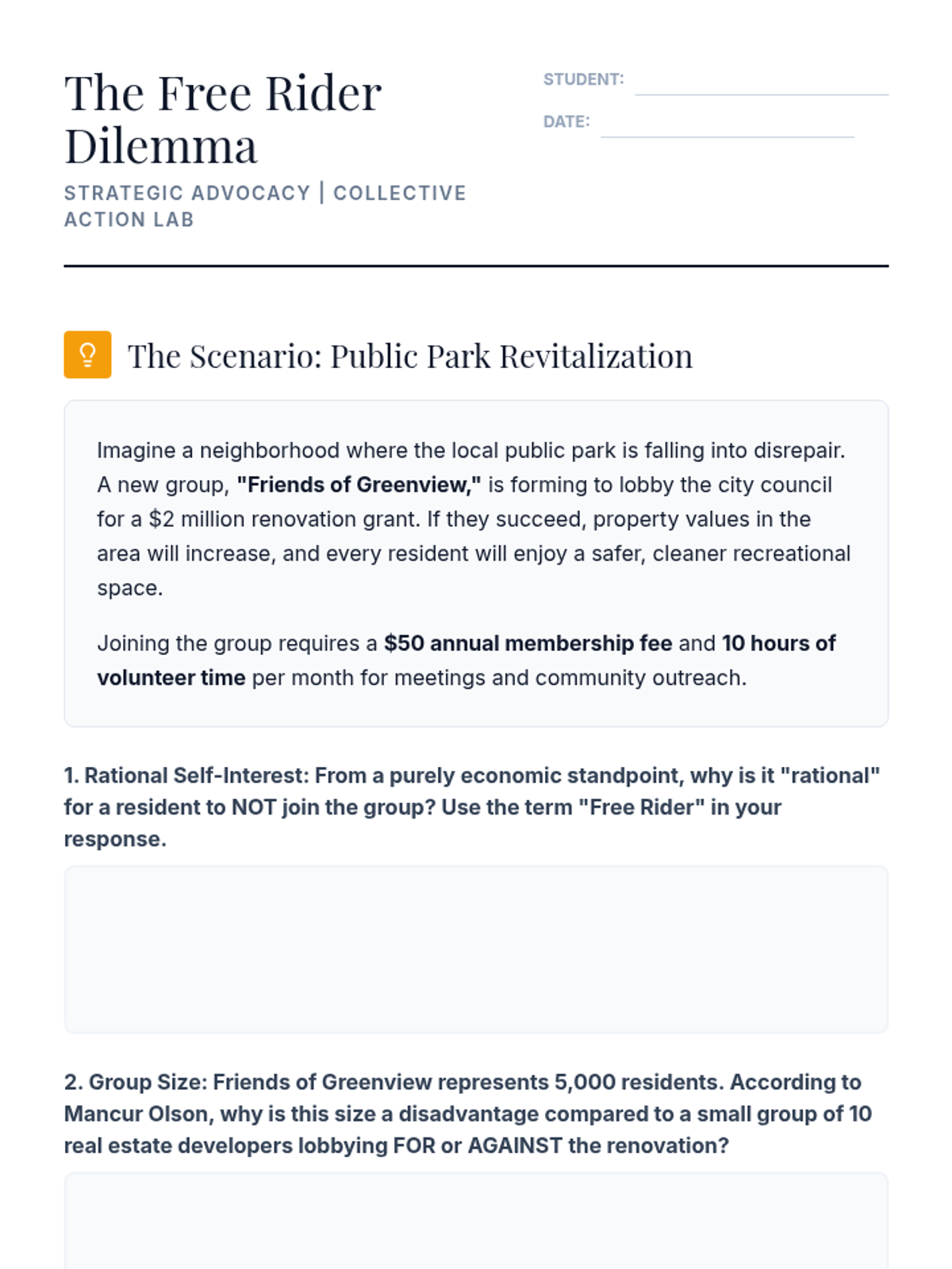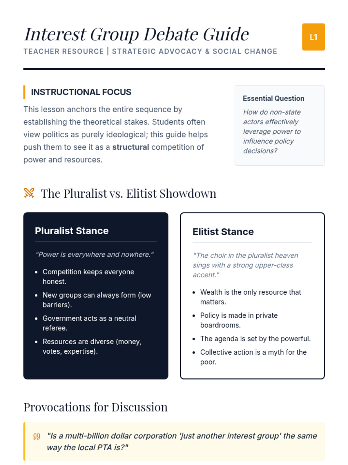 Students explore the tension between pluralism and elitism while analyzing the 'Collective Action Problem' that governs how groups form and maintain power.