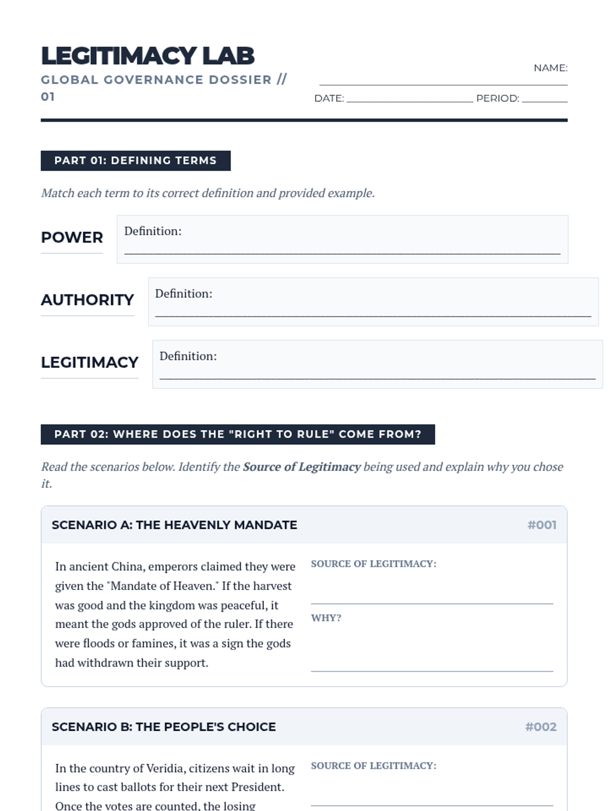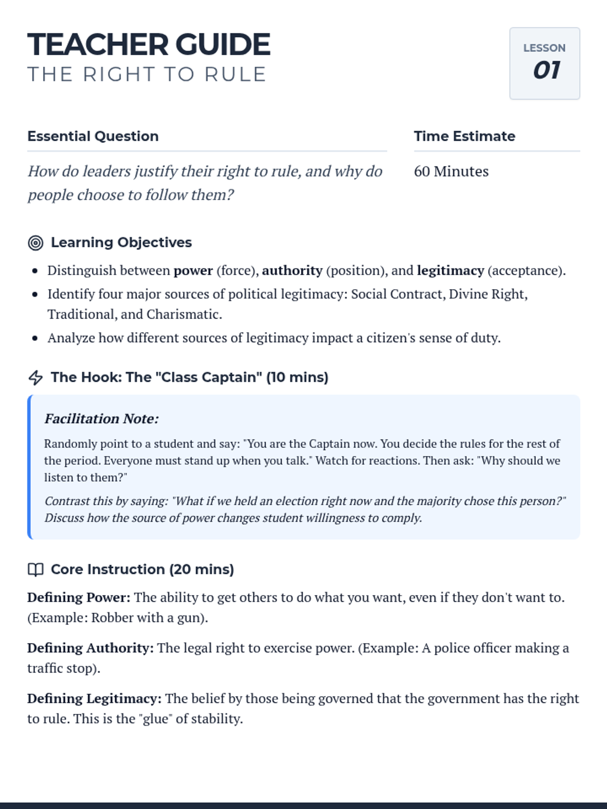 Students define power, authority, and legitimacy while exploring how leaders gain the right to rule.