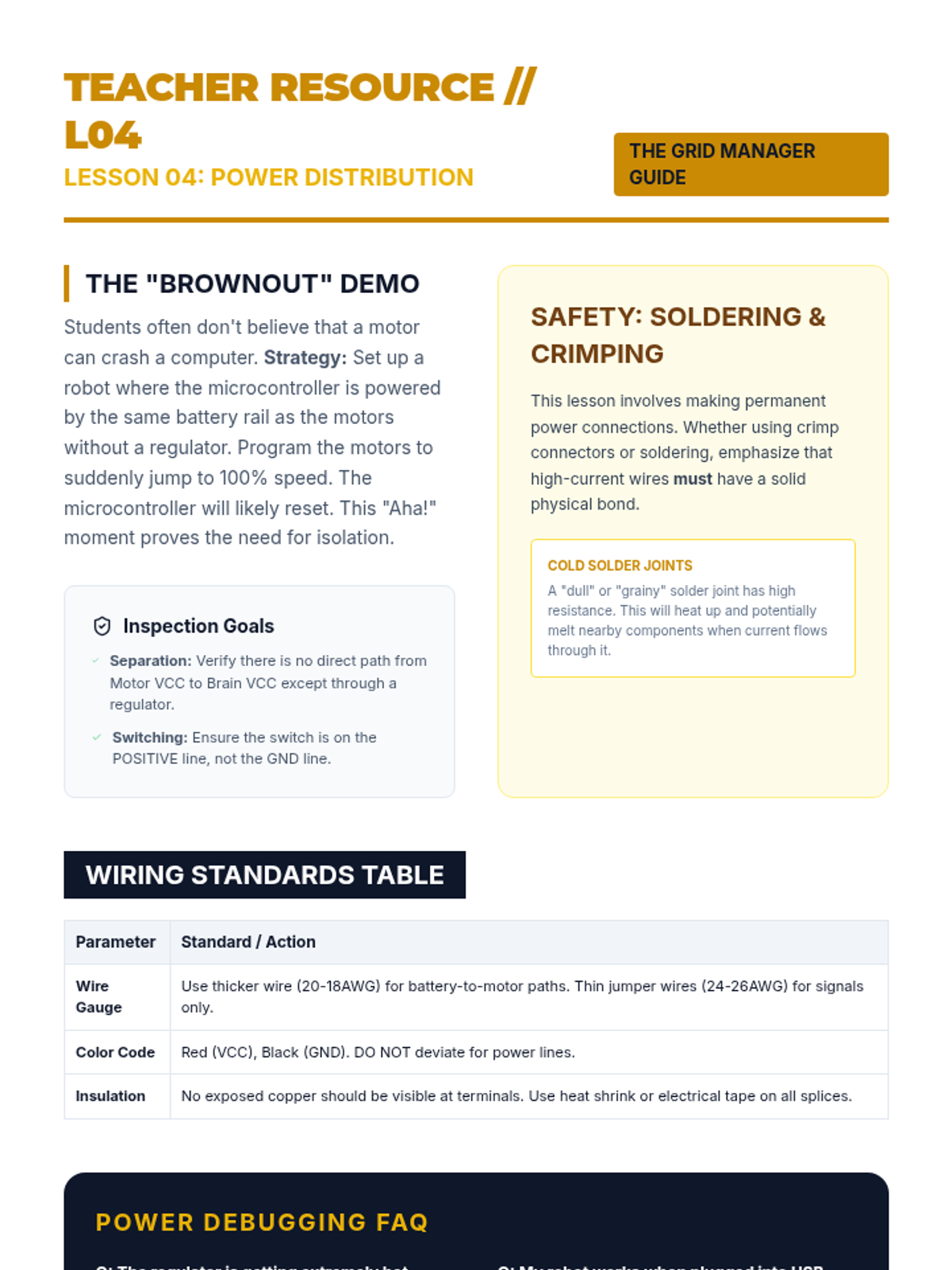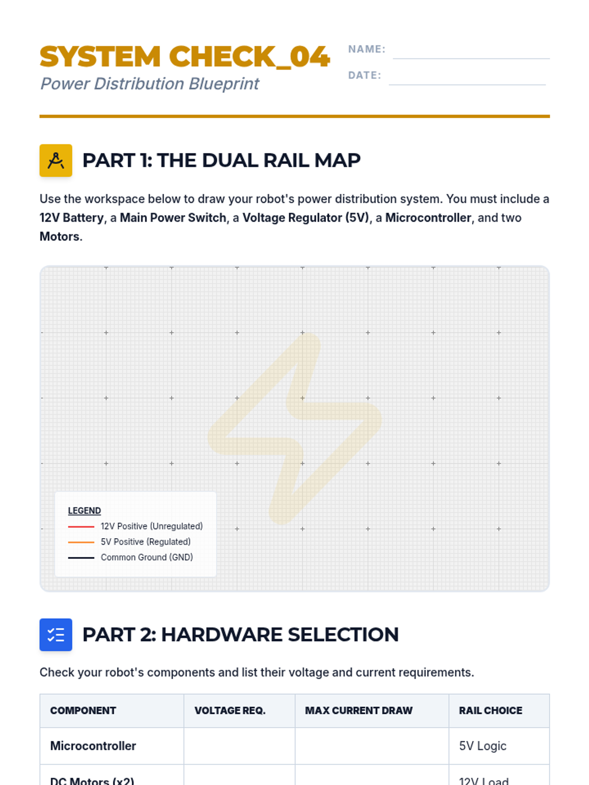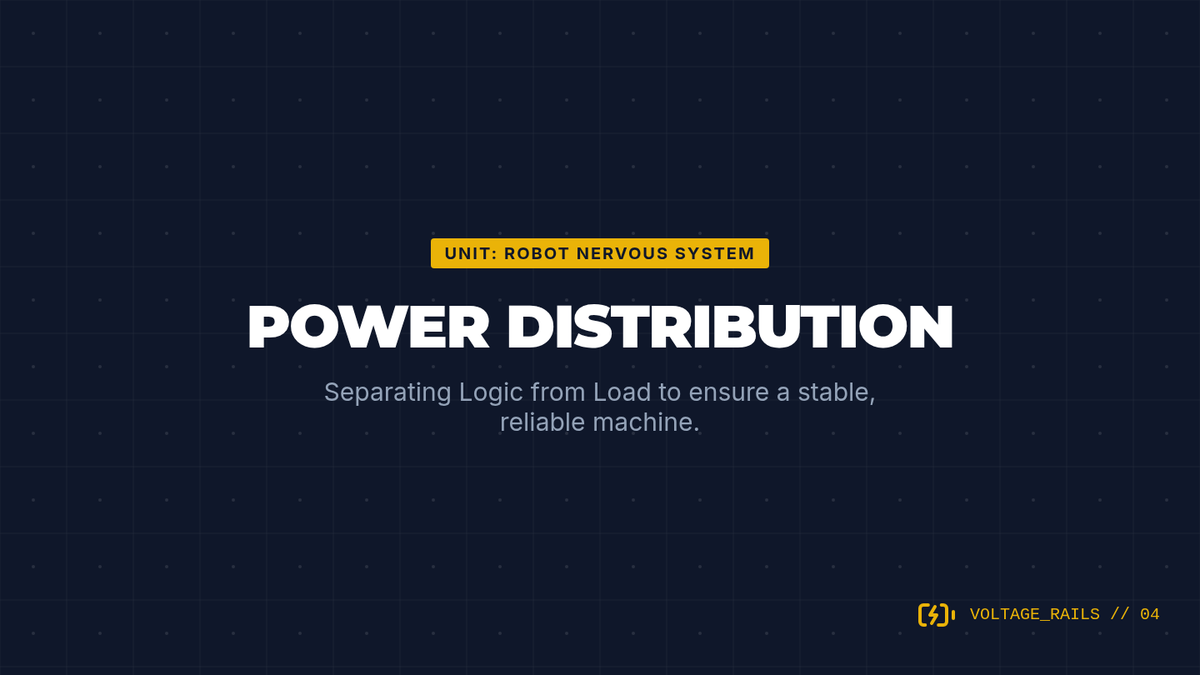 Students design stable power distribution systems, separating sensitive logic power from high-draw motor power to ensure reliability.