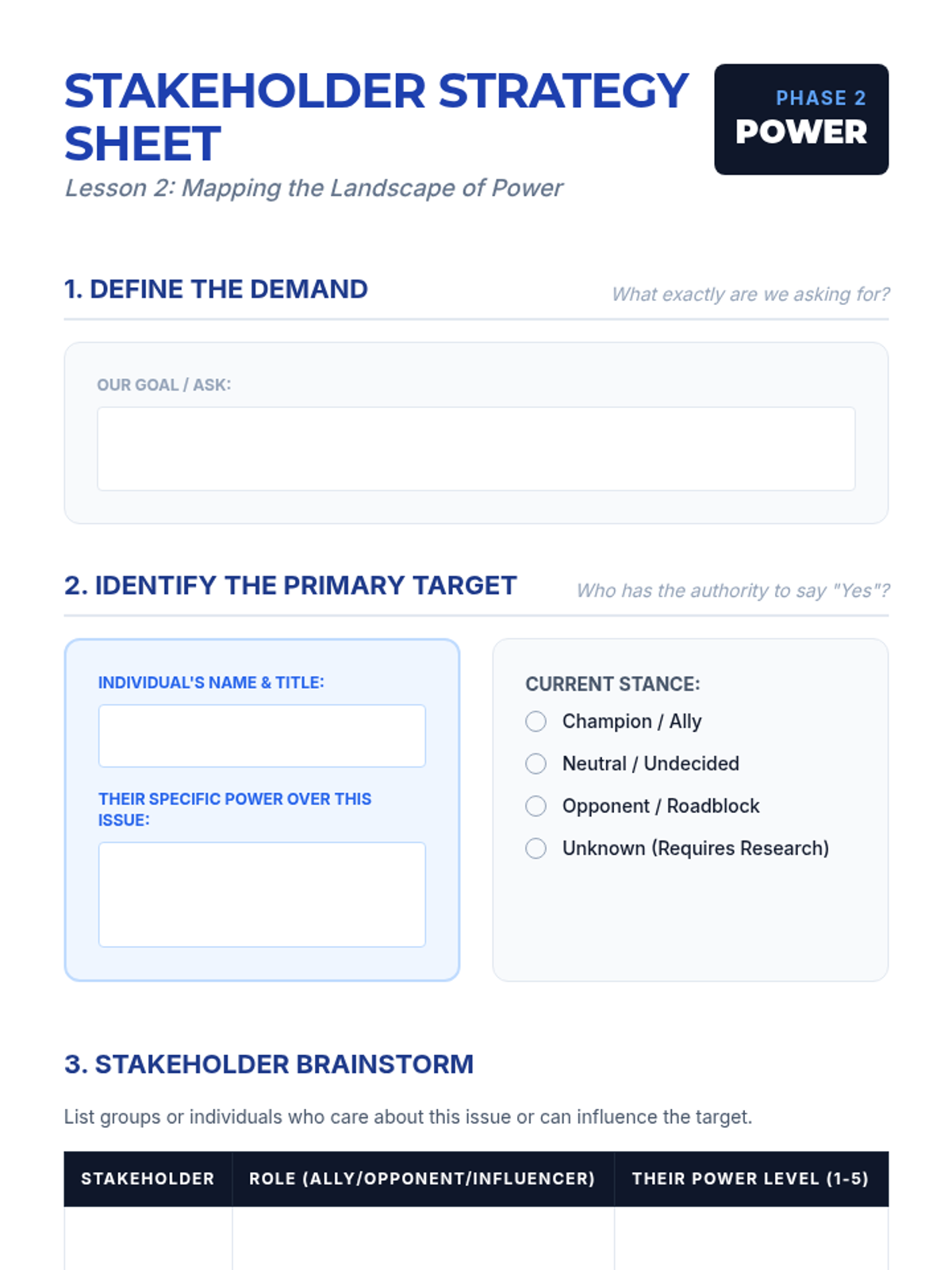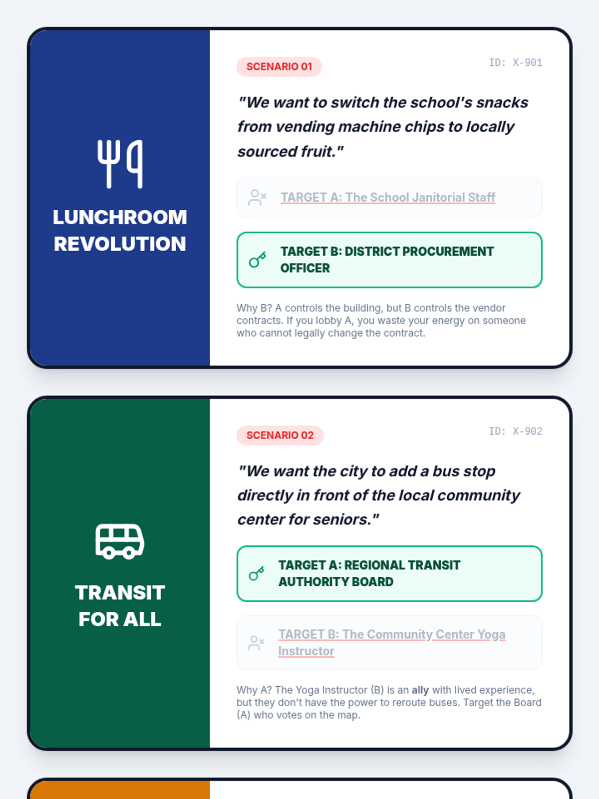 Students conduct power analyses to identify decision-makers and influencers, creating visual maps to strategize their advocacy targets.