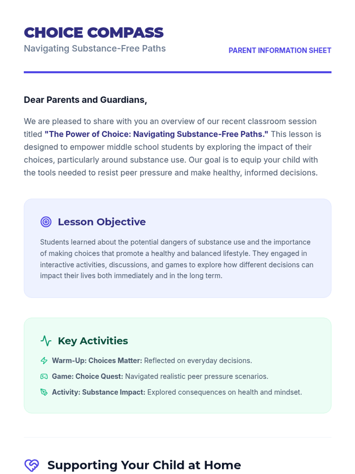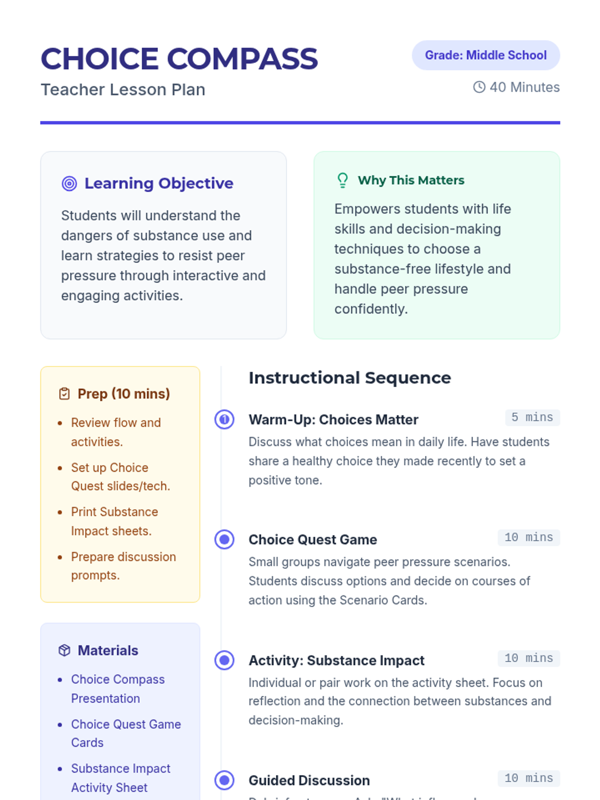 A 40-minute middle school lesson focused on substance abuse prevention, empowering students to make healthy choices and resist peer pressure through interactive activities and reflection.