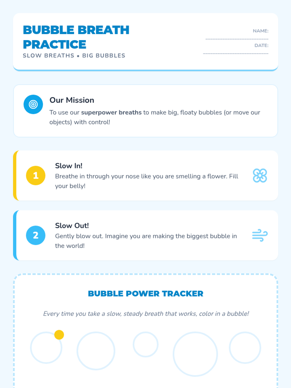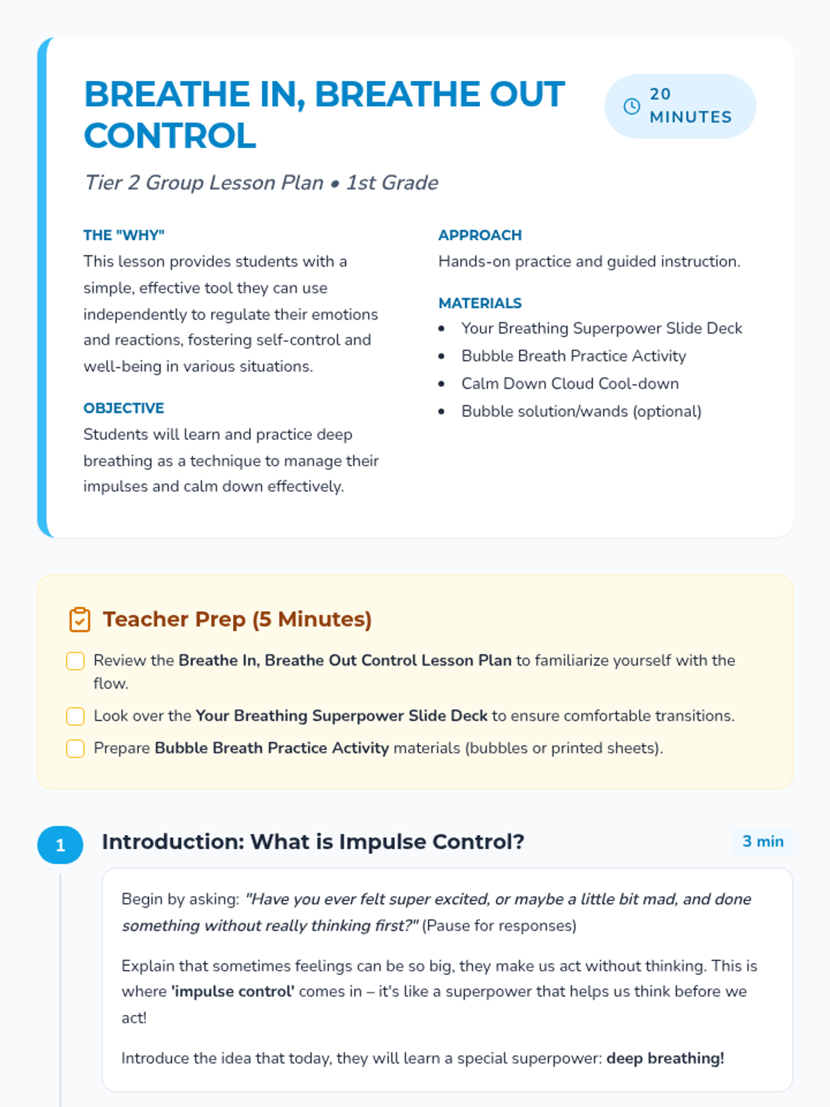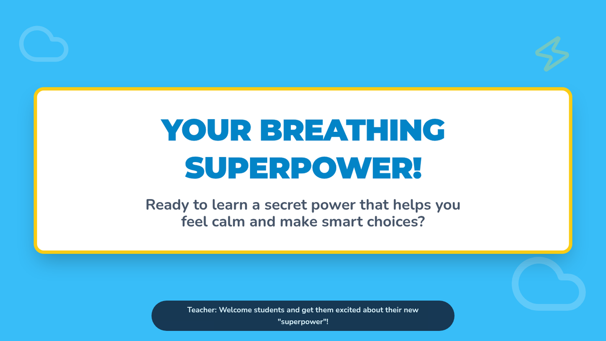 A 20-minute Tier 2 group lesson for 1st graders focusing on deep breathing as a tool for impulse control and emotional regulation. Students learn the 'superpower' of slow breaths through interactive slides and a bubble-blowing activity.