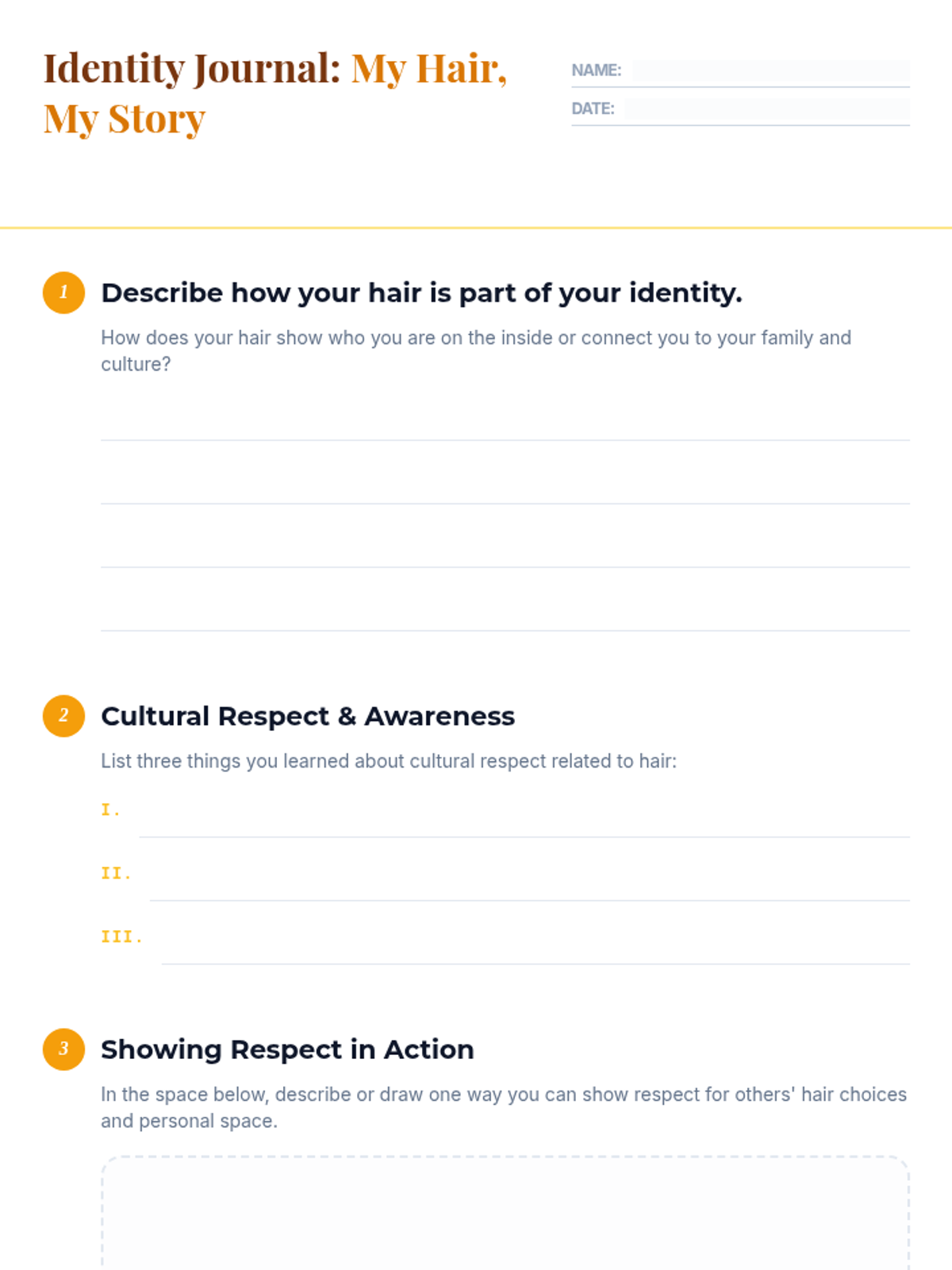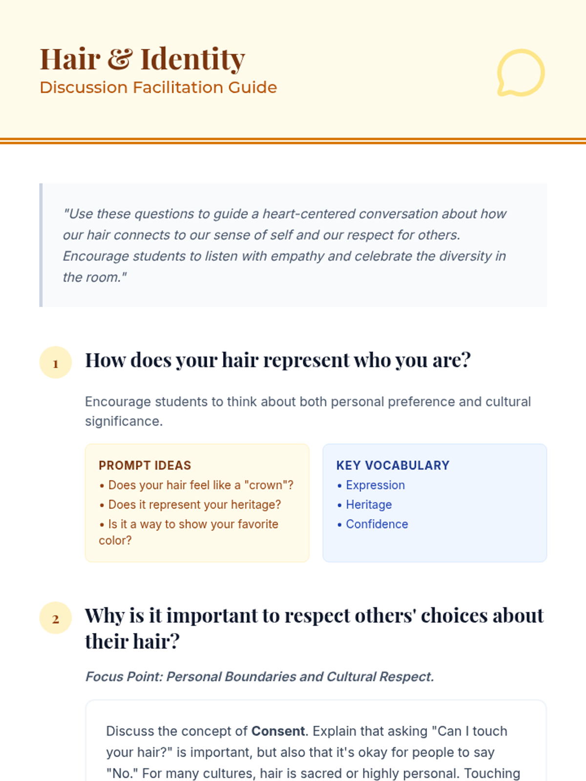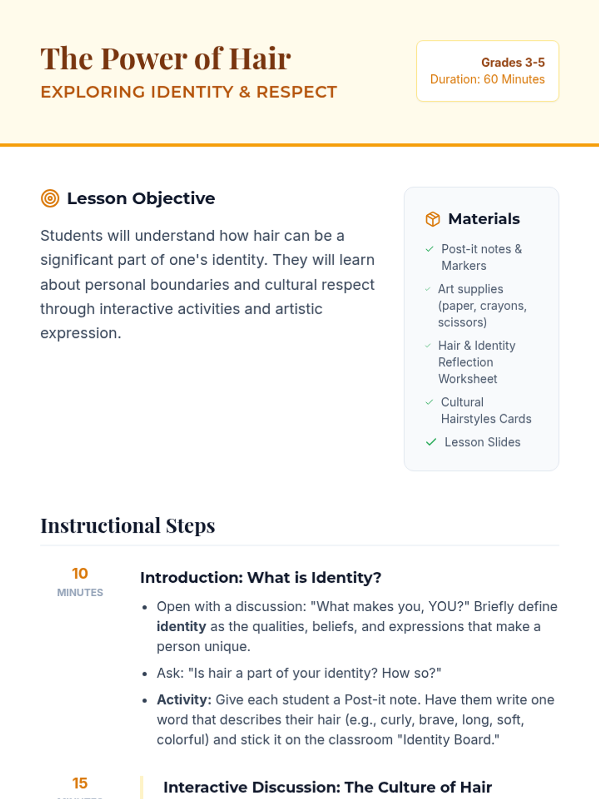 This lesson helps students understand how hair is a significant part of identity and culture, teaching personal boundaries and respect through discussion and art.