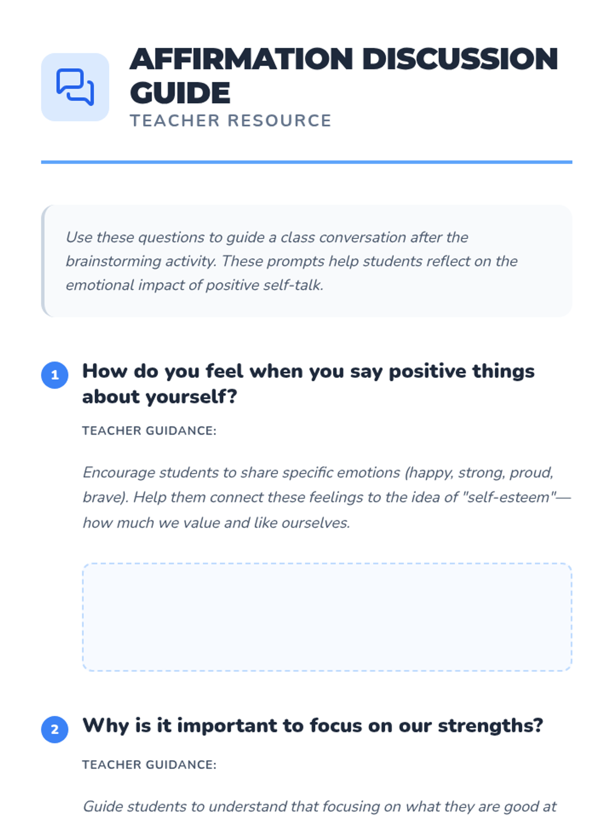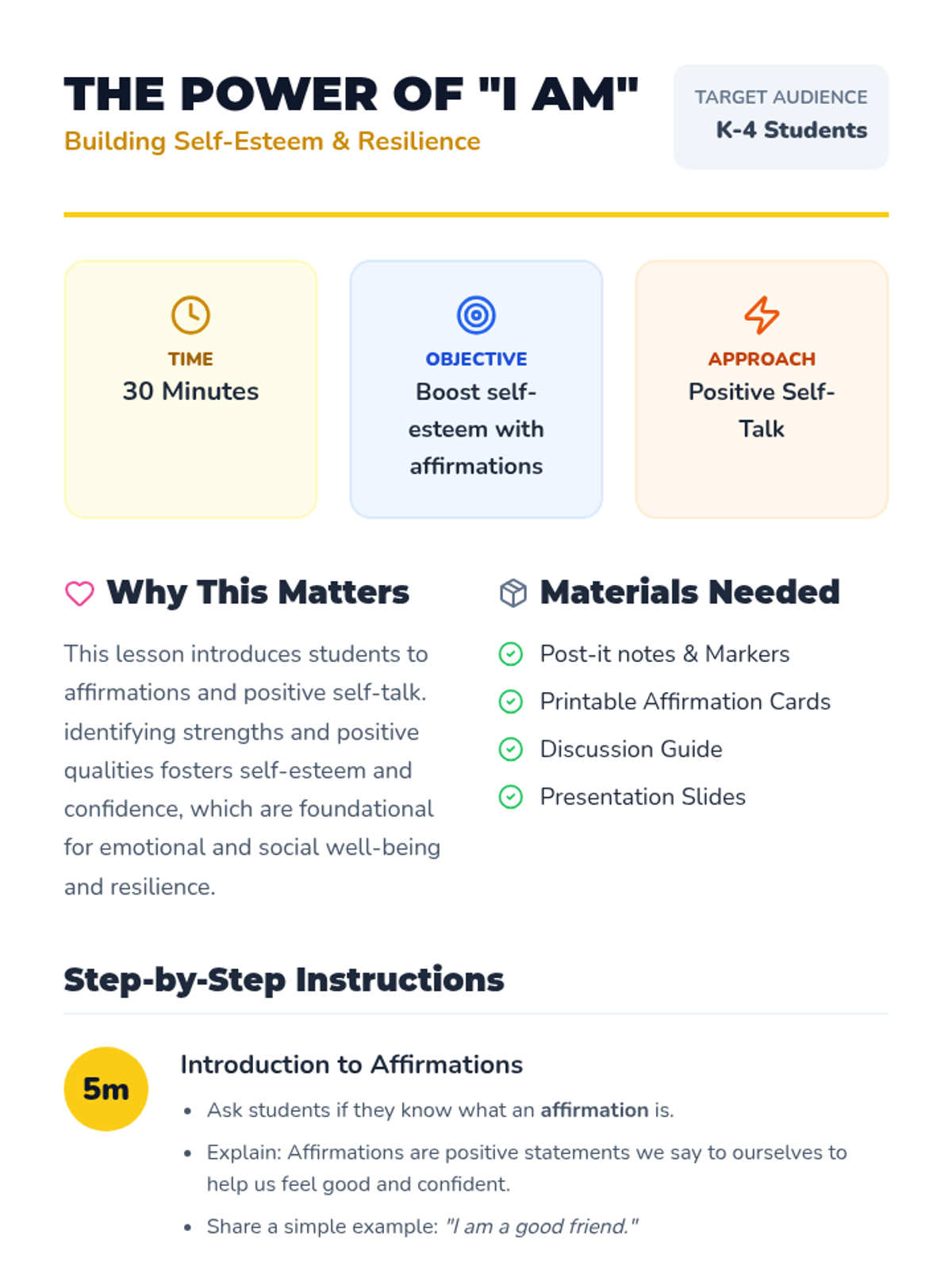 A foundational lesson for K-4 students on the power of affirmations and positive self-talk to build self-esteem and resilience.