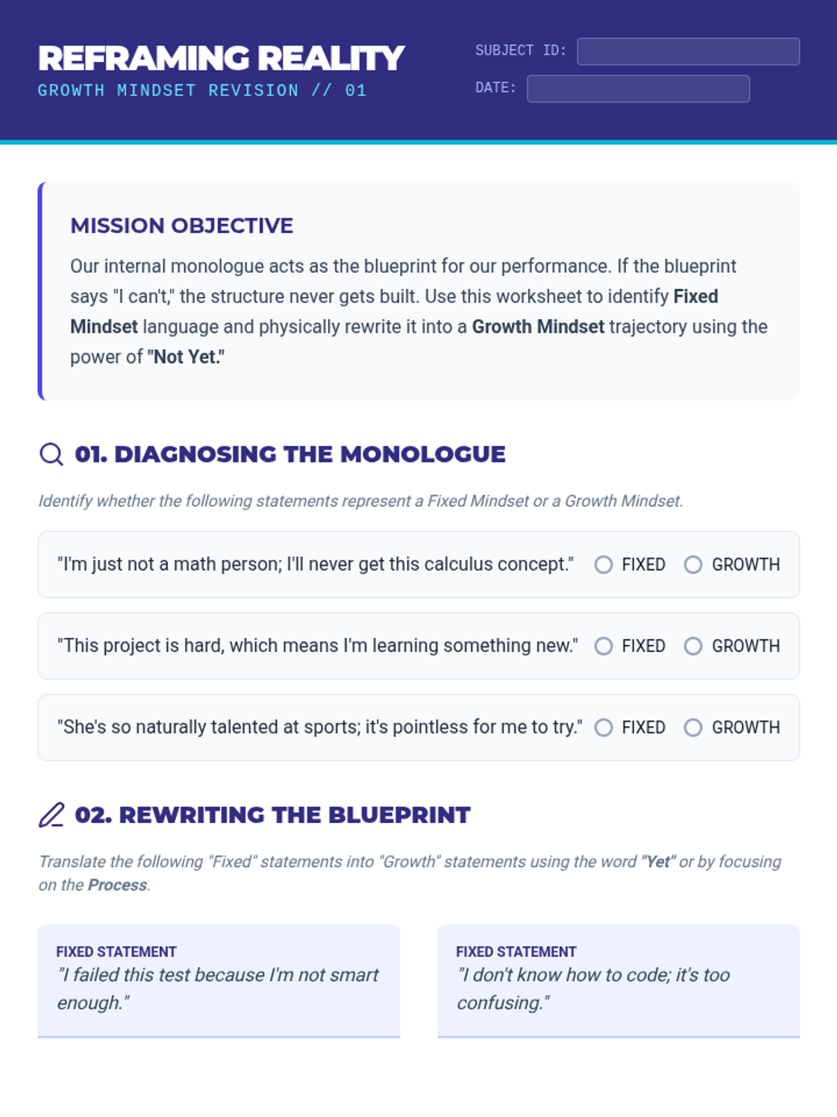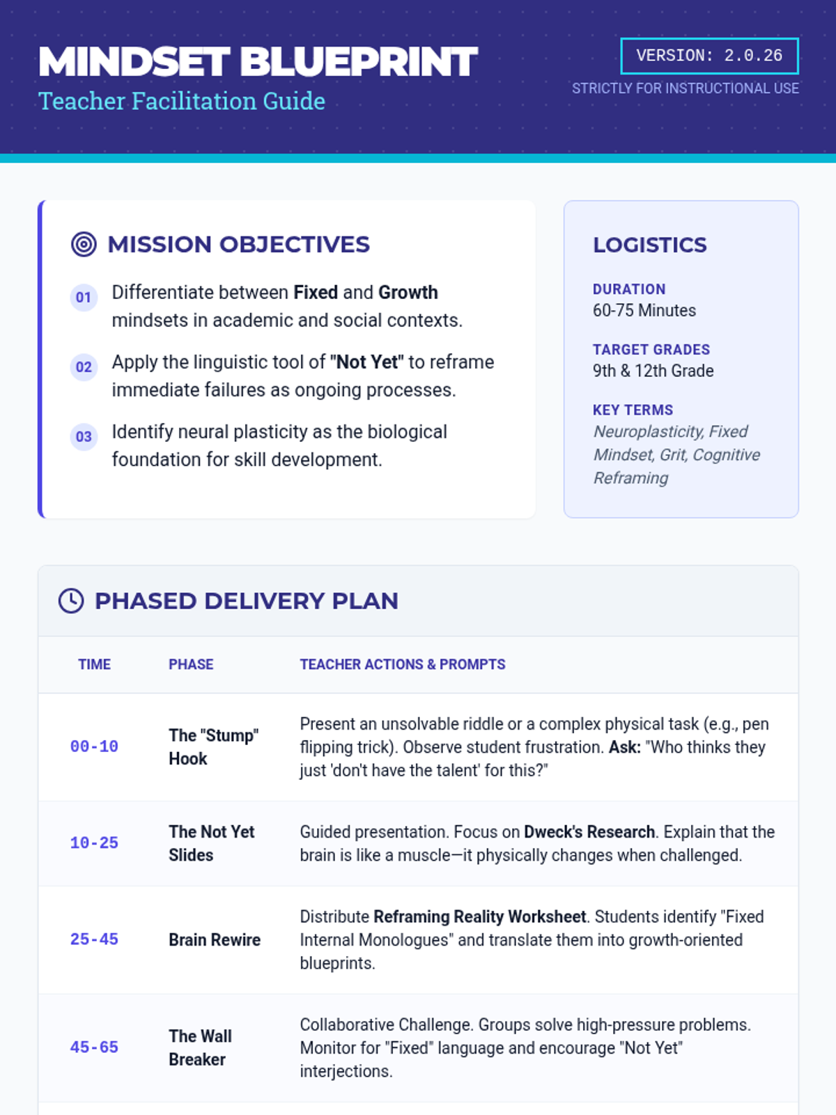 This lesson helps 9th and 12th-grade students transition from a fixed to a growth mindset by exploring the 'Power of Not Yet' through real-world examples, cognitive reframing, and collaborative challenges. Students will learn to see obstacles as structural components of success rather than dead ends.