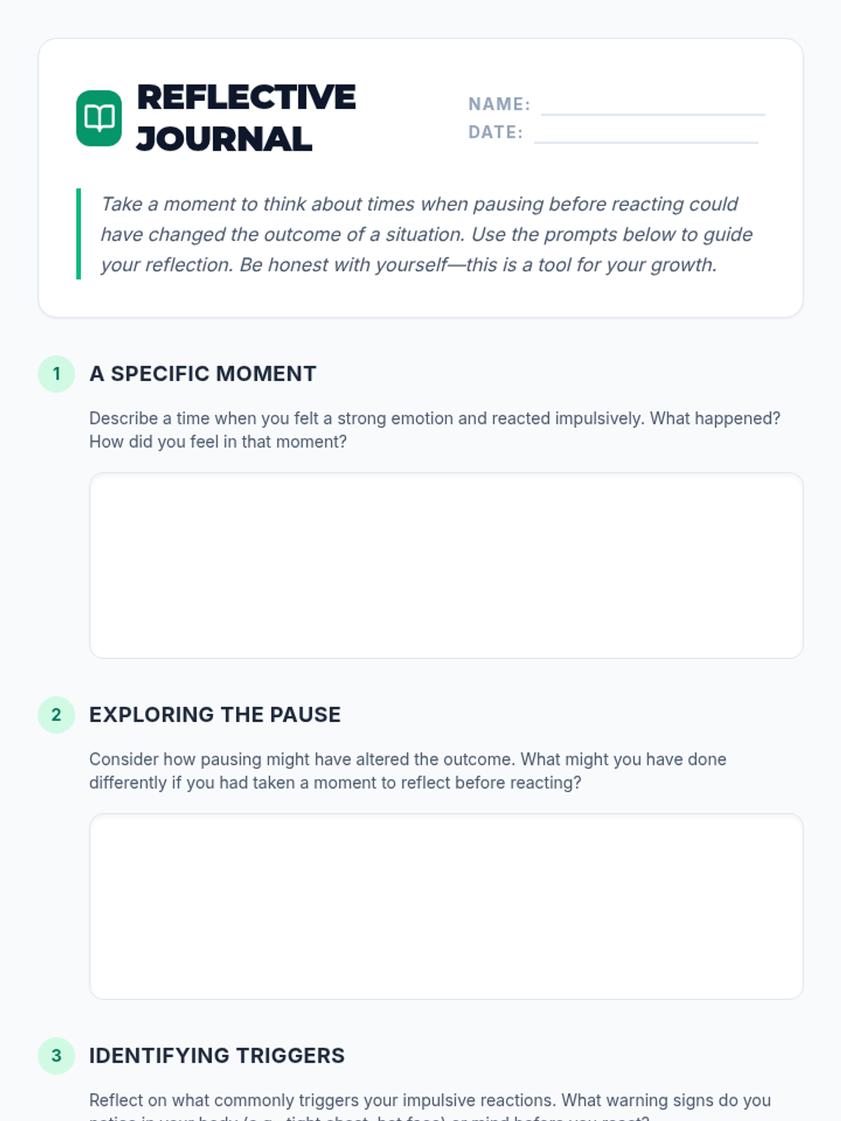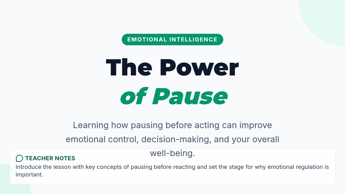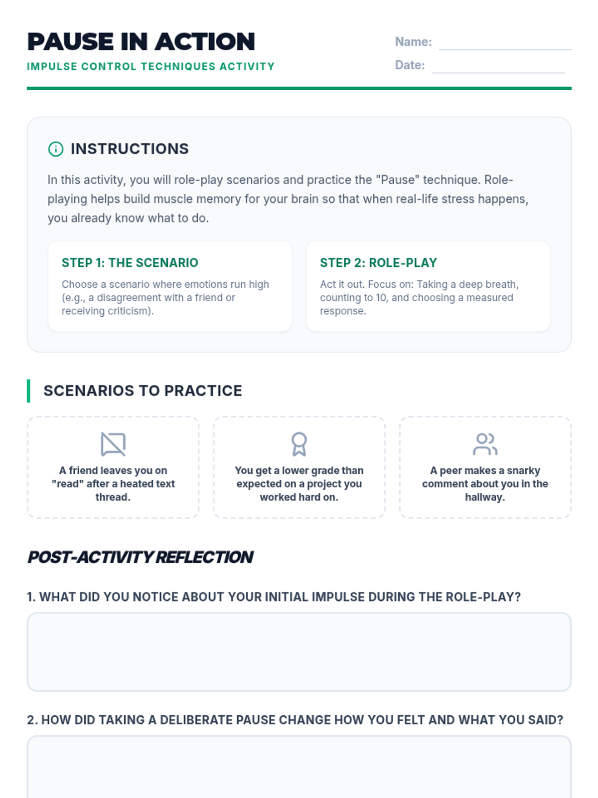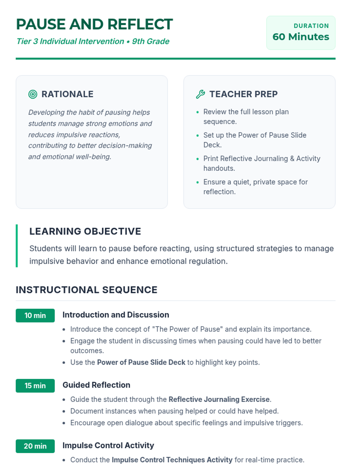 A Tier 3 individual lesson for 9th graders focused on emotional regulation and impulse control through the 'pause' technique. Students learn to recognize triggers and practice structured strategies to choose thoughtful responses over impulsive reactions.