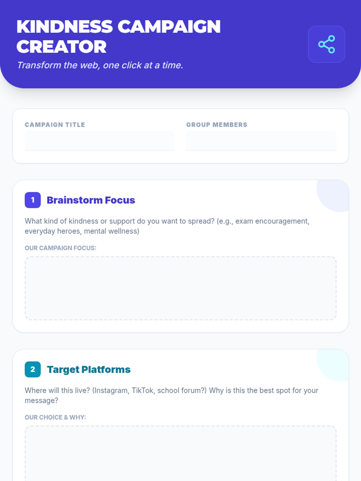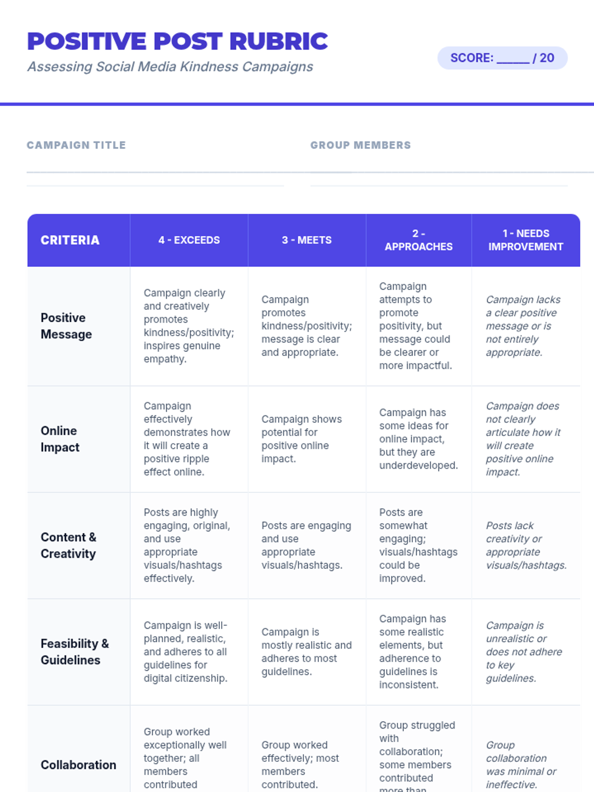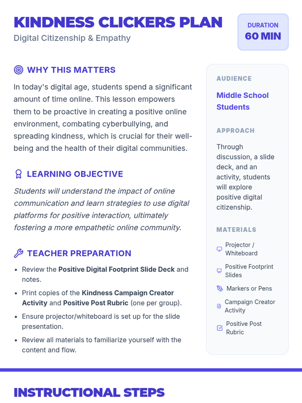 This lesson focuses on the impact of online communication and how to use digital platforms to spread kindness and support. Students will explore their digital footprint and design a social media campaign to foster an empathetic online community.