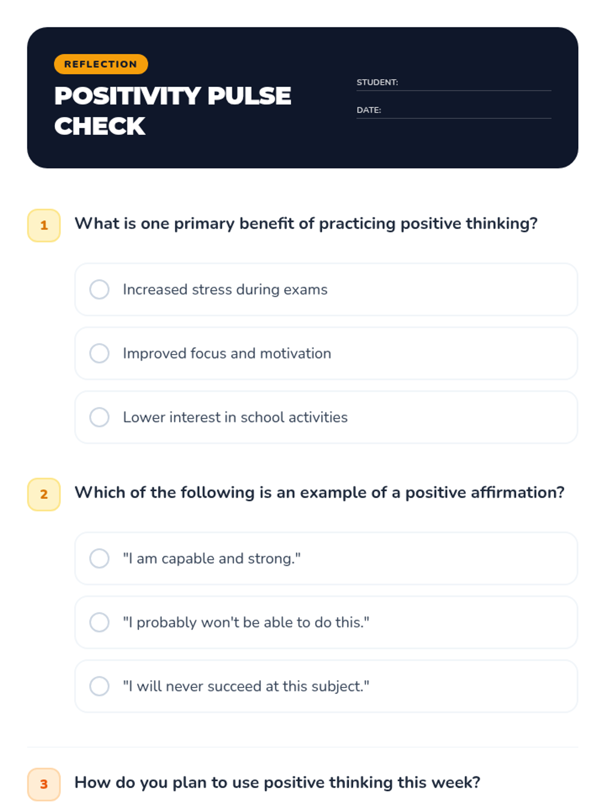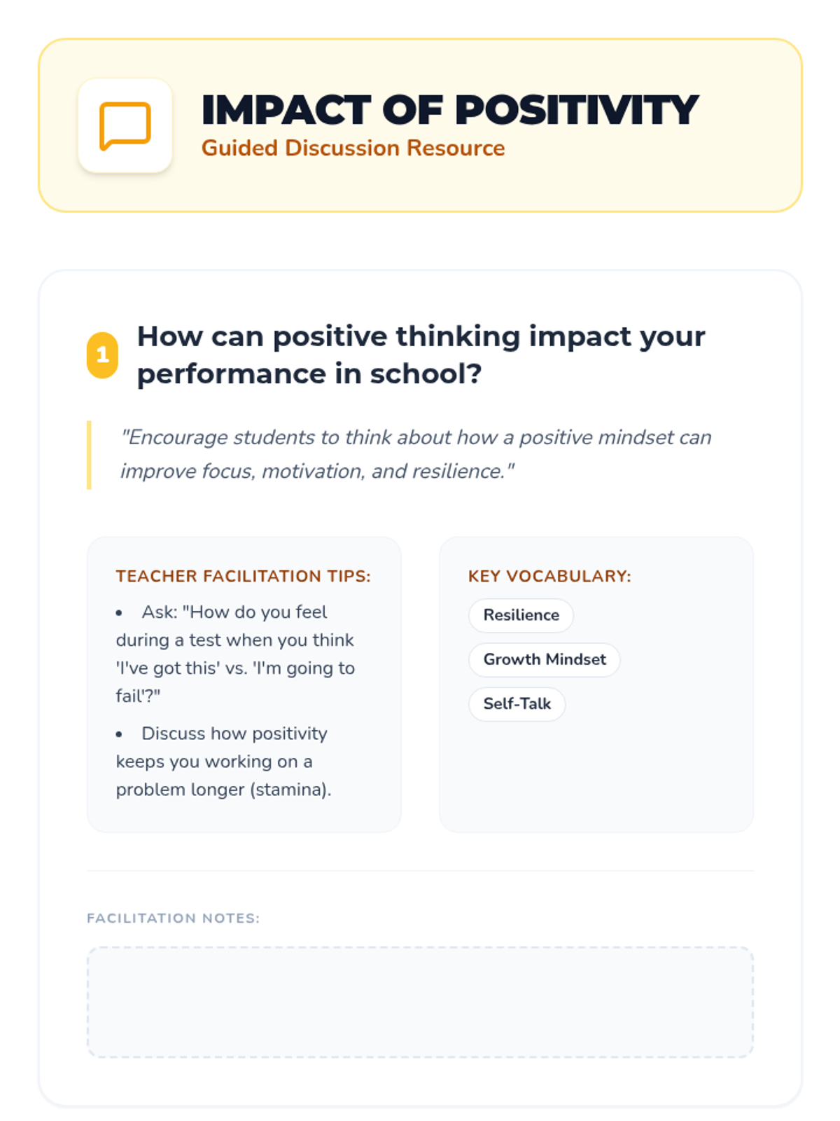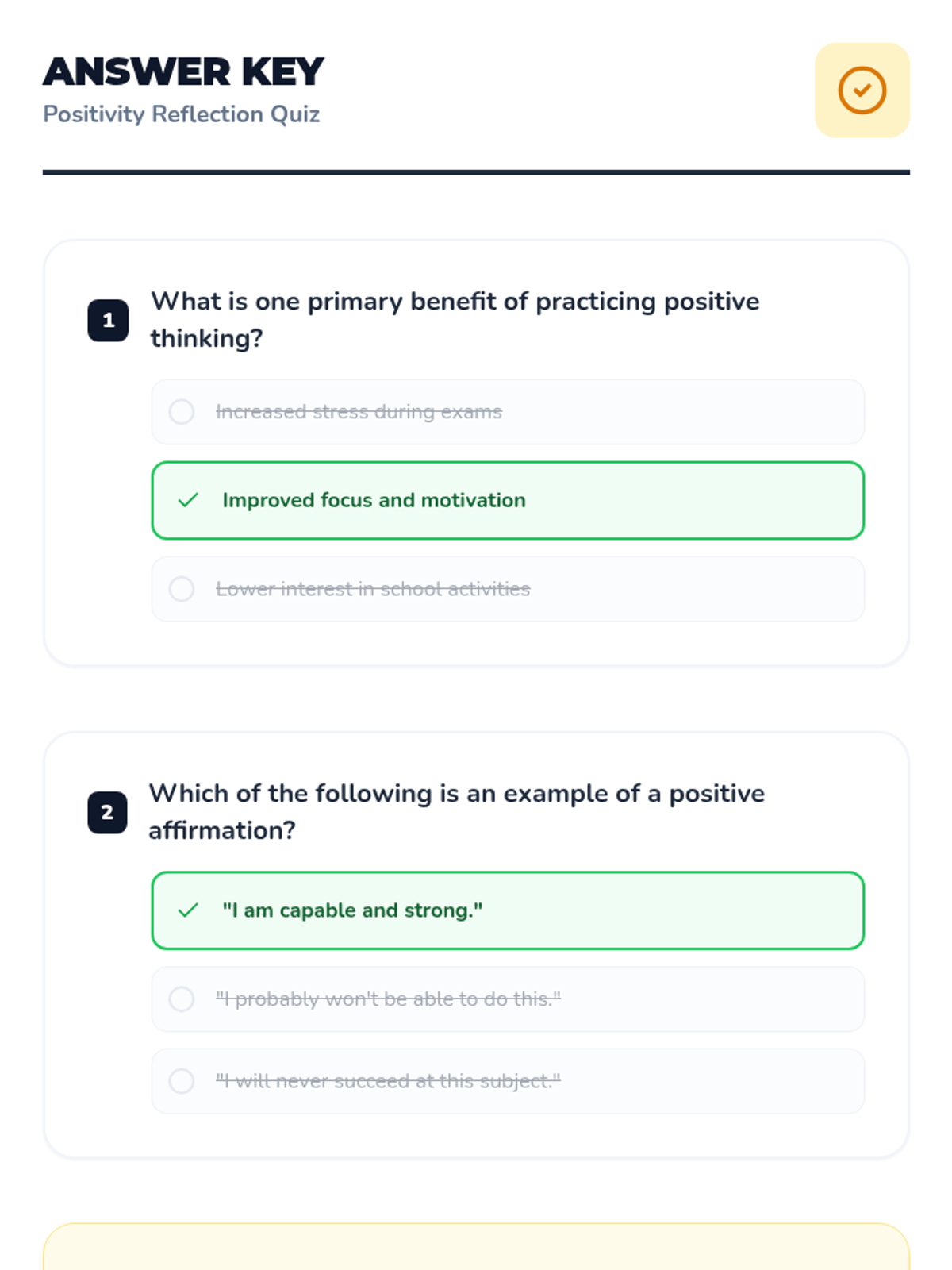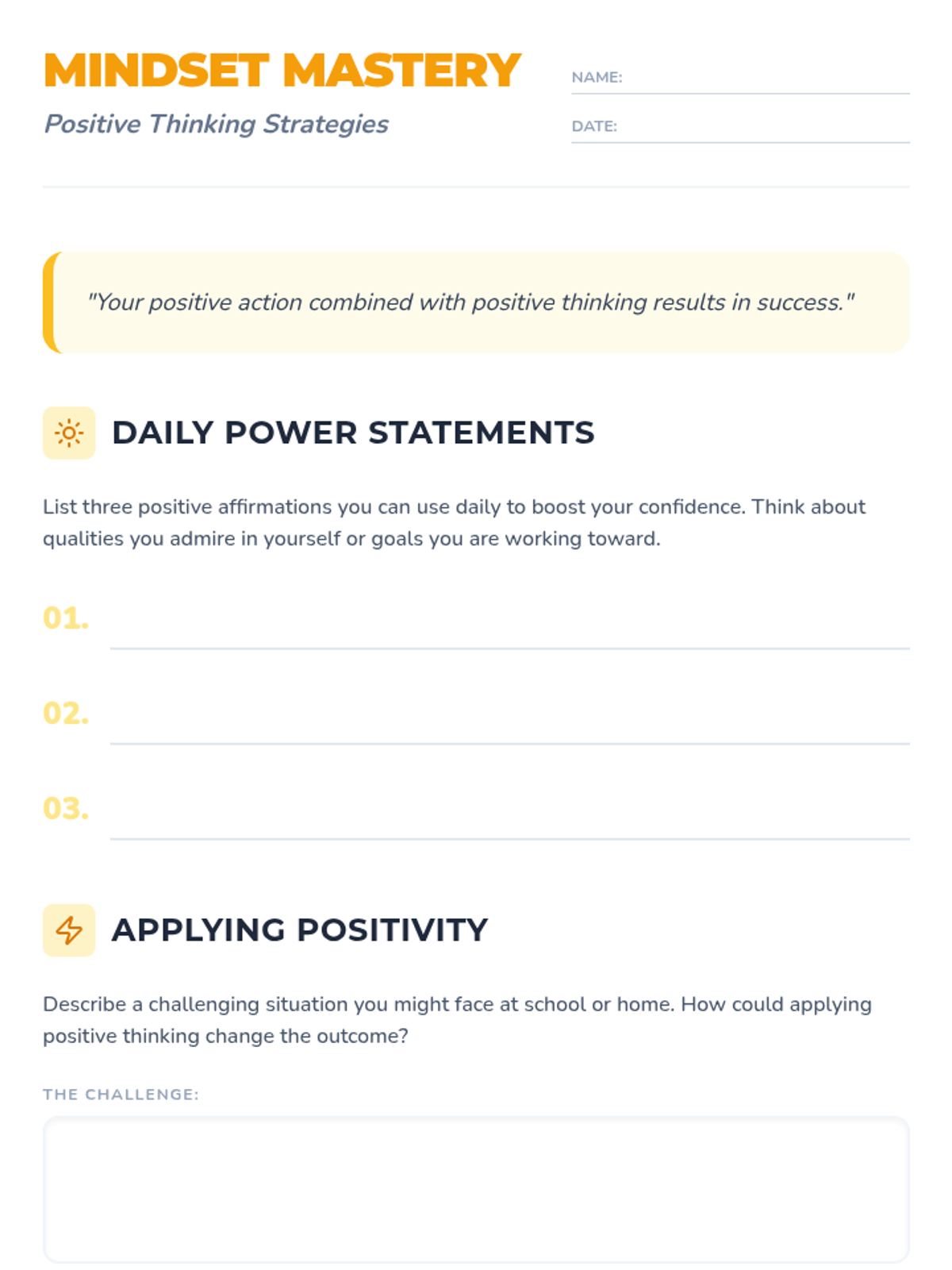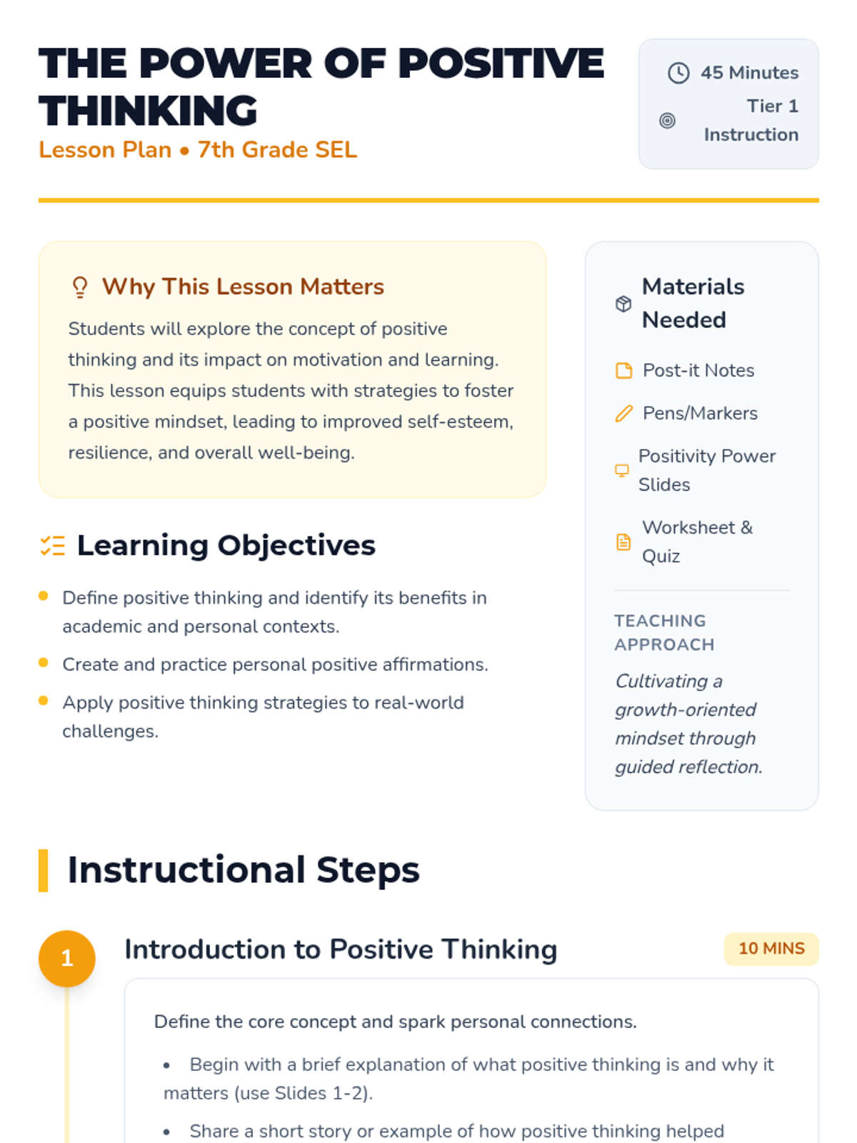A lesson for 7th graders exploring the concept of positive thinking, its impact on motivation, and strategies for cultivating a resilient mindset.