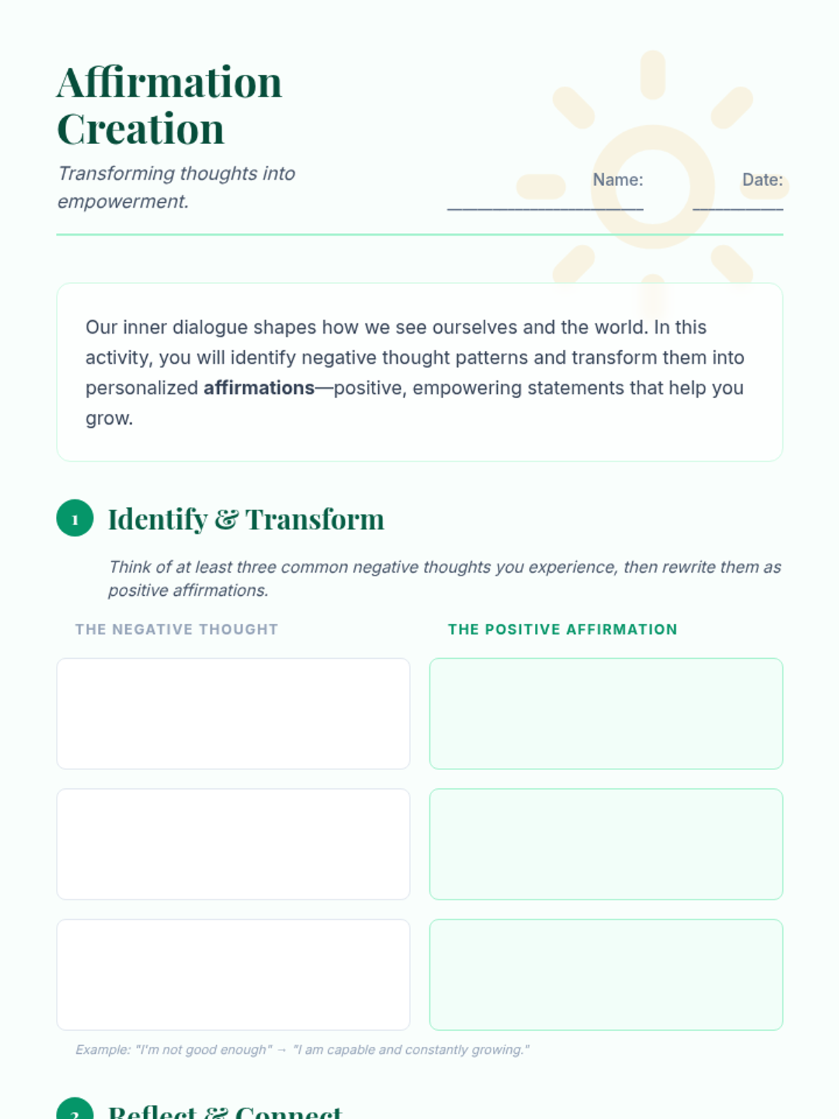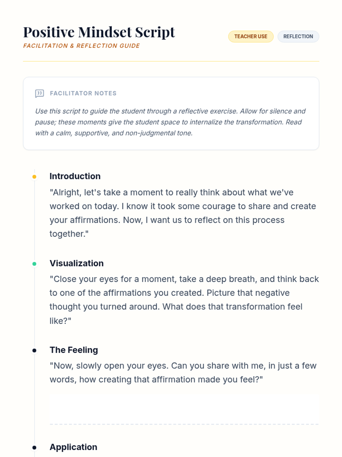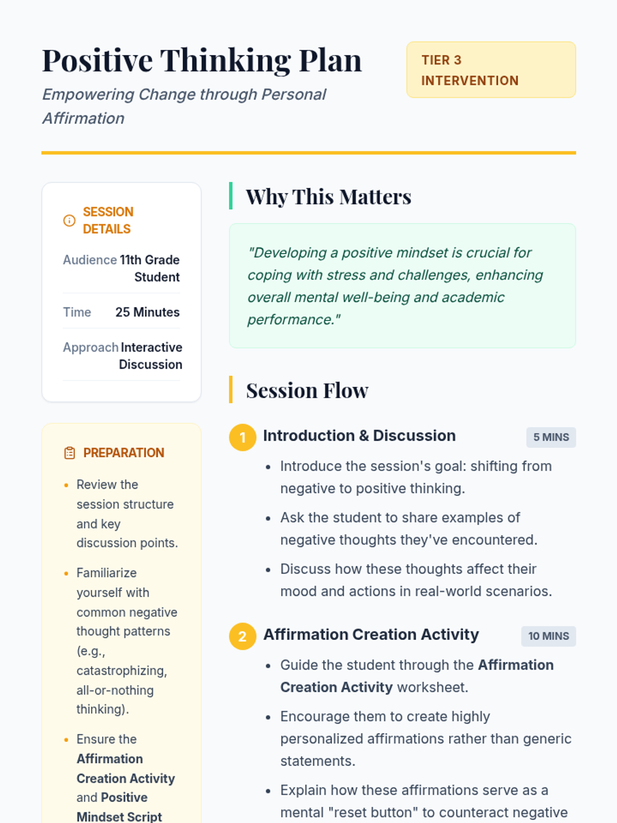 A Tier 3 one-on-one session for 11th-grade students focused on identifying negative thought patterns and replacing them with empowering positive affirmations to boost self-esteem and resilience.