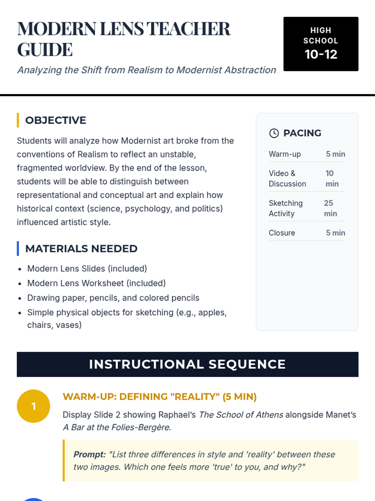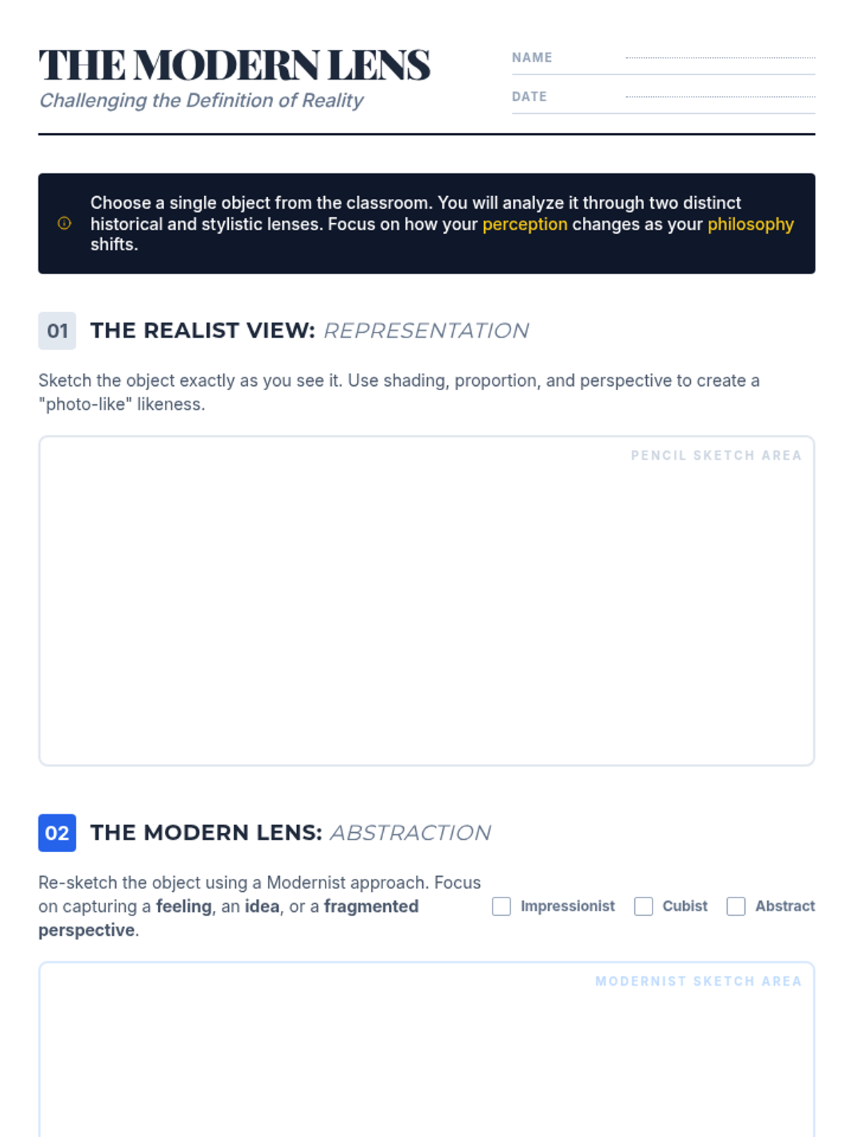 Students explore the shift from Realism to Modernism in art, analyzing how cultural and scientific upheavals at the turn of the 20th century transformed the definition of 'reality.' through sketching and analysis.