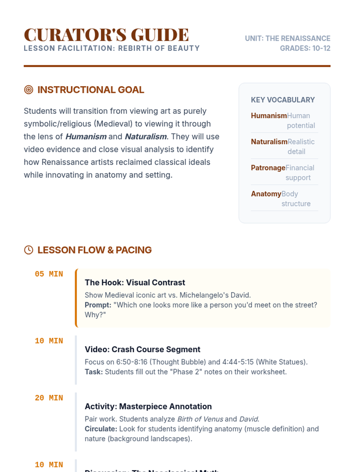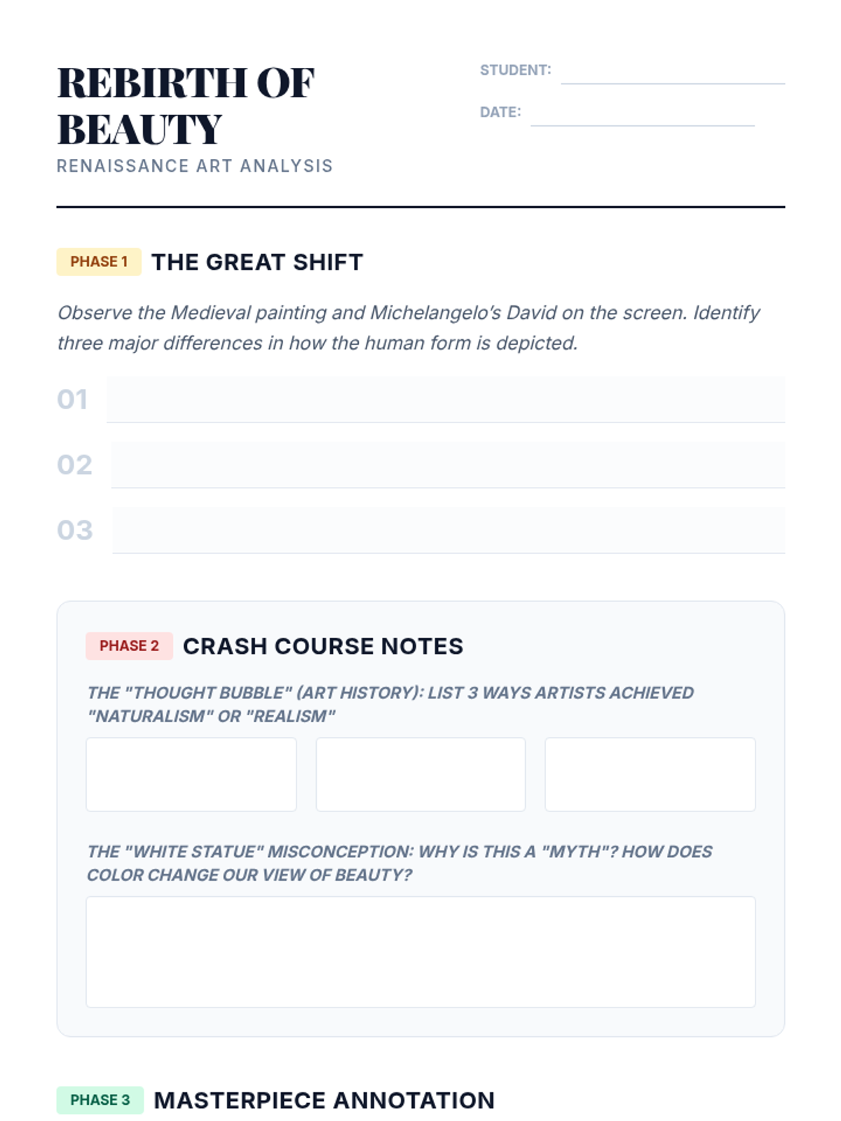 Students will explore the shift from Medieval to Renaissance art by analyzing Botticelli and Michelangelo. The lesson focuses on identifying Humanism, Naturalism, and the 'White Statue' misconception using a Crash Course video and hands-on annotation.