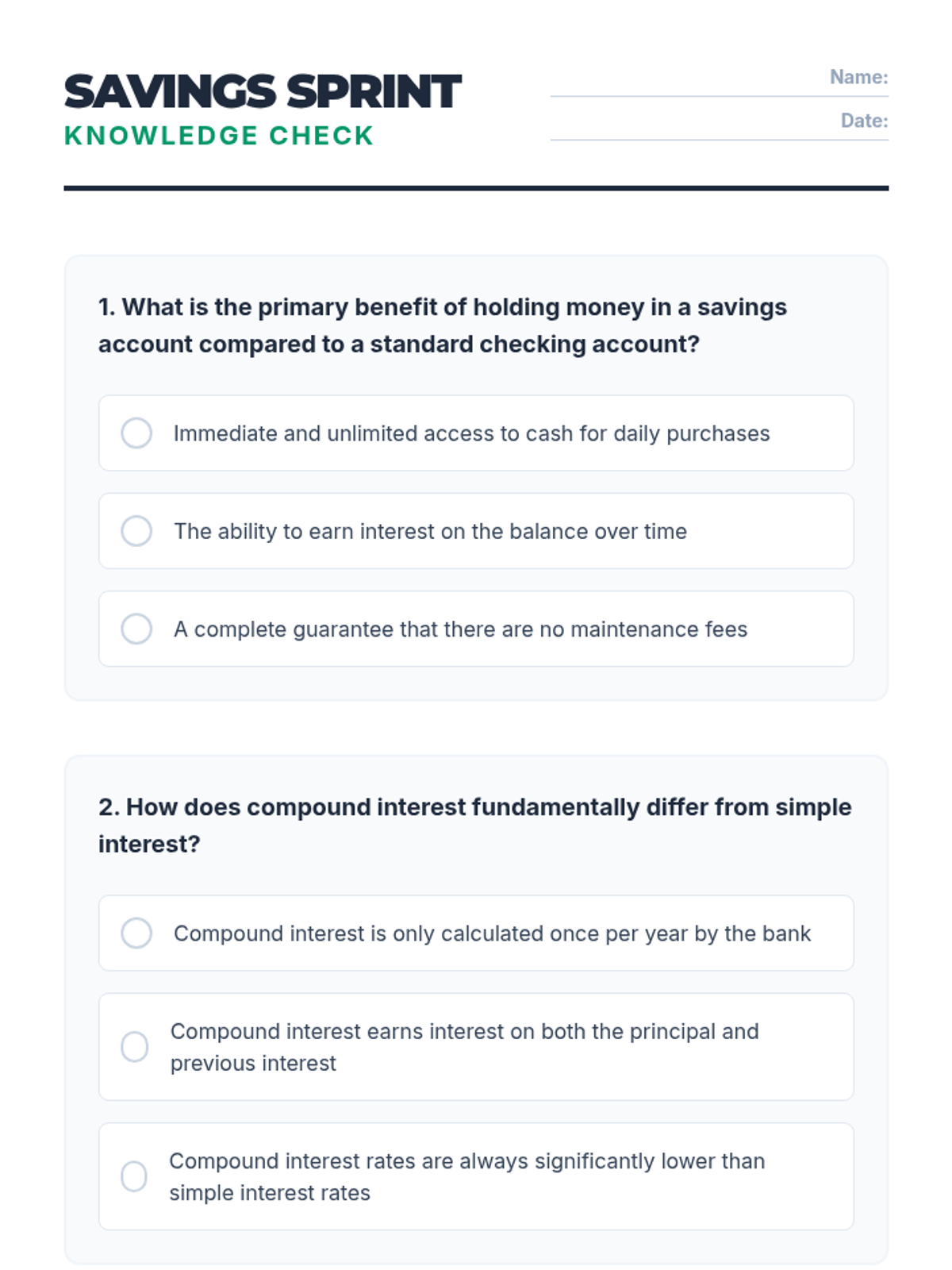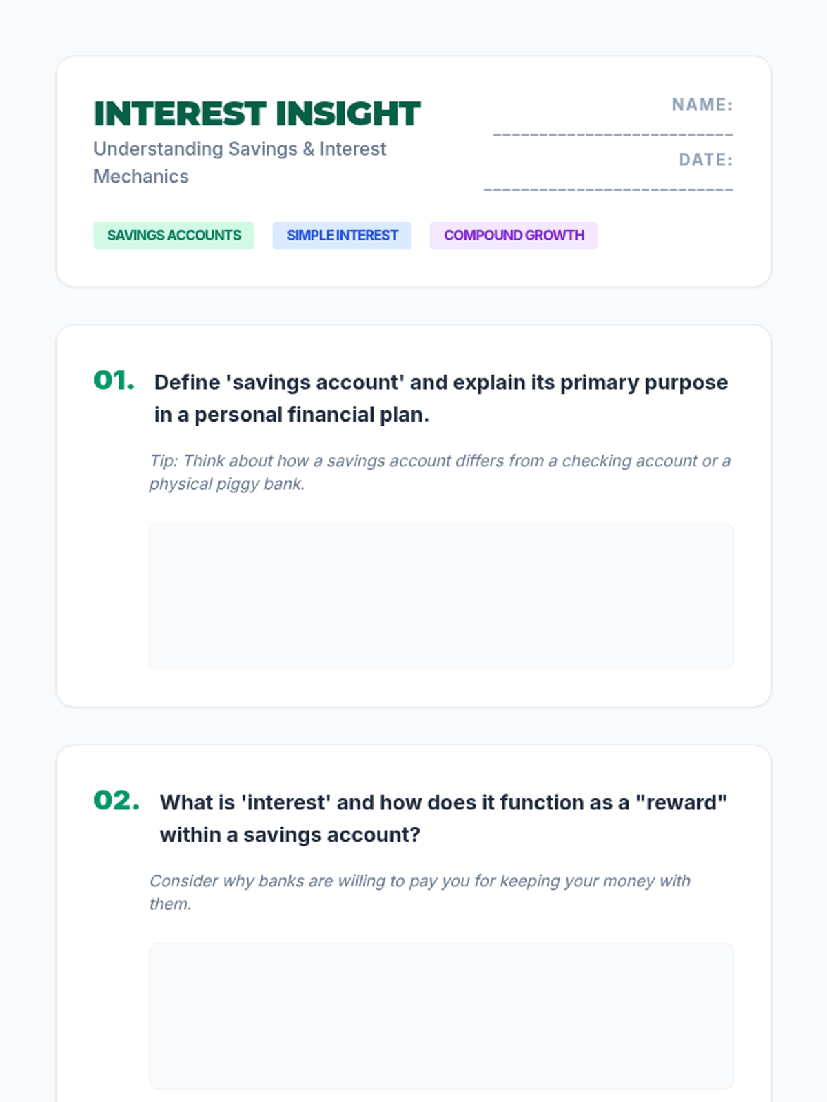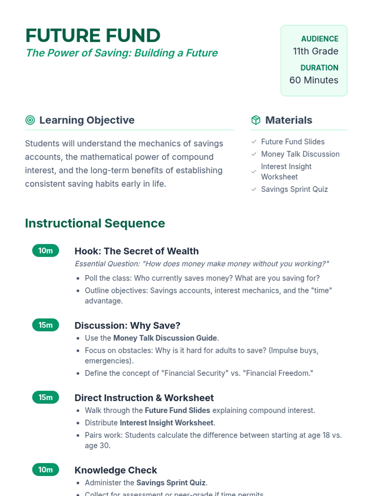 This lesson introduces 11th-grade students to the concept of saving money, focusing on savings accounts, interest, and the benefits of starting to save early. students will be better equipped to make informed financial decisions that lead to long-term financial security.