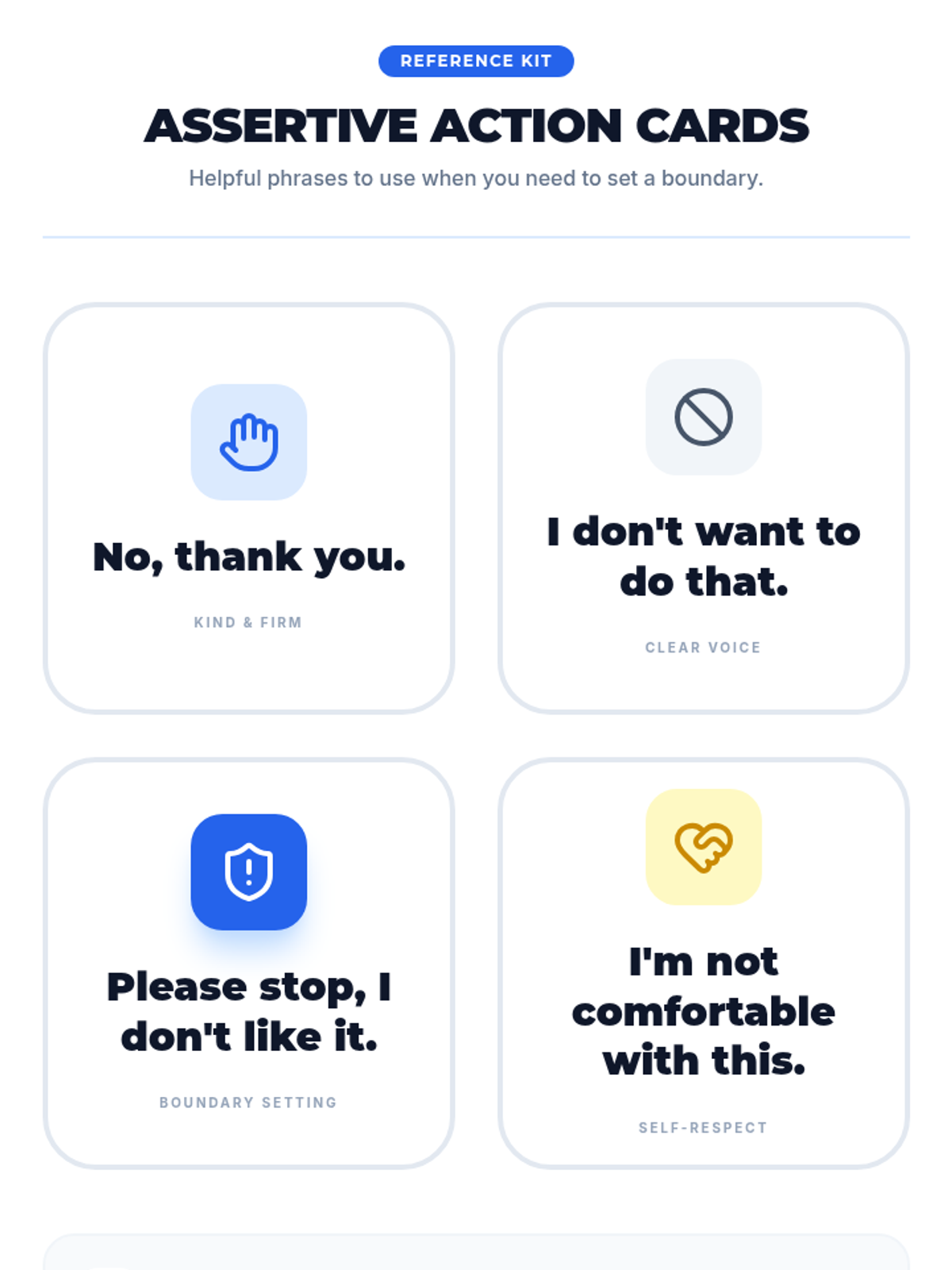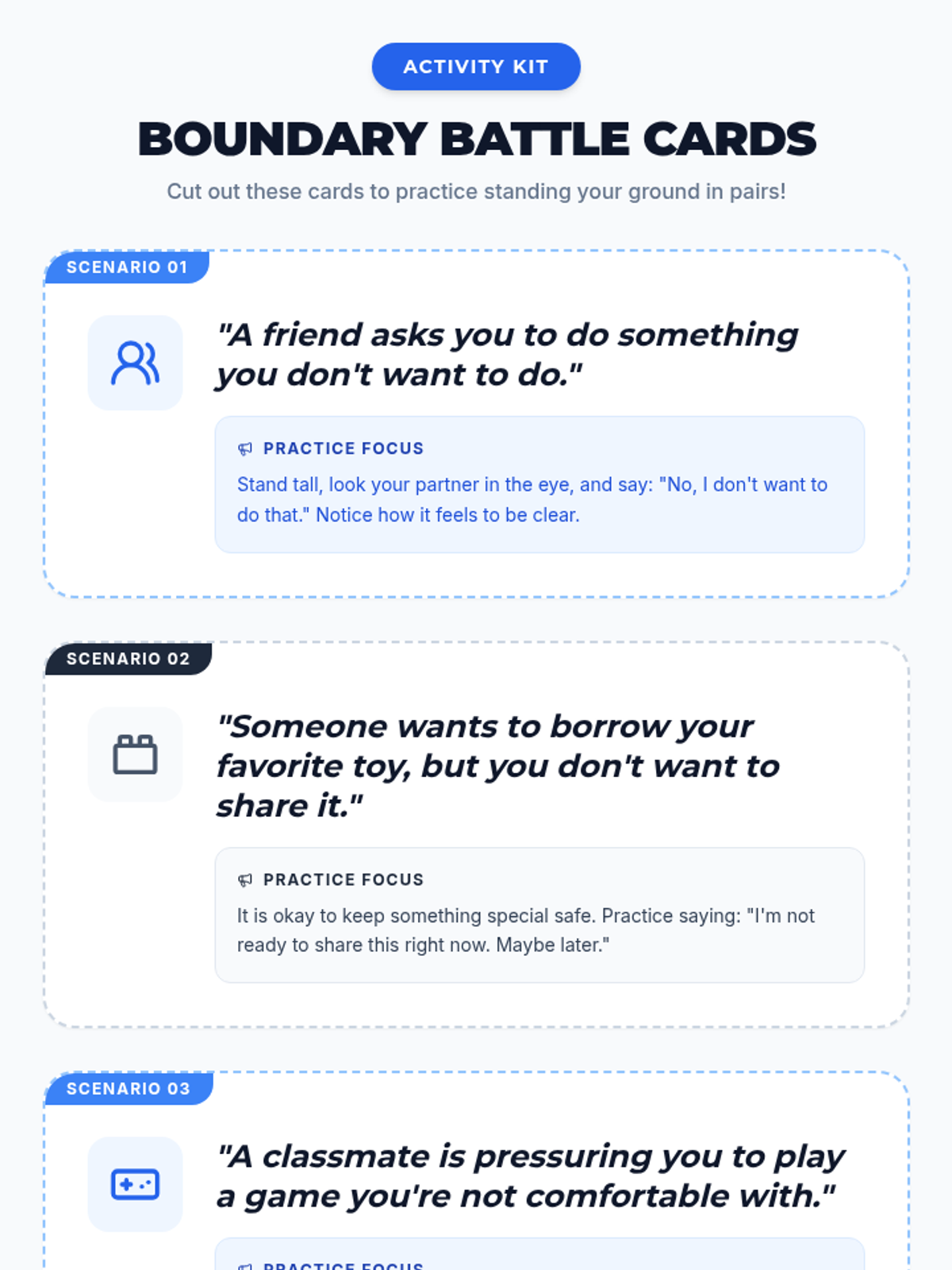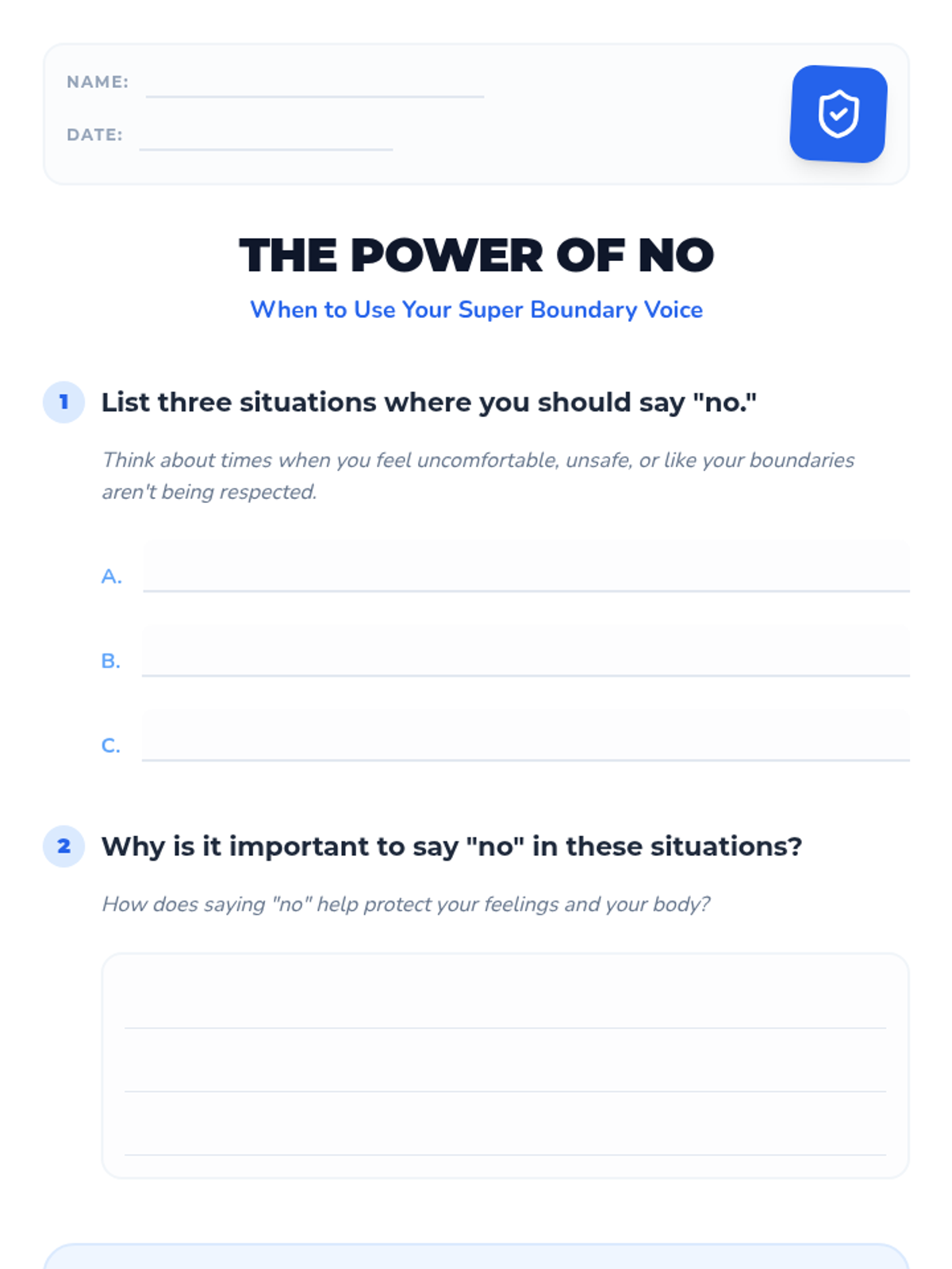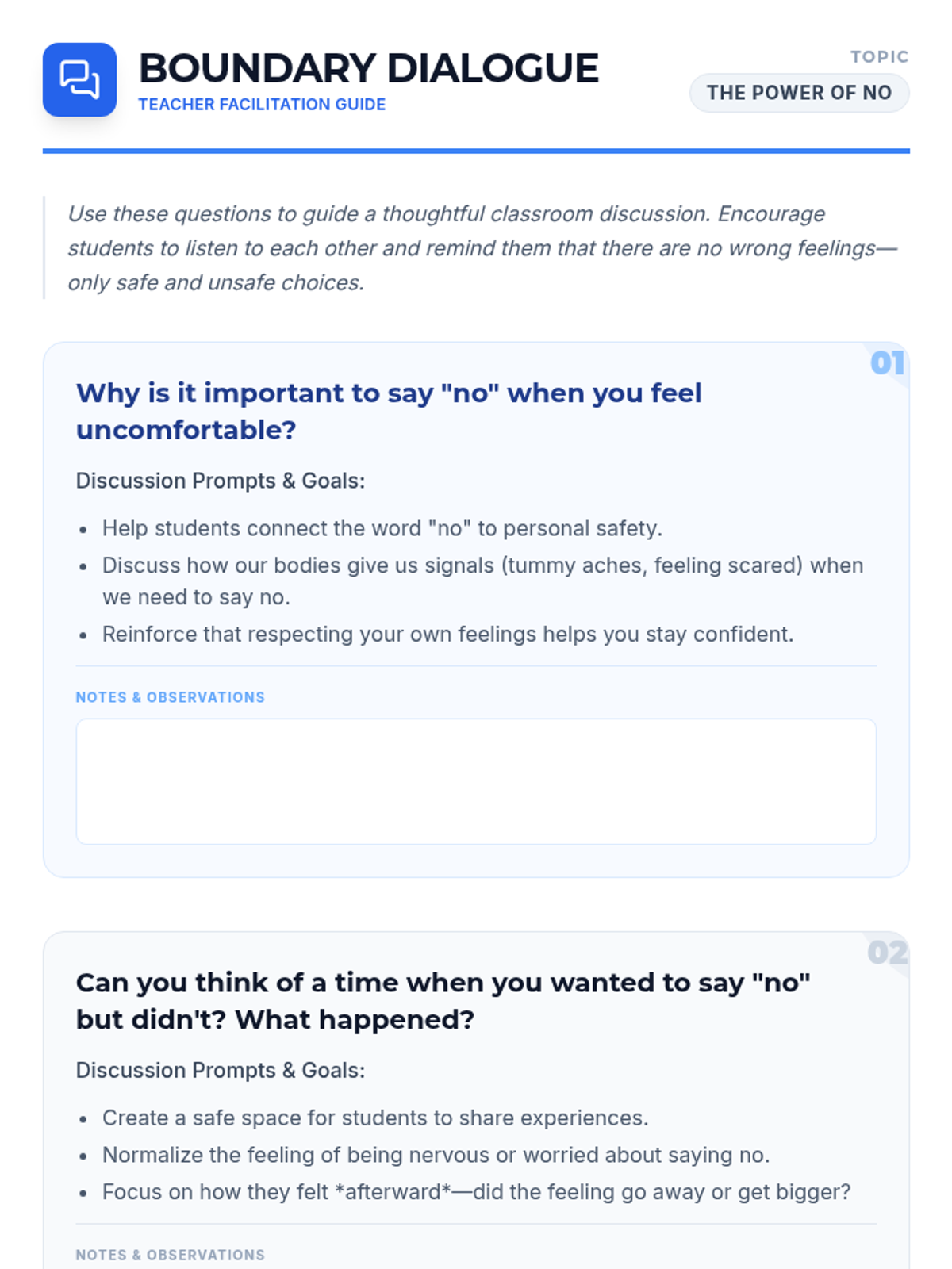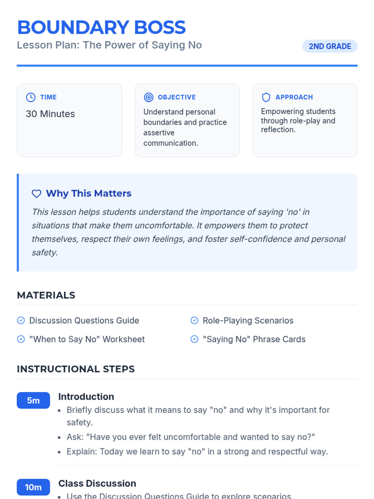 A social-emotional learning lesson for 2nd graders focused on personal boundaries, assertive communication, and the importance of saying 'no' in uncomfortable situations.