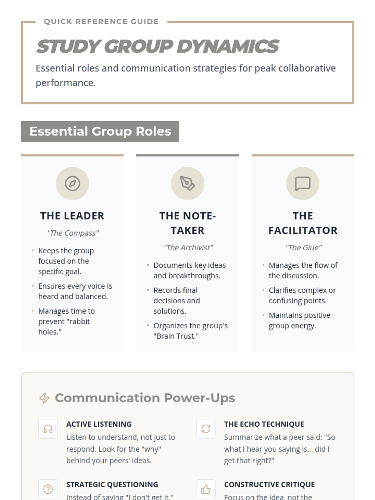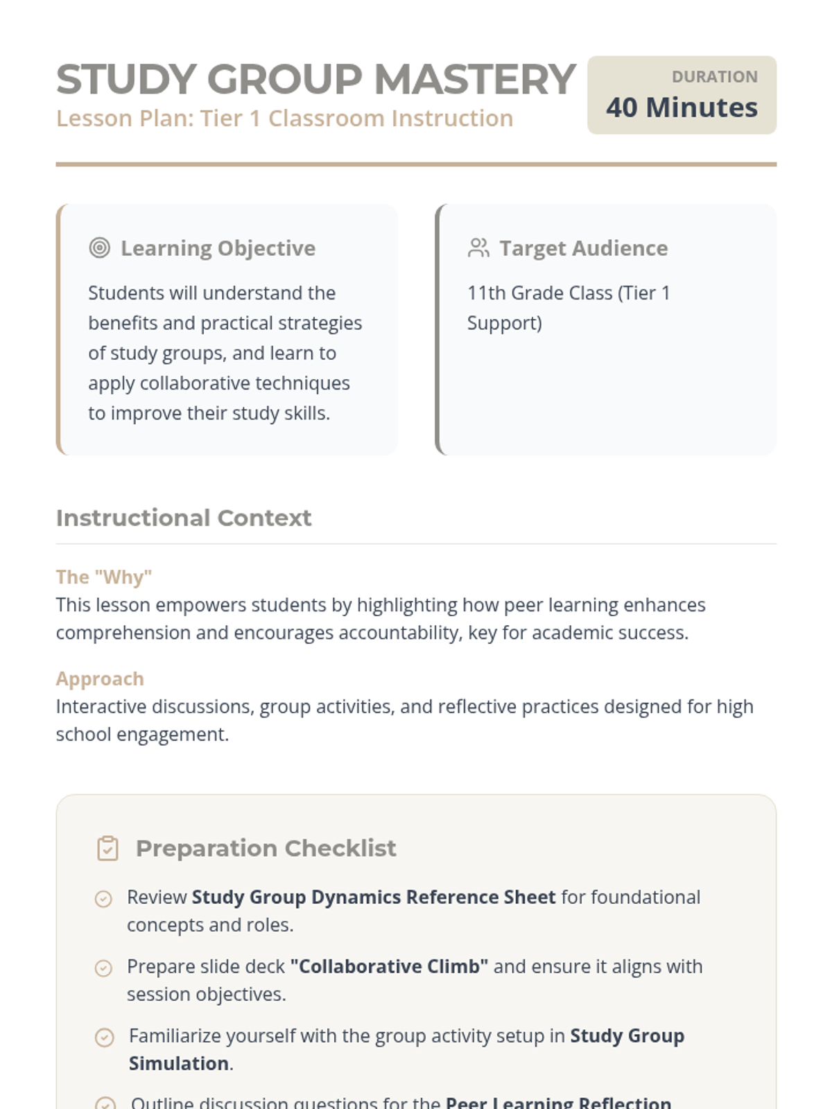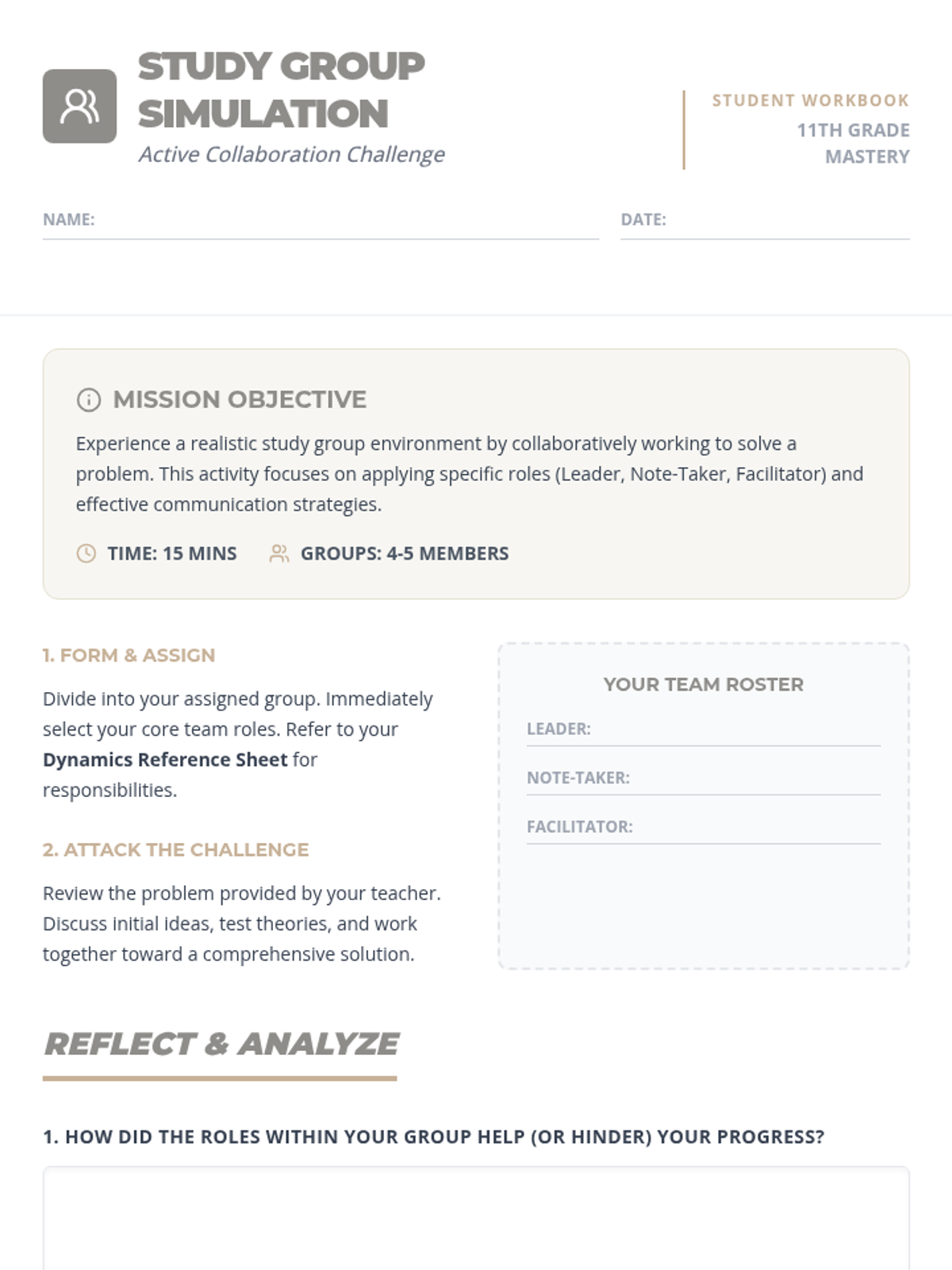 A lesson for 11th-grade students to master the art of collaborative learning, focusing on study group roles, communication strategies, and practical application.