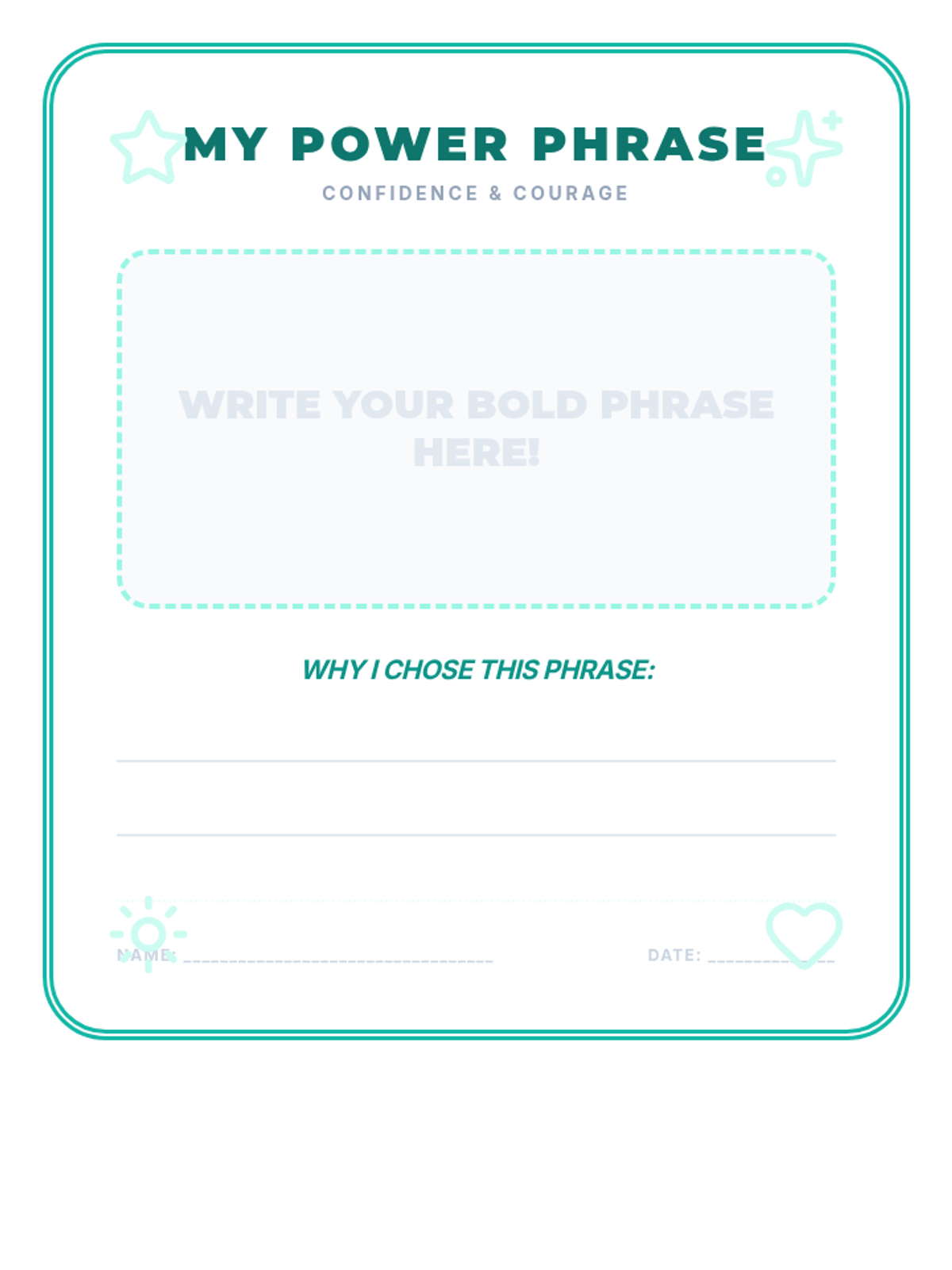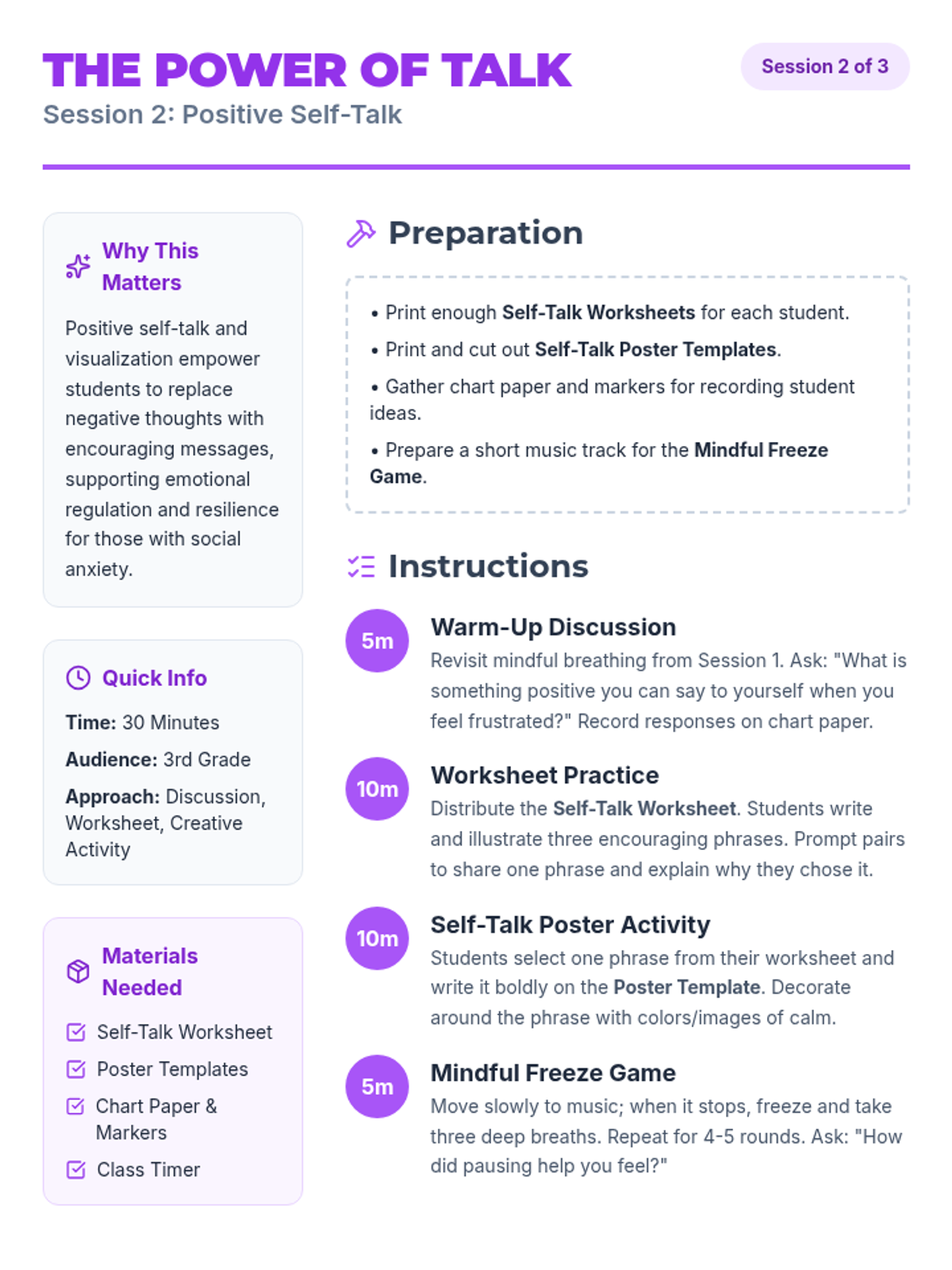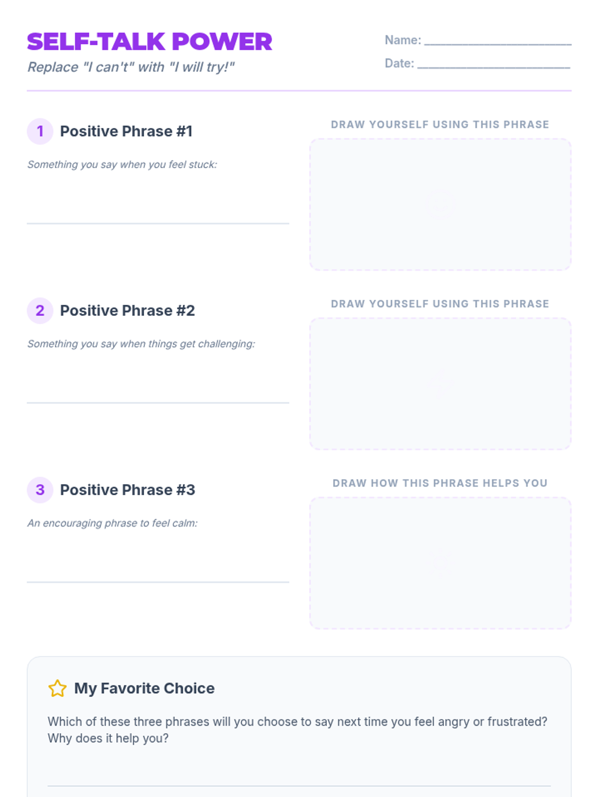 Students develop positive self-talk phrases and visualization techniques to replace negative thoughts with encouraging messages during challenging tasks.
