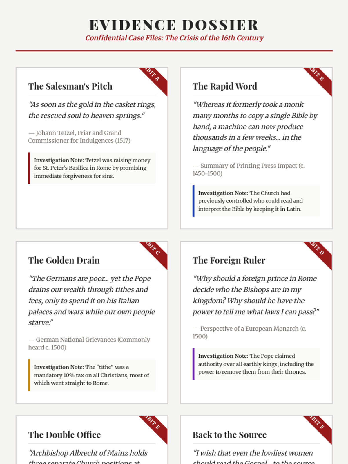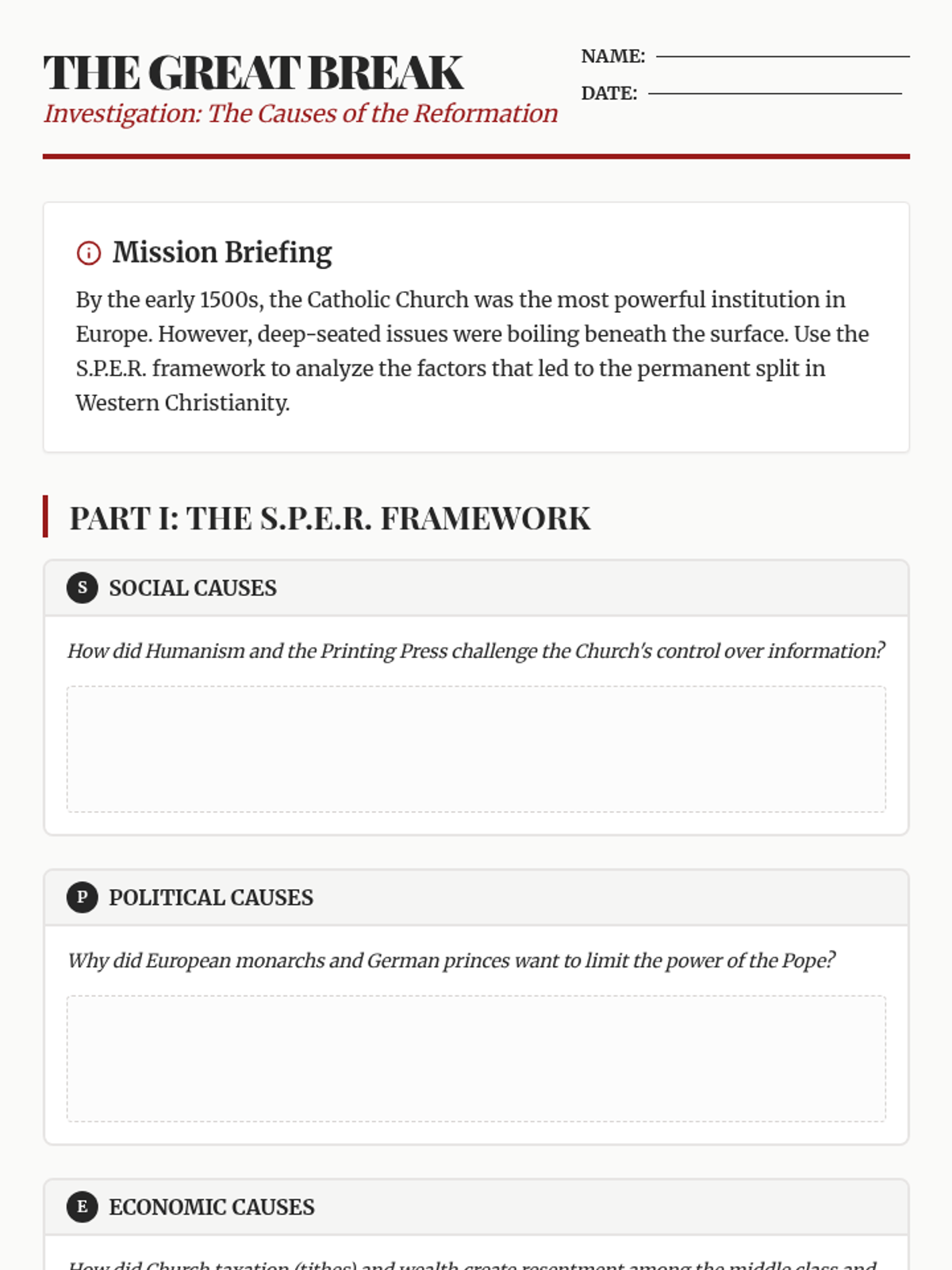 An investigation into the social, political, economic, and religious causes of the Protestant Reformation, focusing on the corruption within the Catholic Church and the impact of the Printing Press.