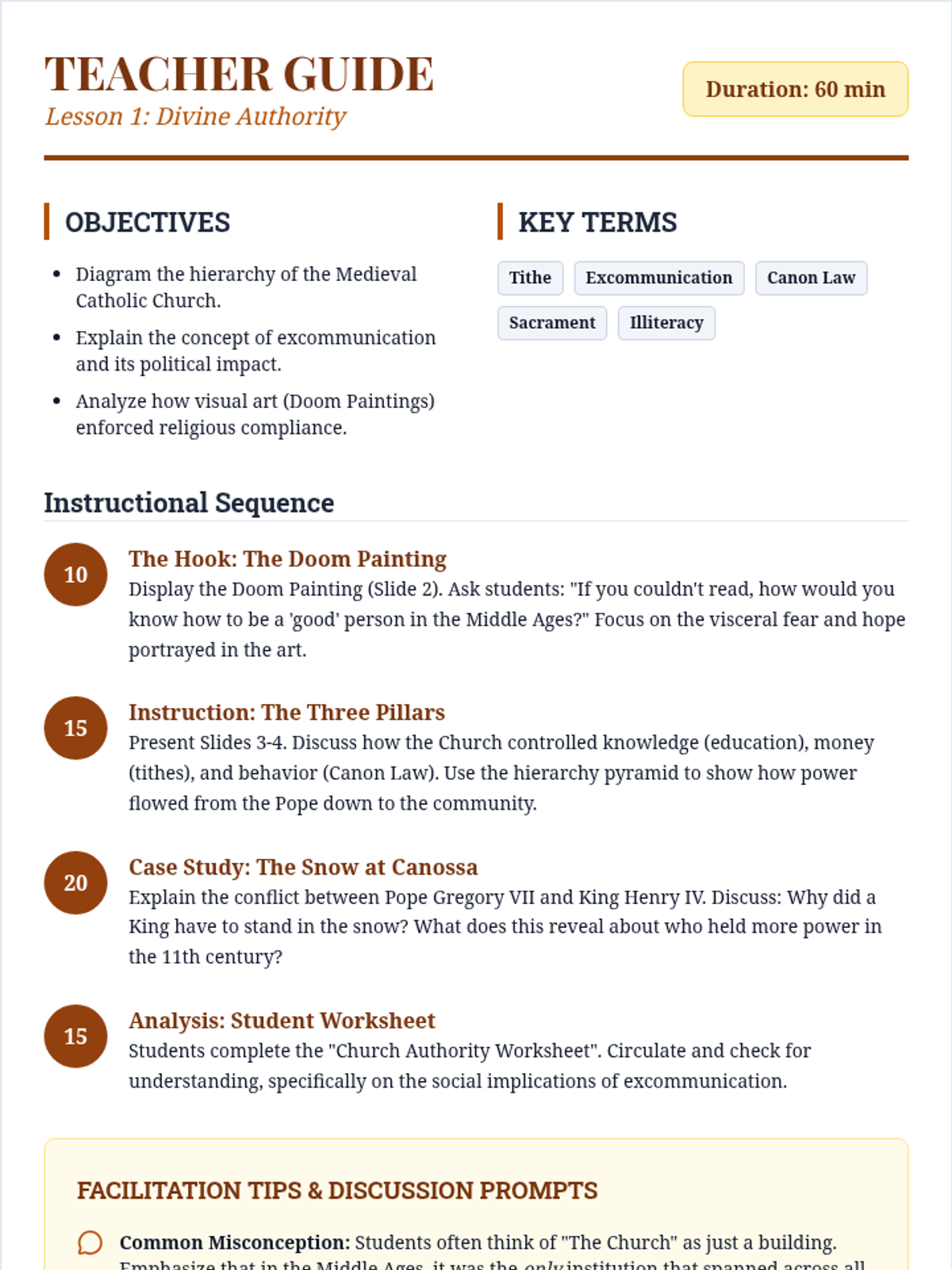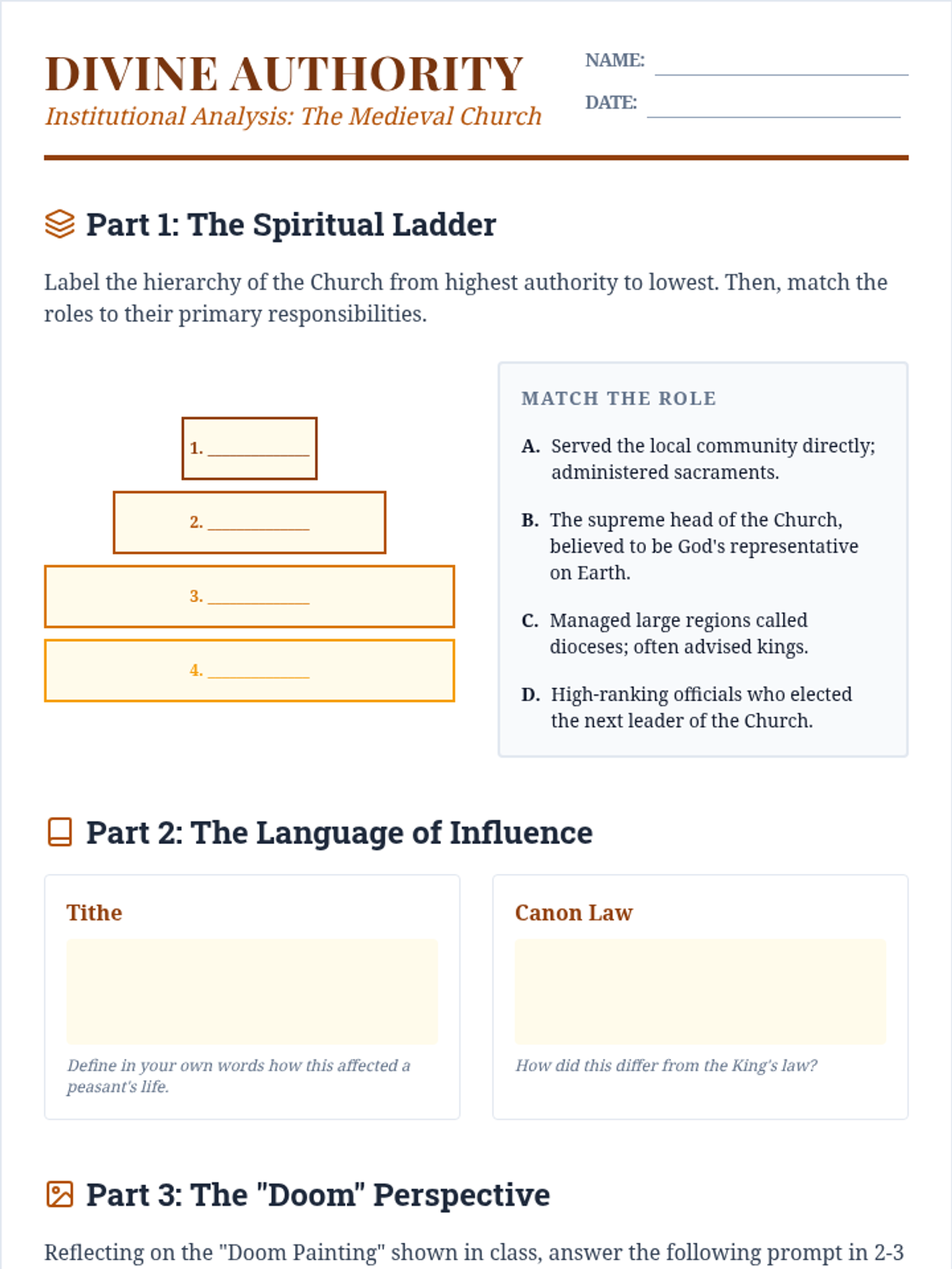Students examine the hierarchy and pervasive influence of the Catholic Church in daily life and politics. Through the analysis of 'Doom Paintings' and institutional structures, they understand how the Church served as a unifying and governing force in Medieval Europe.