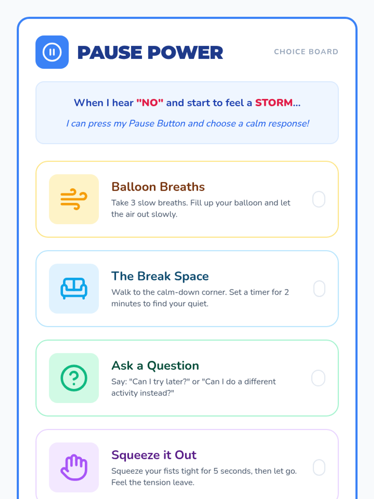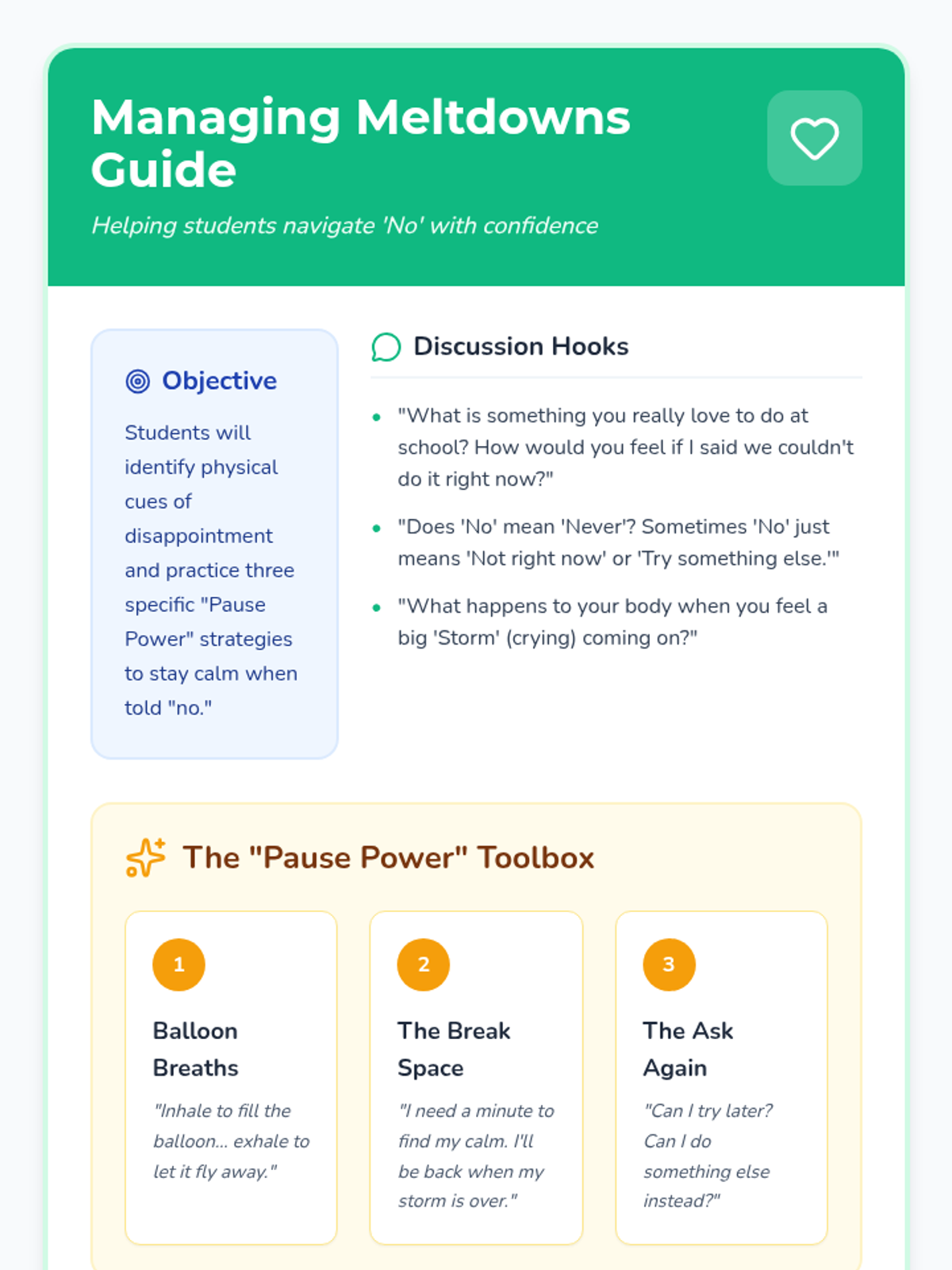 A social-emotional learning lesson focused on helping students manage disappointment and respond constructively when told 'no'. Through a relatable story and visual strategies, students learn to use a 'pause button' to choose calm responses like deep breathing and taking breaks.