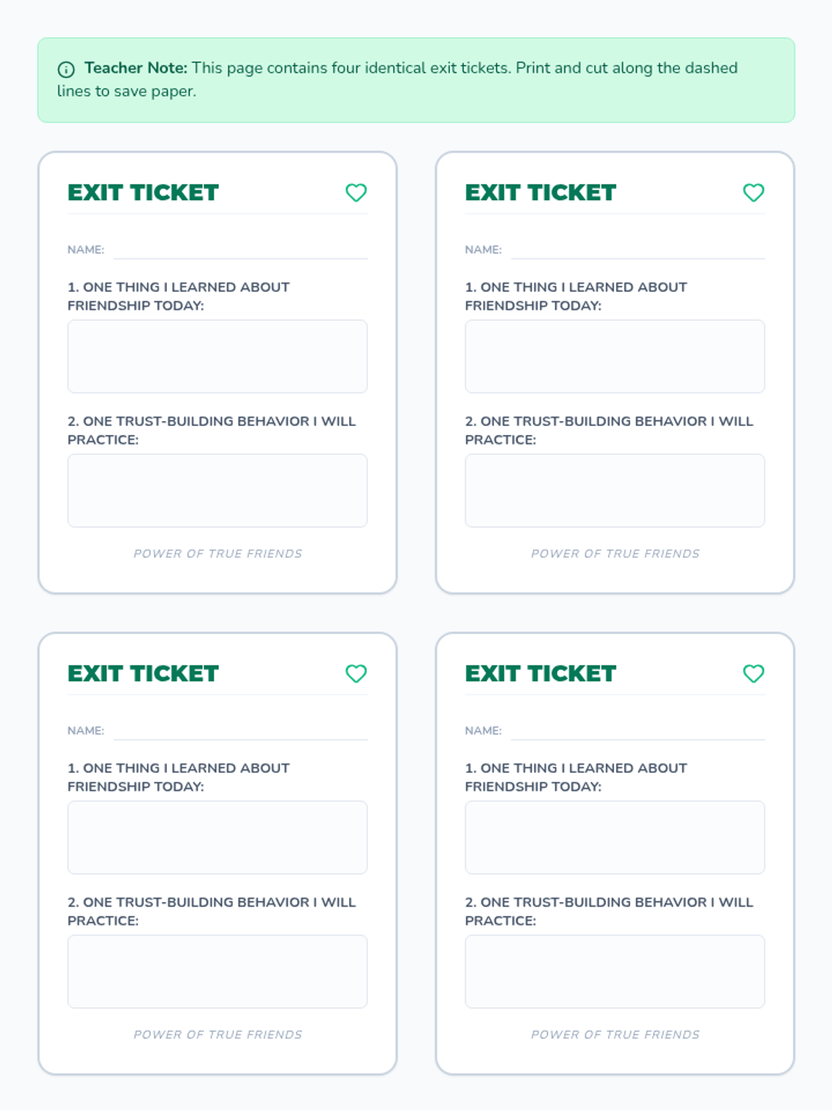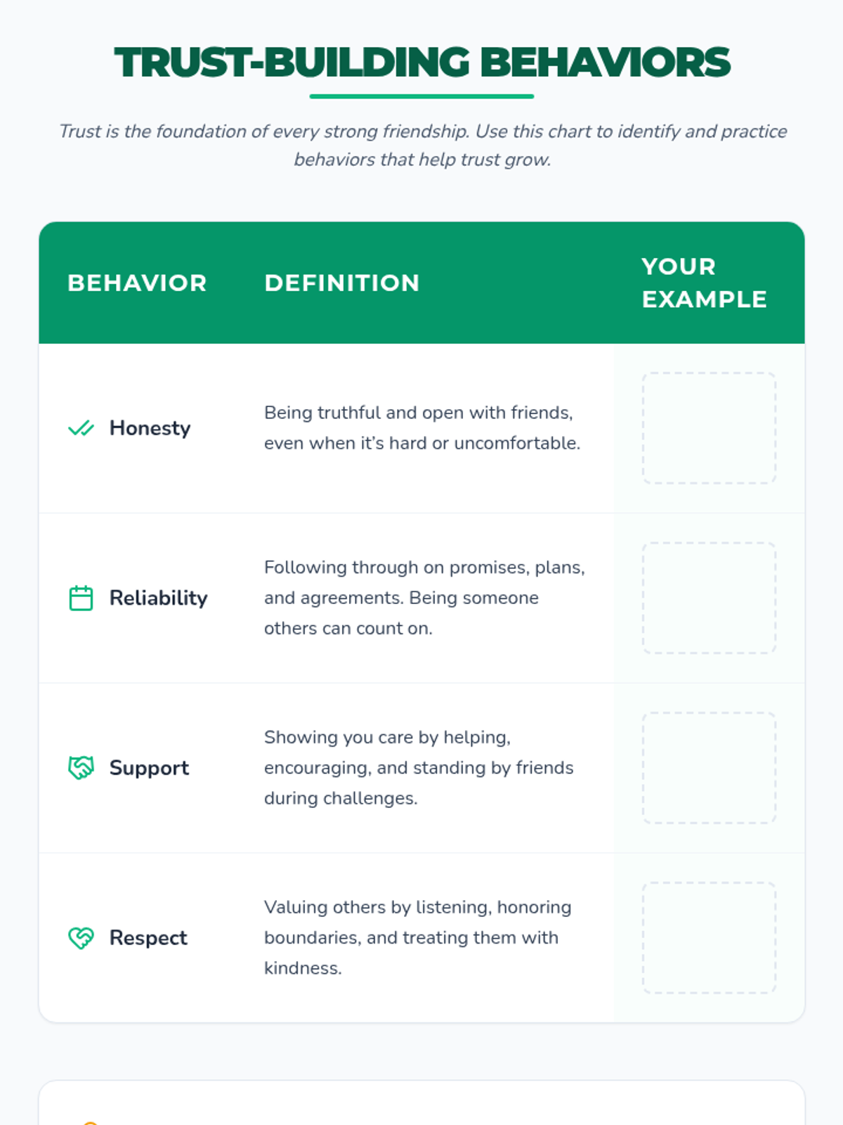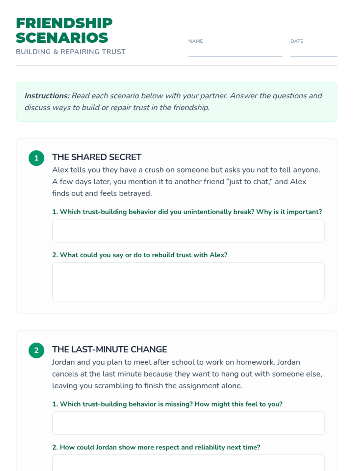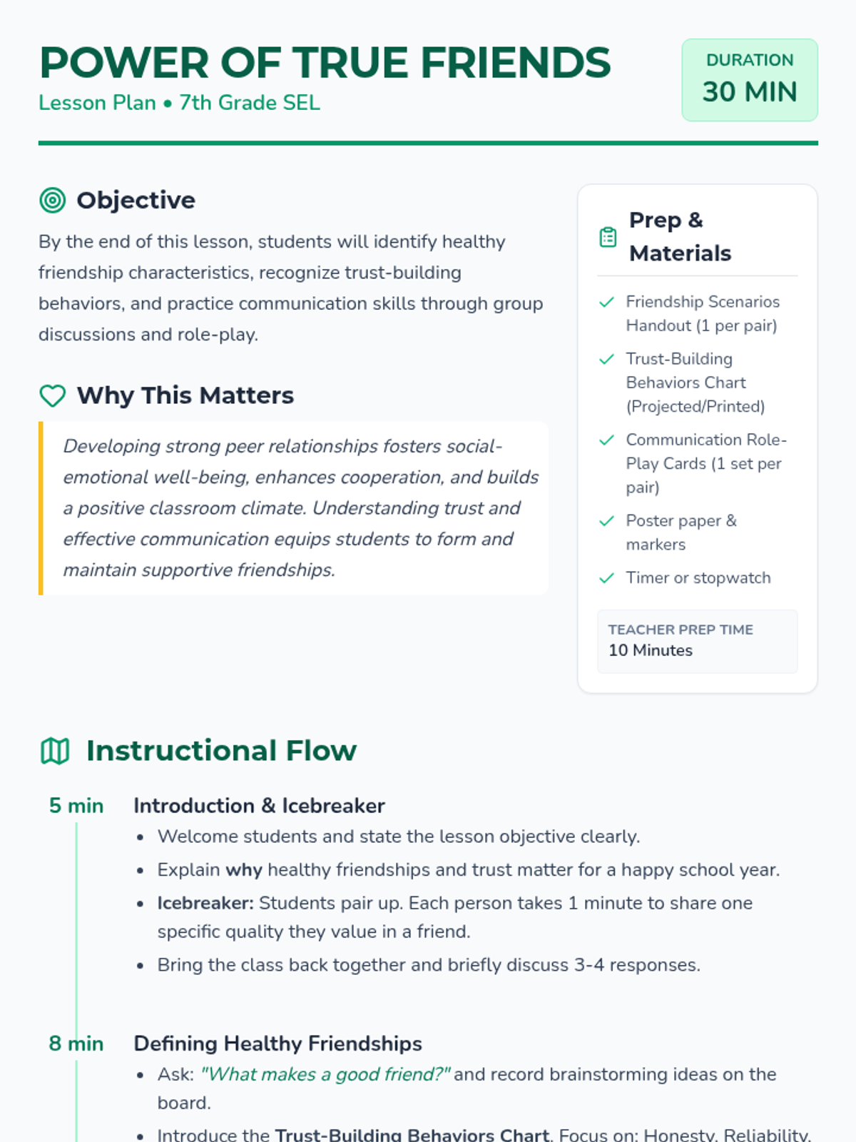 In this 30-minute, one-session lesson, 7th graders explore the nature of healthy friendships, identify trust-building behaviors, and practice communication skills through engaging discussions and activities. This Tier 1 lesson fosters social-emotional learning and equips students with tools to build supportive peer relationships.