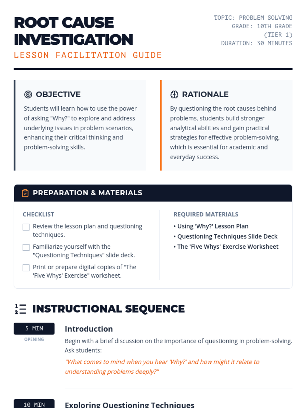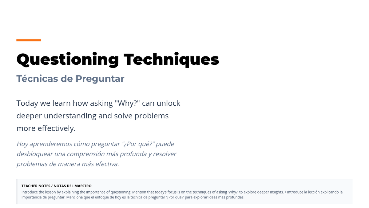 Explore the power of asking 'Why?' to dig deeper into problems and uncover root causes. This 30-minute lesson for 10th graders focuses on the 'Five Whys' technique to enhance critical thinking and problem-solving skills, with bilingual support for English Language Learners.