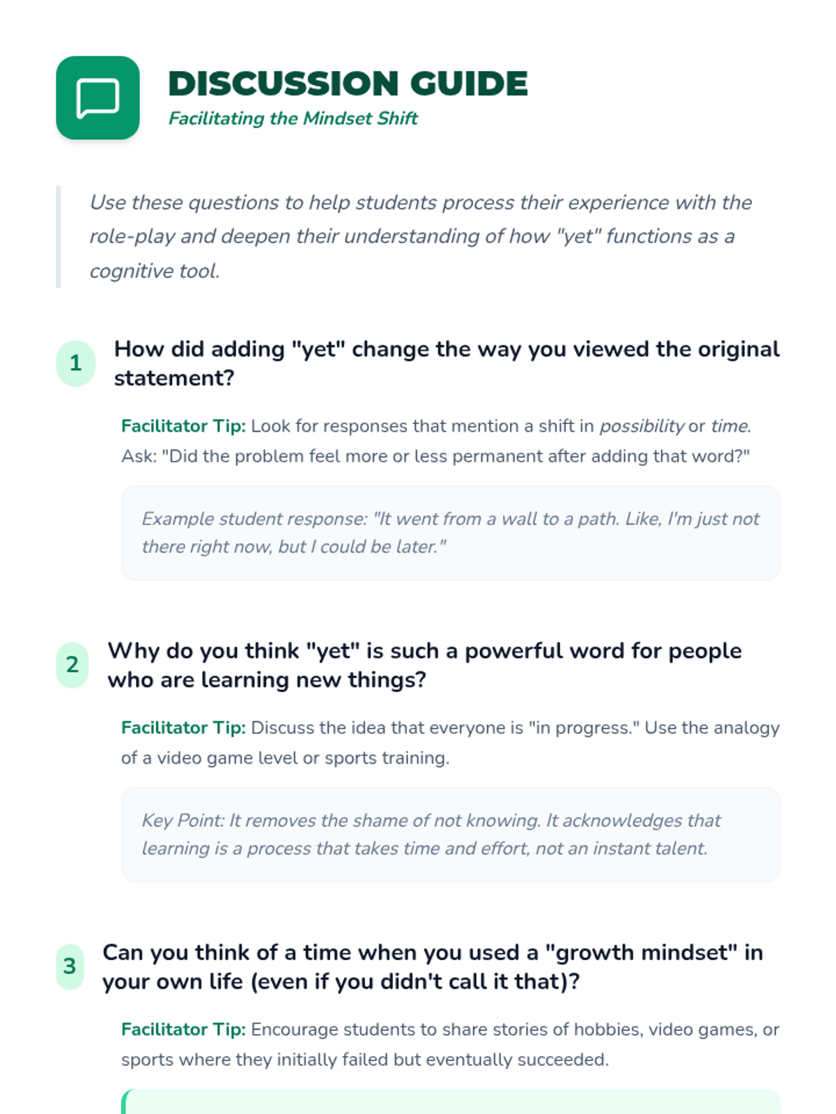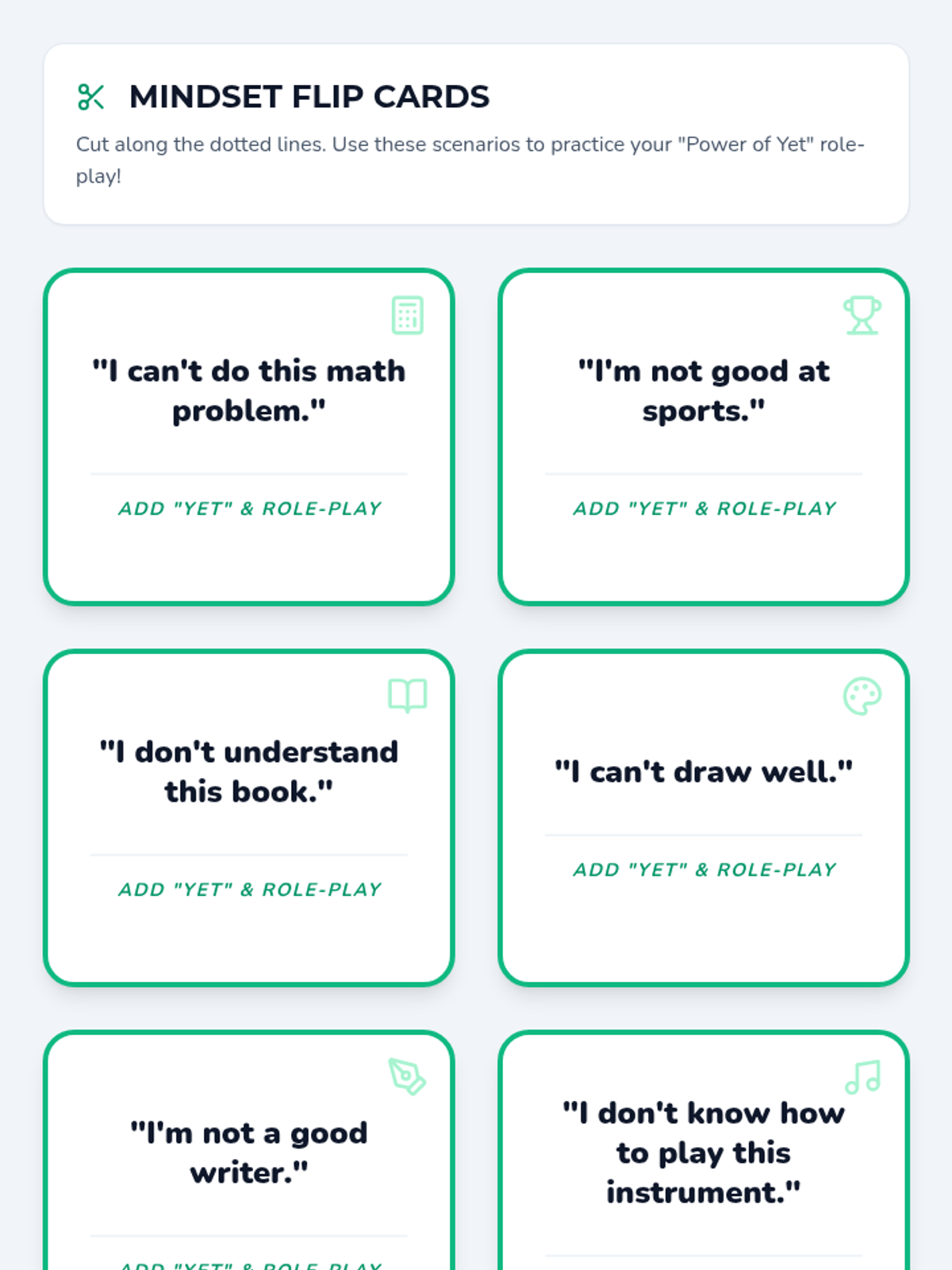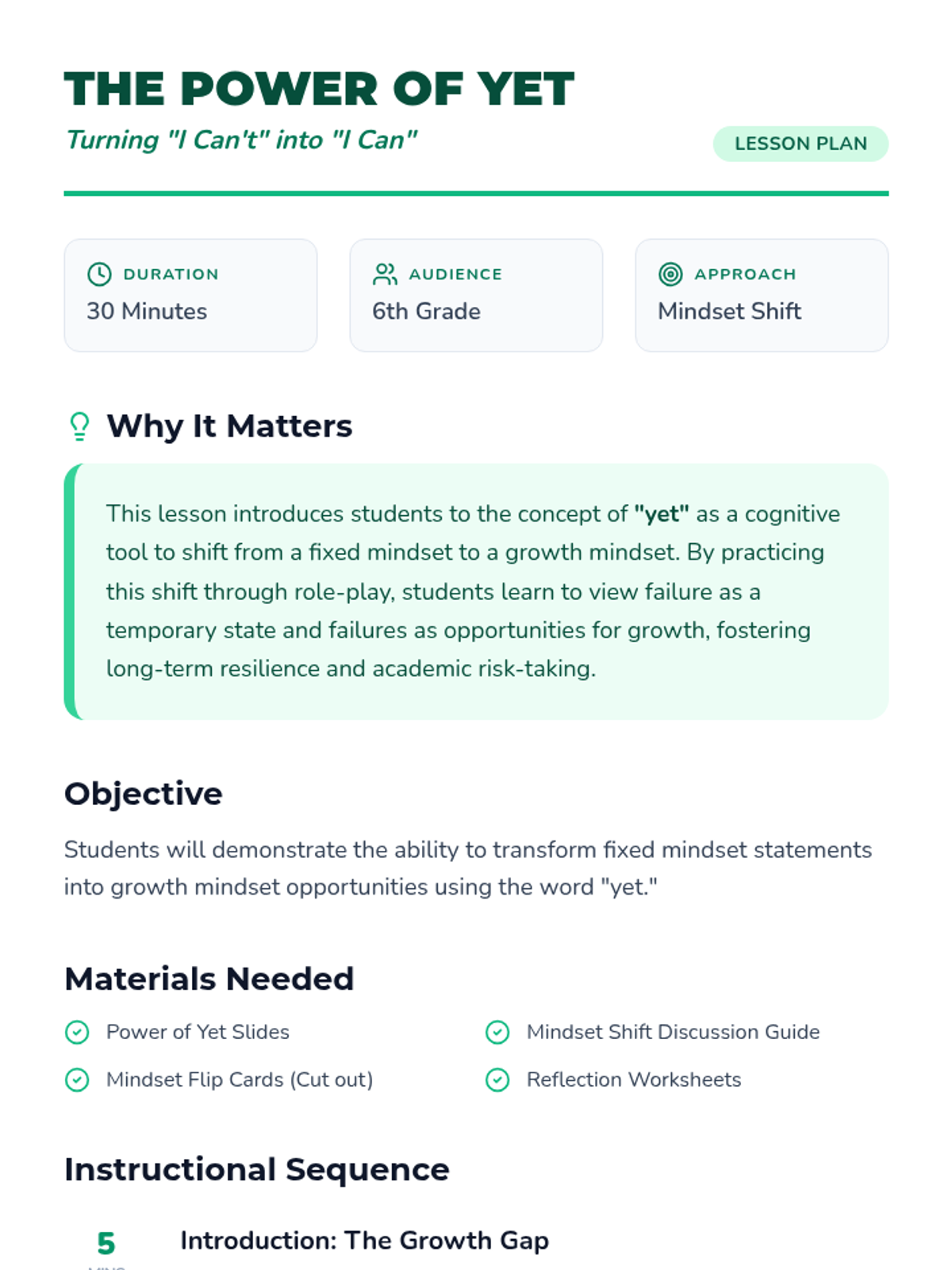 A transformative lesson for 6th graders to shift from fixed mindsets to growth mindsets using the magic of the word 'yet'. Includes interactive role-plays and reflective writing.