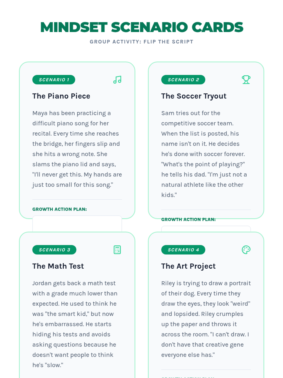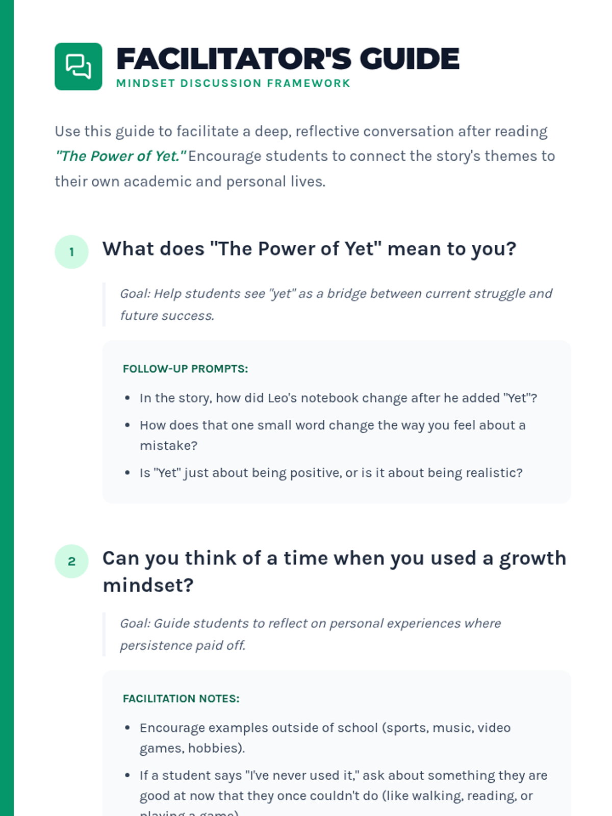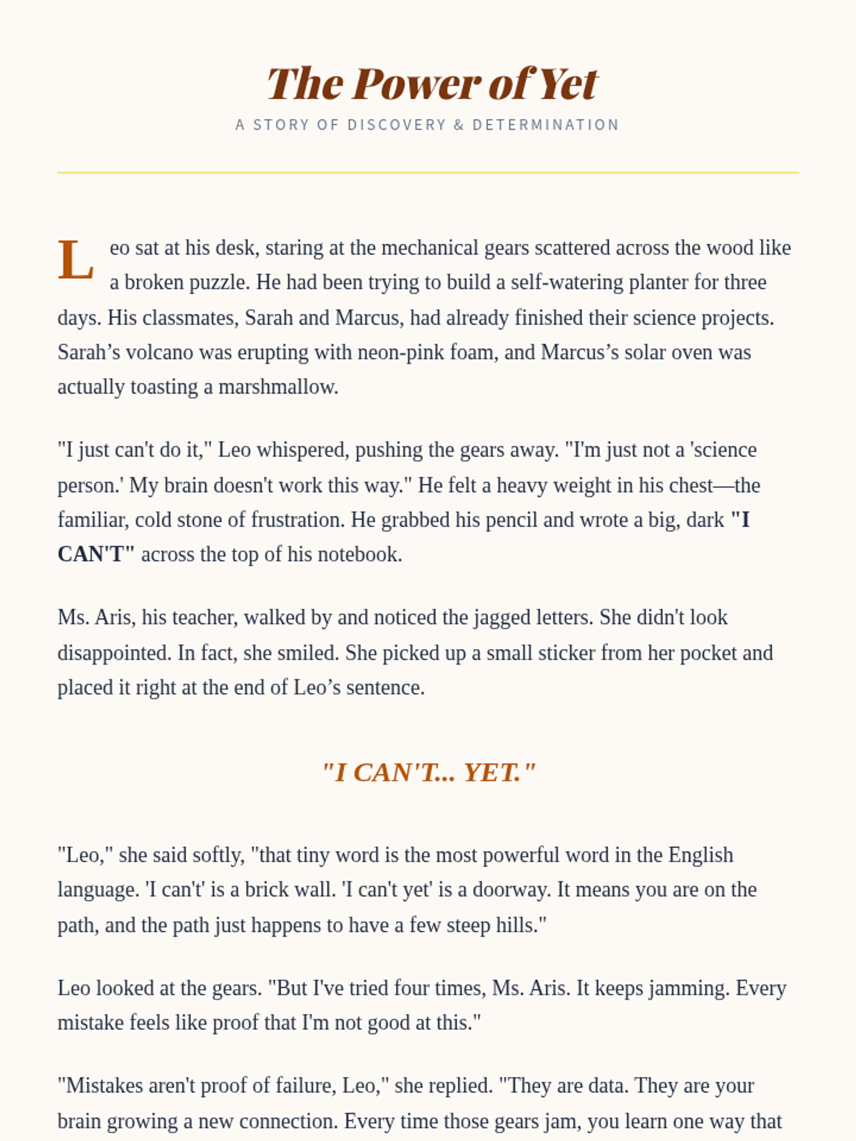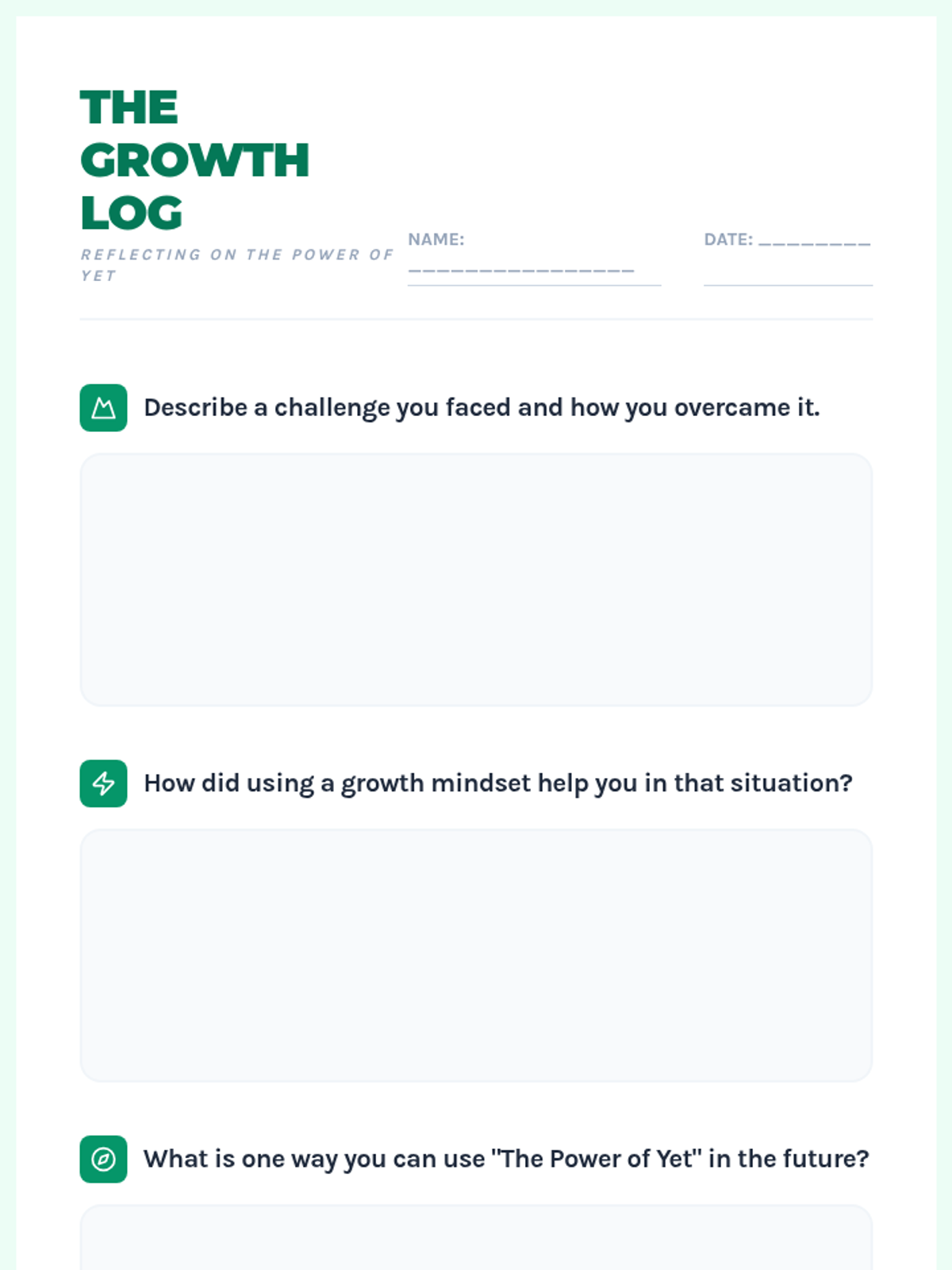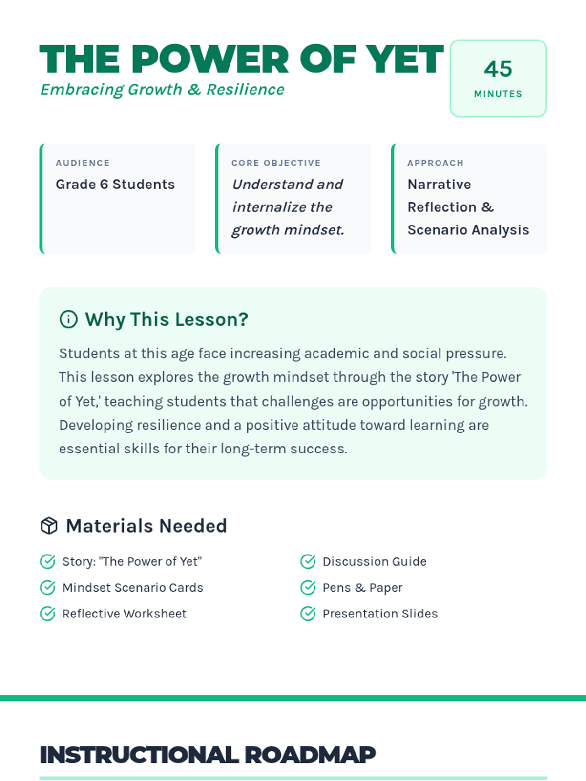 A lesson for Grade 6 students exploring growth mindset through the story 'The Power of Yet.' Students will learn to embrace challenges, learn from mistakes, and apply a positive attitude toward learning.