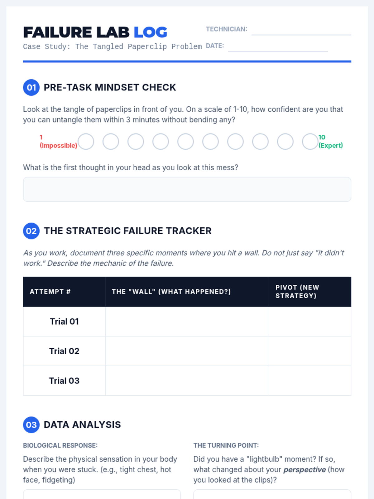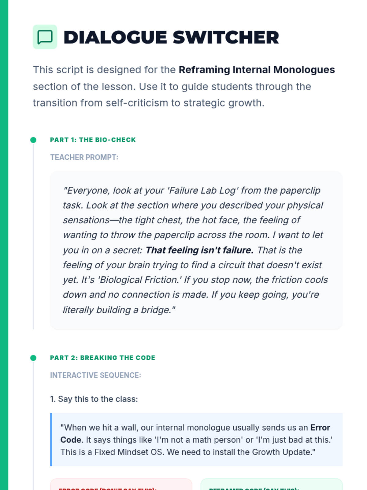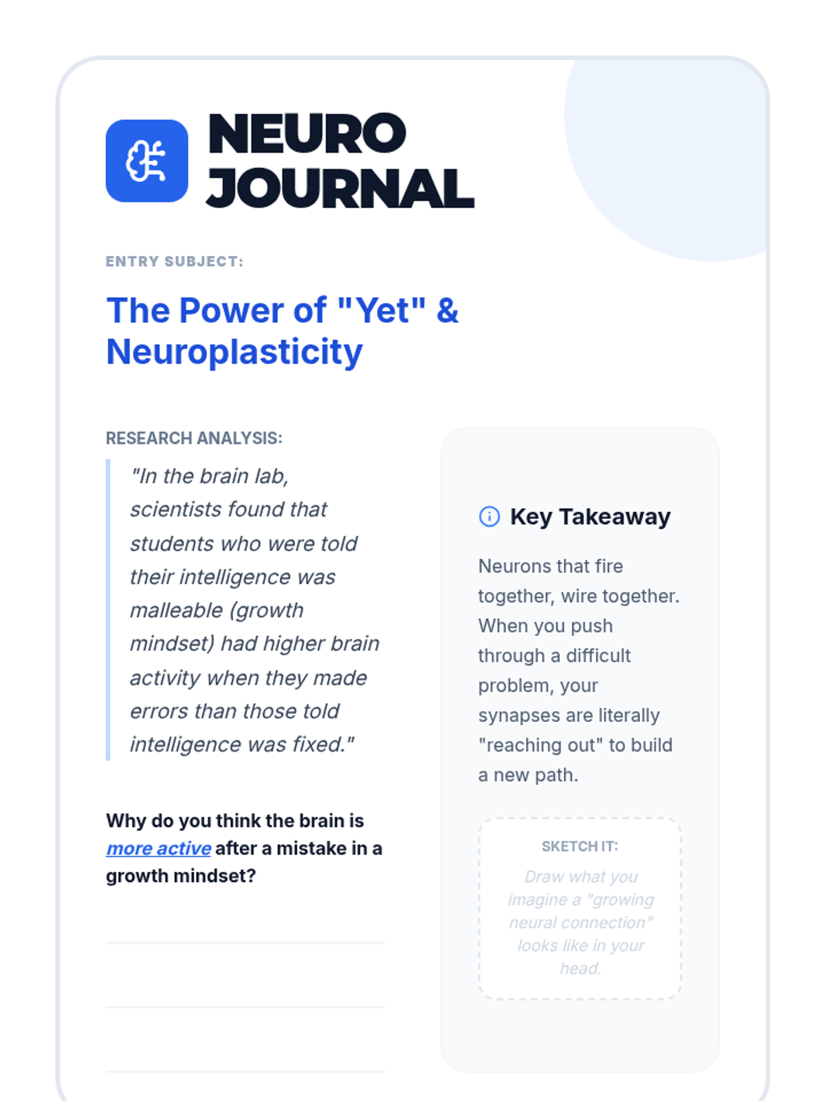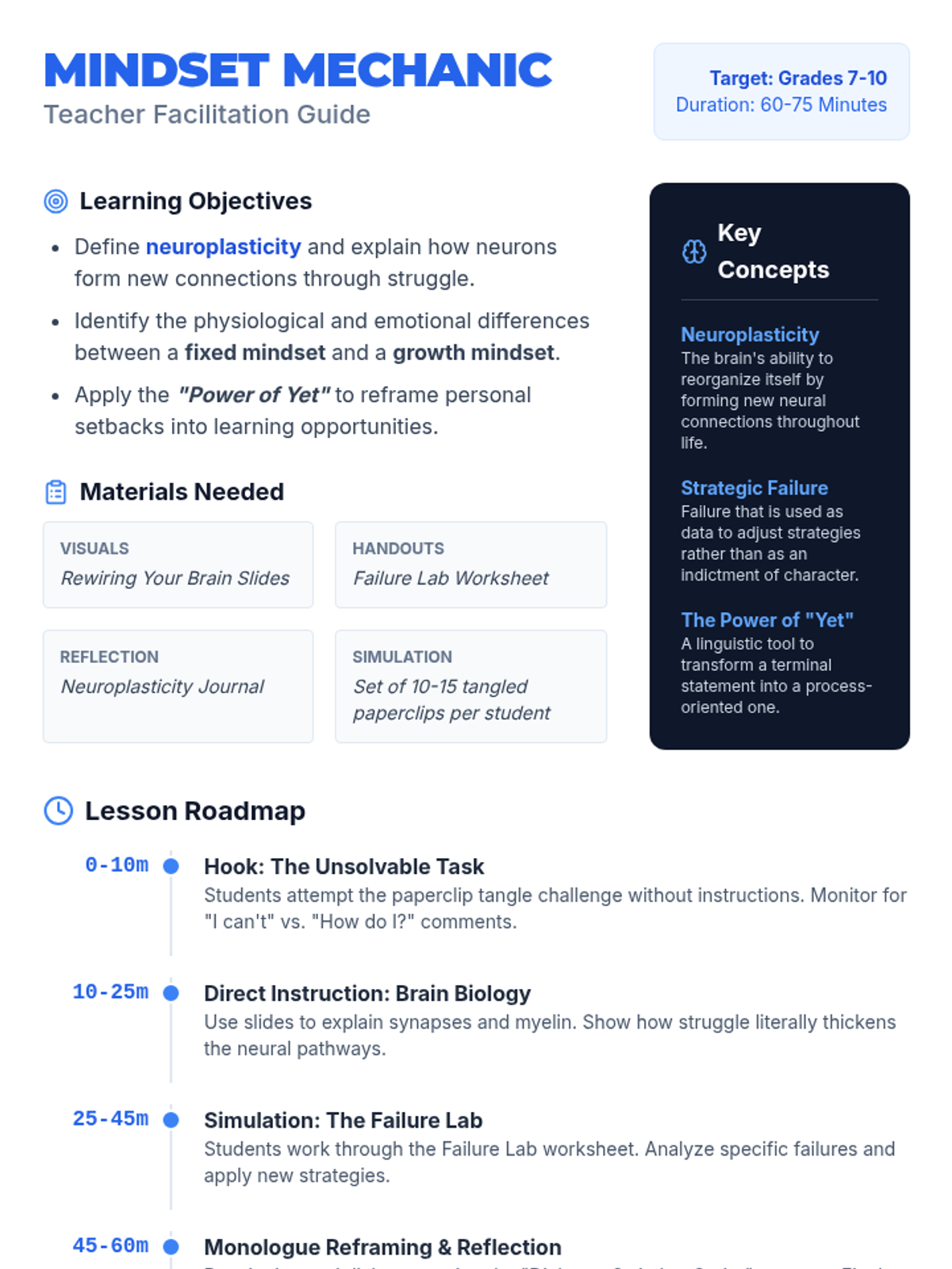A lesson designed to shift 7th-10th grade students' perception of intelligence from fixed to malleable. Students explore neuroplasticity, engage in a high-challenge simulation, and practice reframing internal monologues using the 'Power of Yet'.