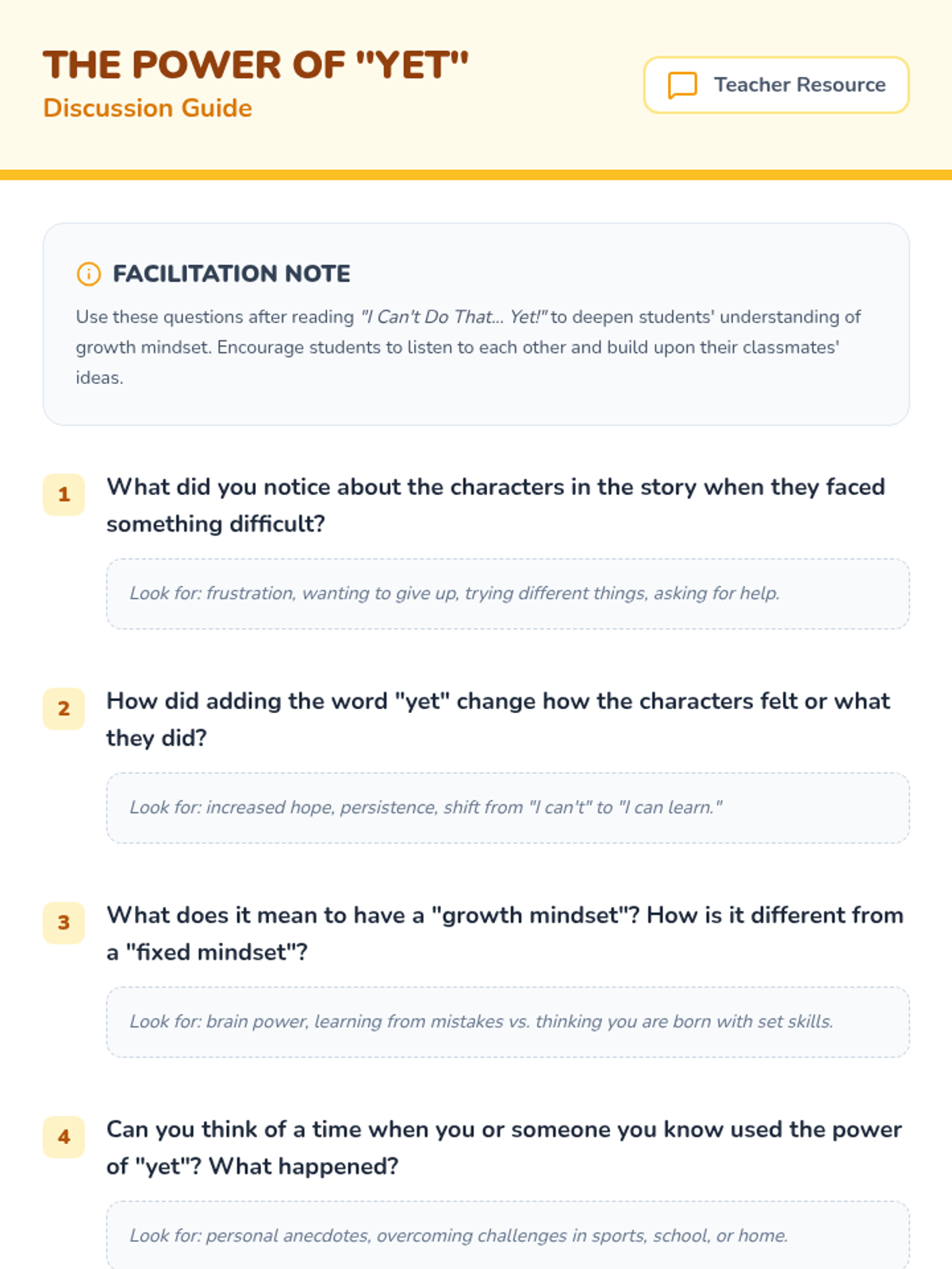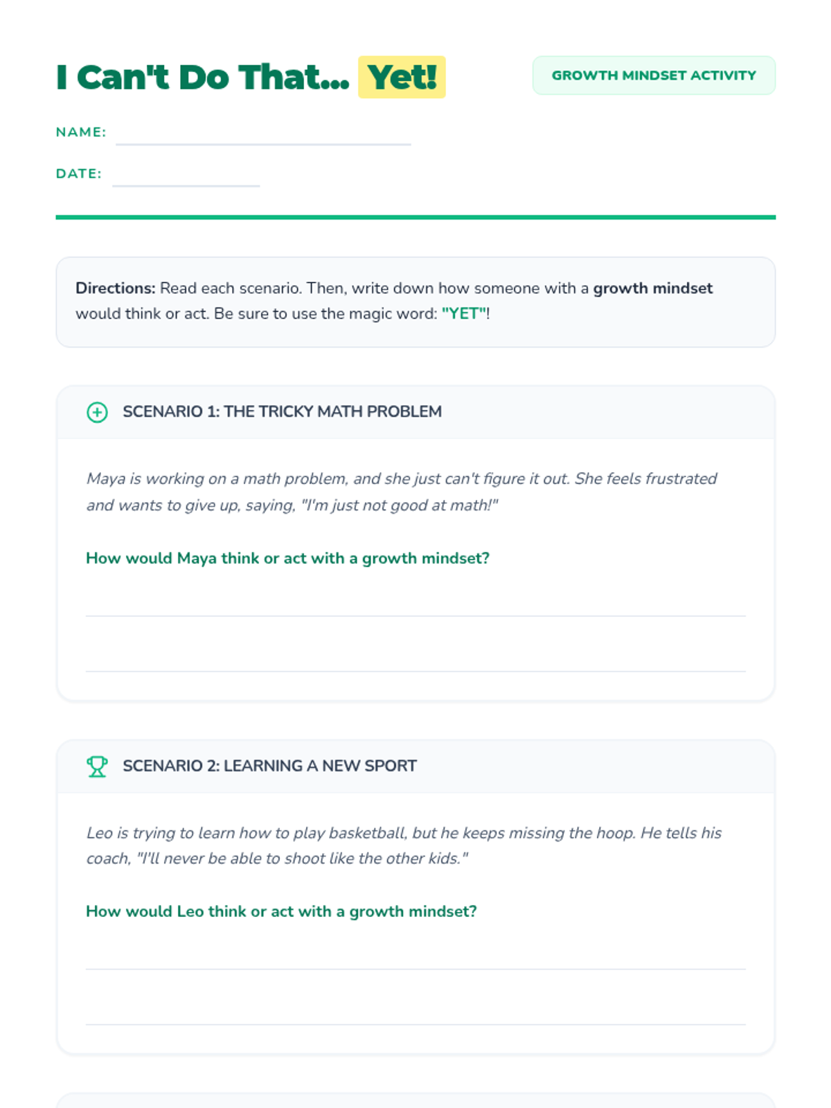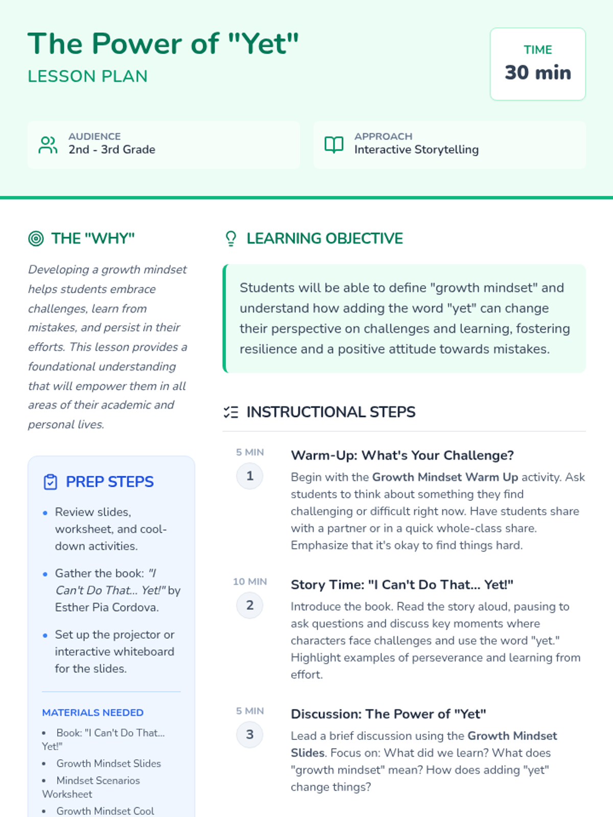 This engaging 30-minute lesson introduces 2nd and 3rd-grade students to the concept of a growth mindset using the book 'I Can't Do That... Yet!' by Esther Pia Cordova. Students will learn how embracing challenges and believing in their ability to grow can transform their learning journey.