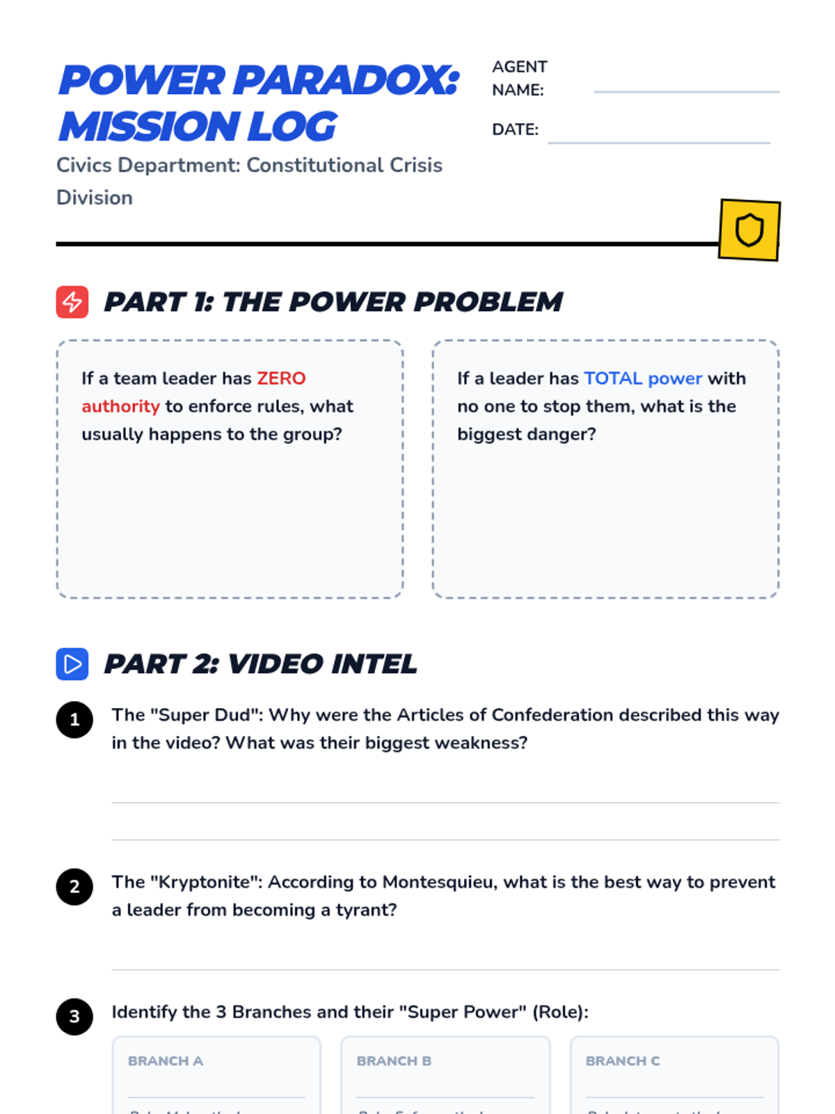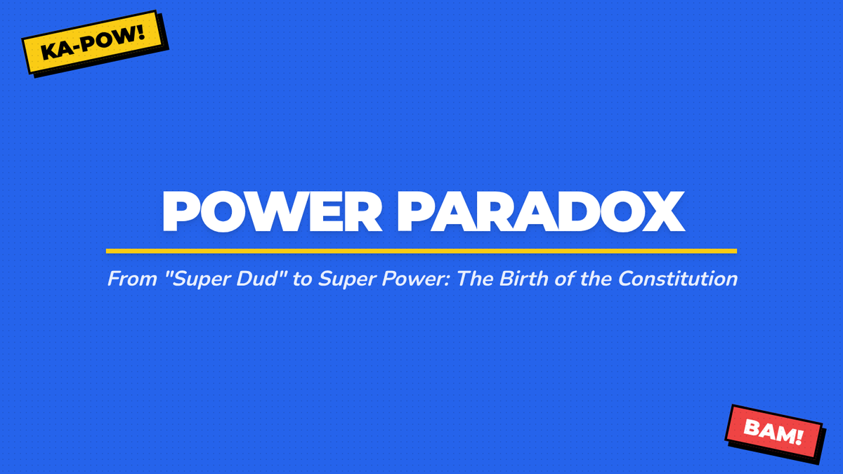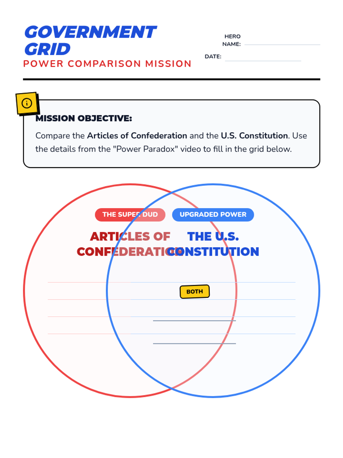 A middle school civics lesson comparing the weak central government of the Articles of Confederation with the strong, balanced system of the U.S. Constitution using a superhero metaphor.