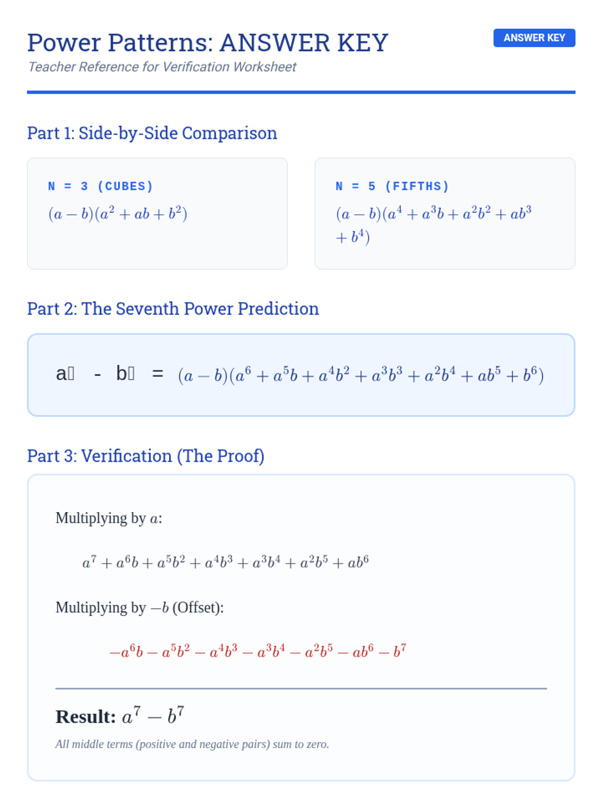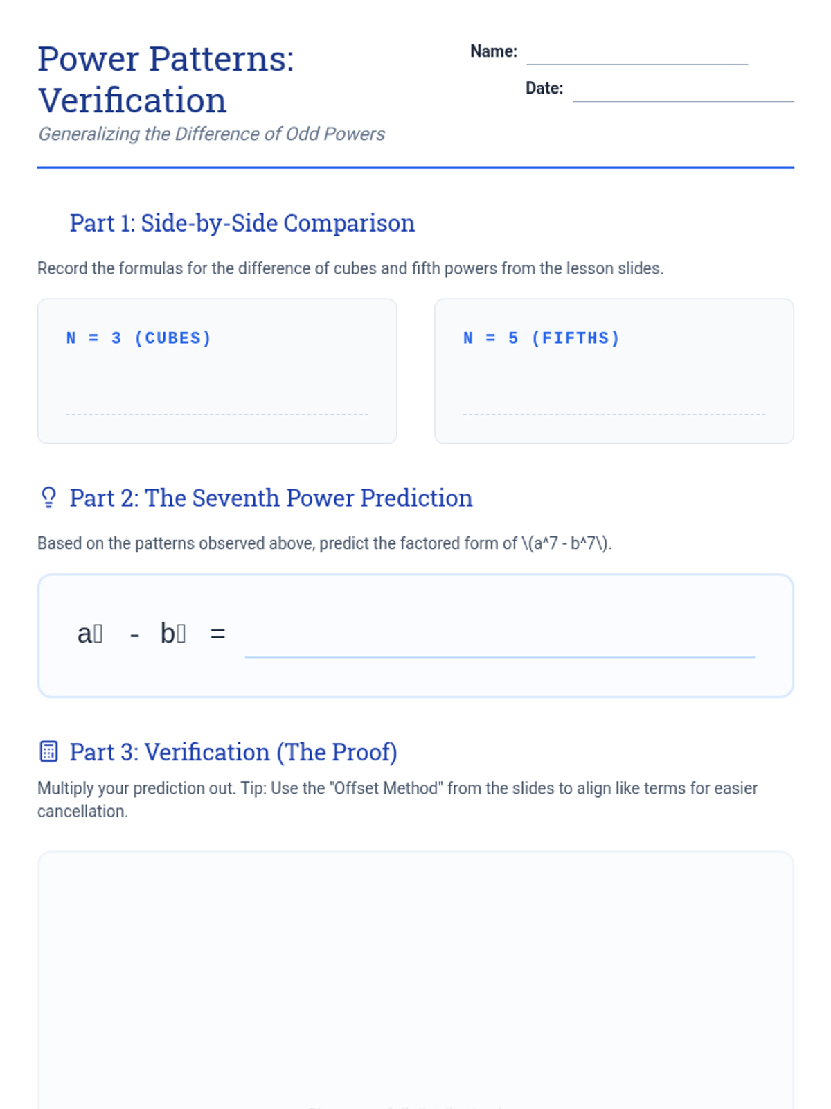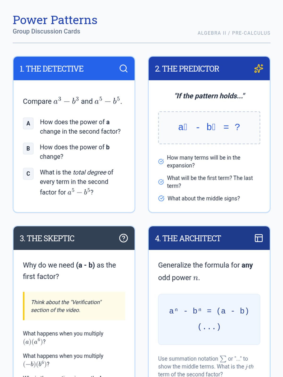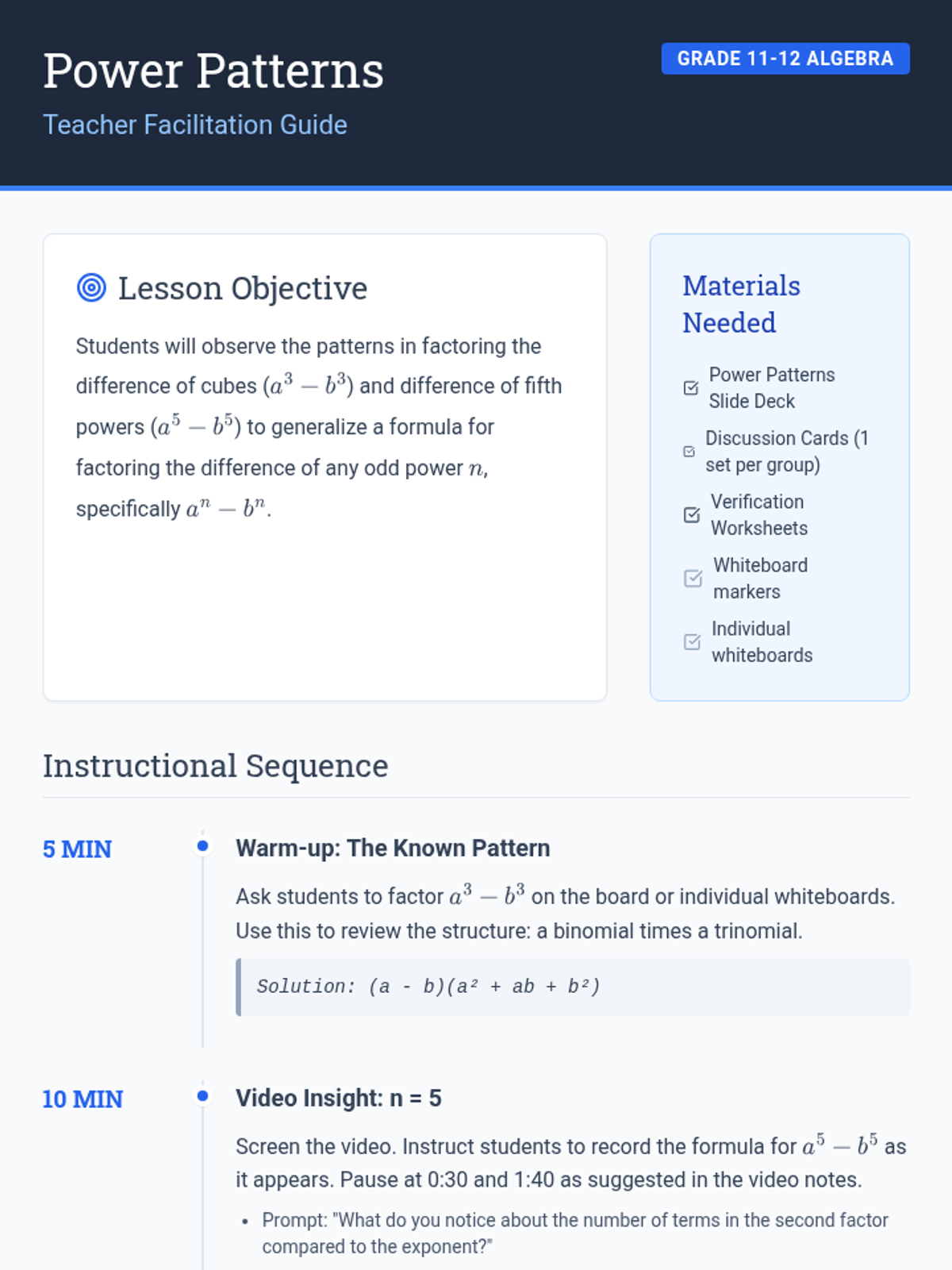 A high school math lesson focused on identifying and generalizing the pattern for factoring the difference of odd powers, using the difference of cubes and fifth powers as a foundation.