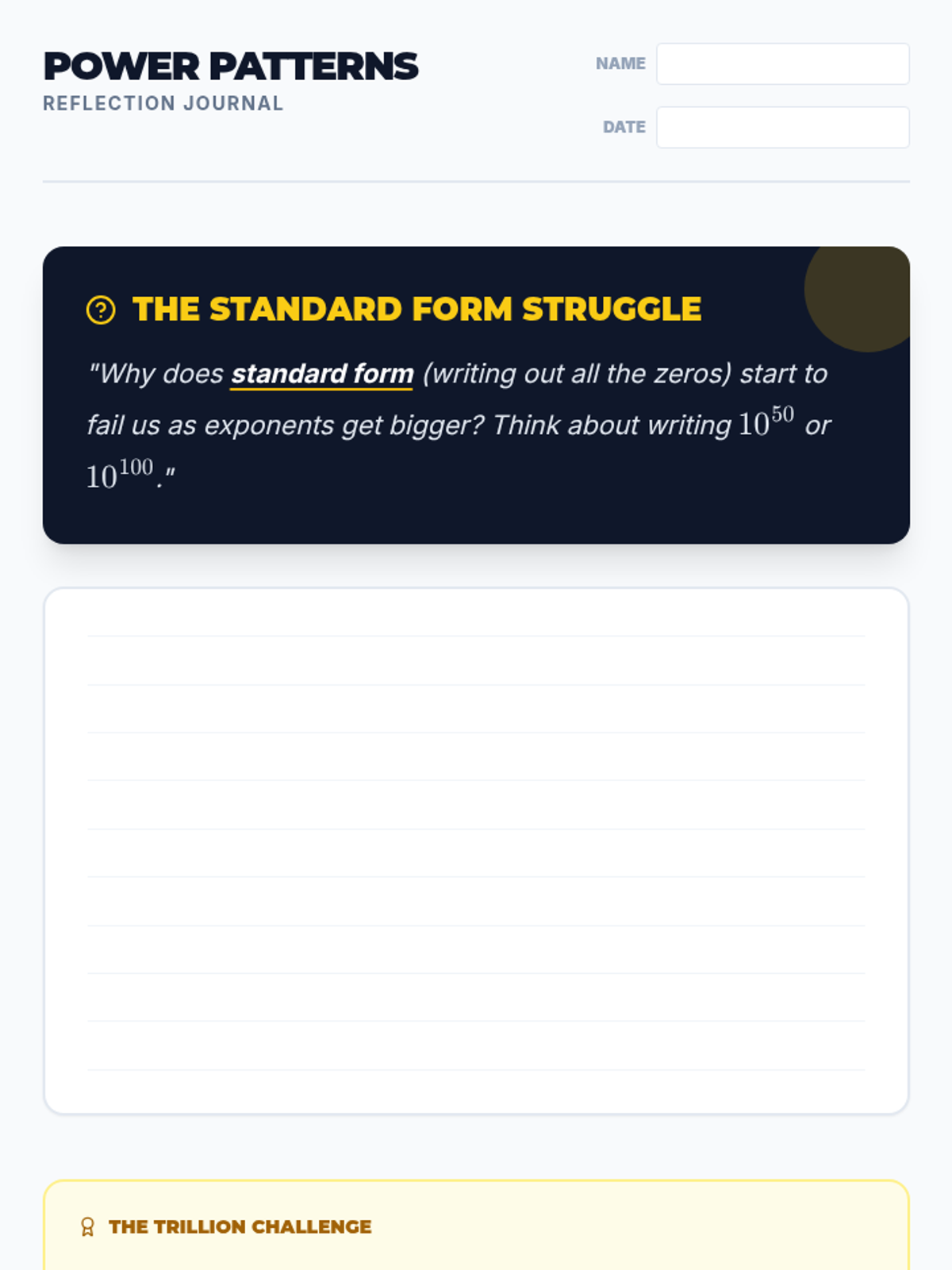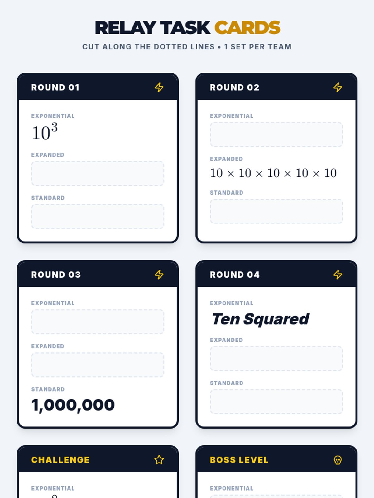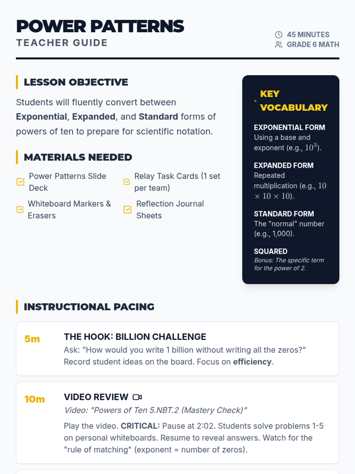 A high-energy review of powers of ten and exponent notation. Students use a 'relay race' format to practice converting between exponential, expanded, and standard forms, building the conceptual foundation for scientific notation.