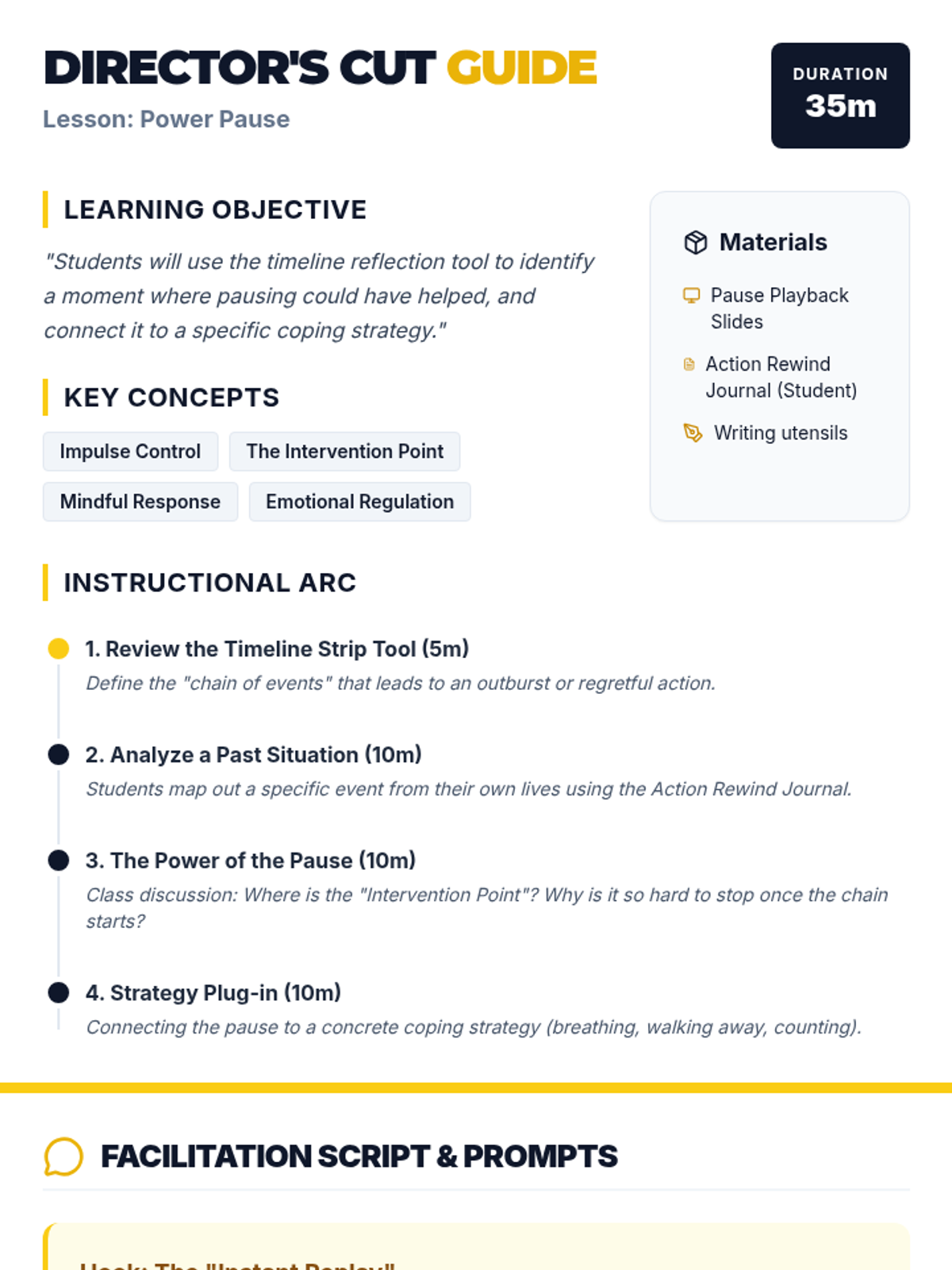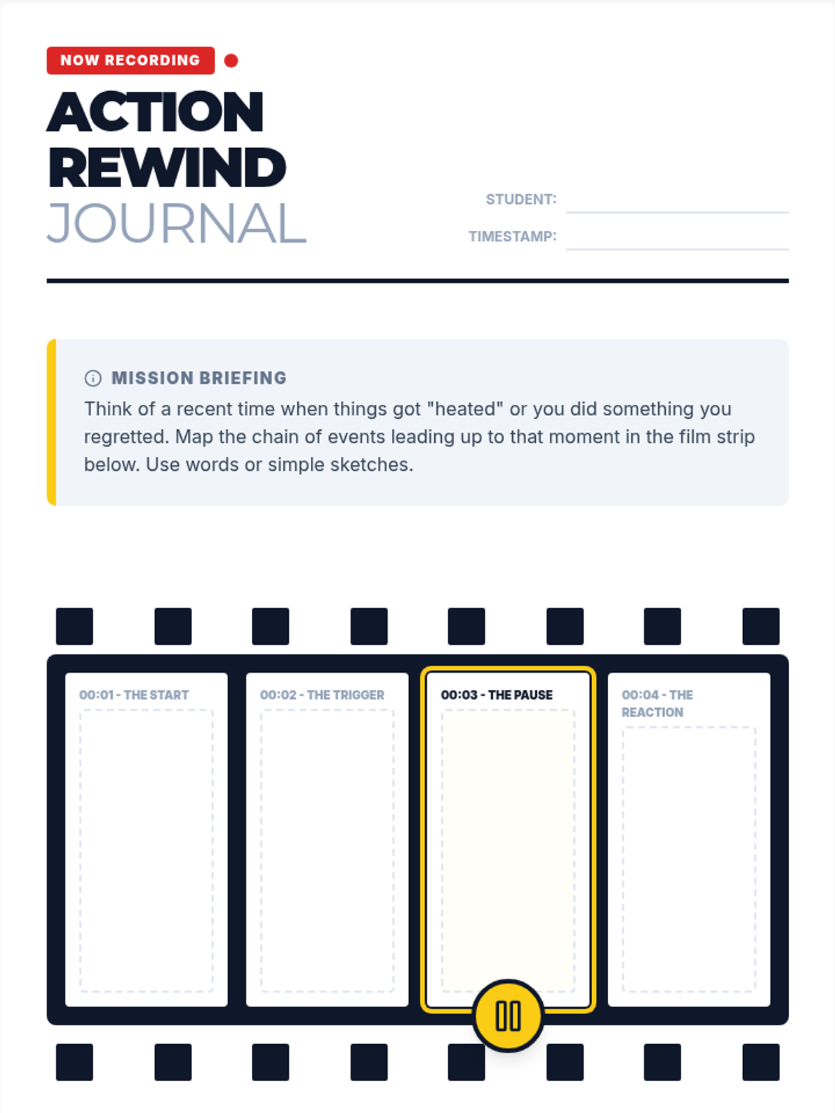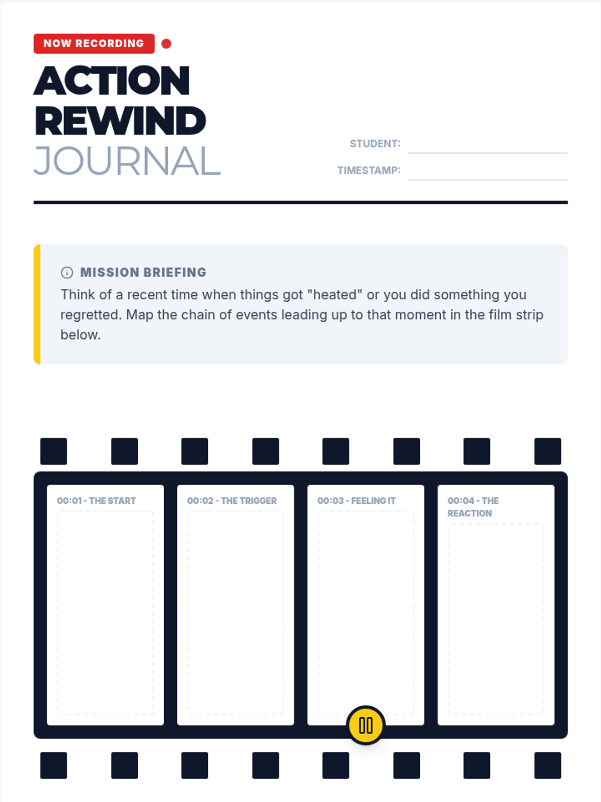 A 9th-grade social-emotional learning lesson focused on impulse control. Students use a timeline reflection tool to identify 'intervention points' in past conflicts where a strategic pause could have changed the outcome.