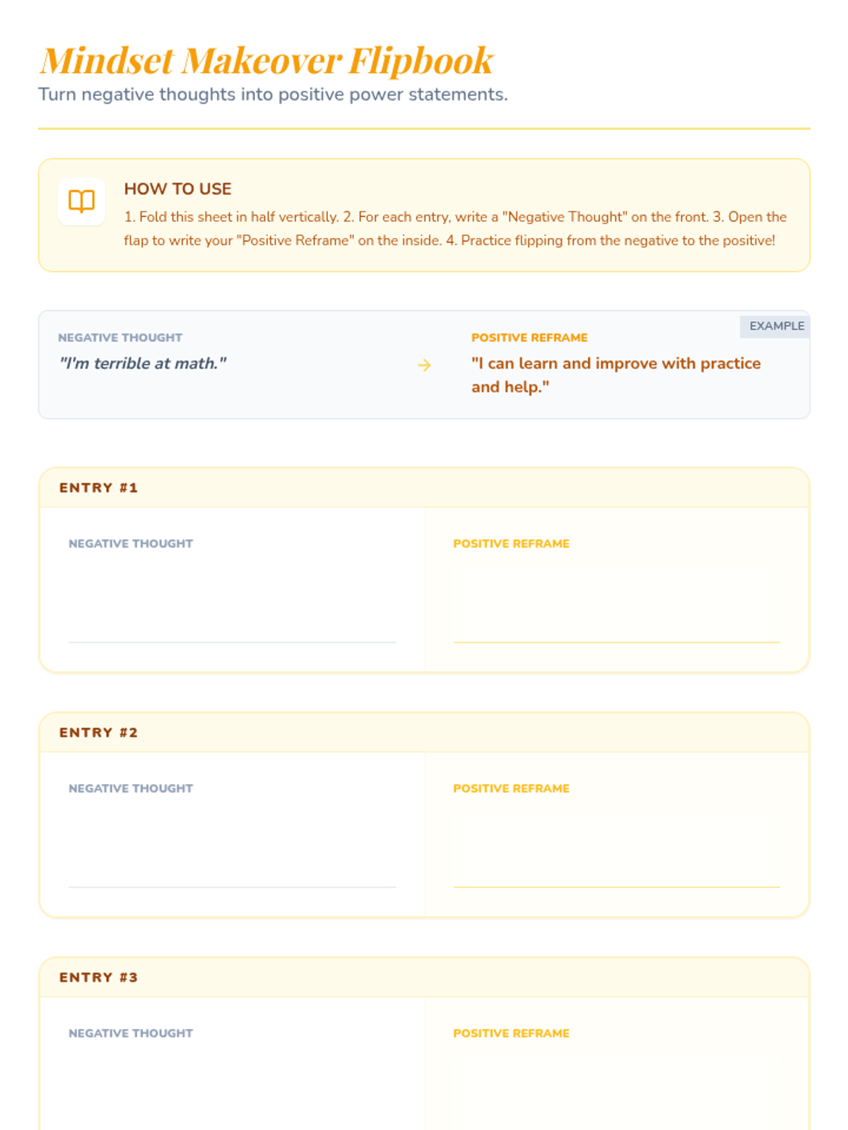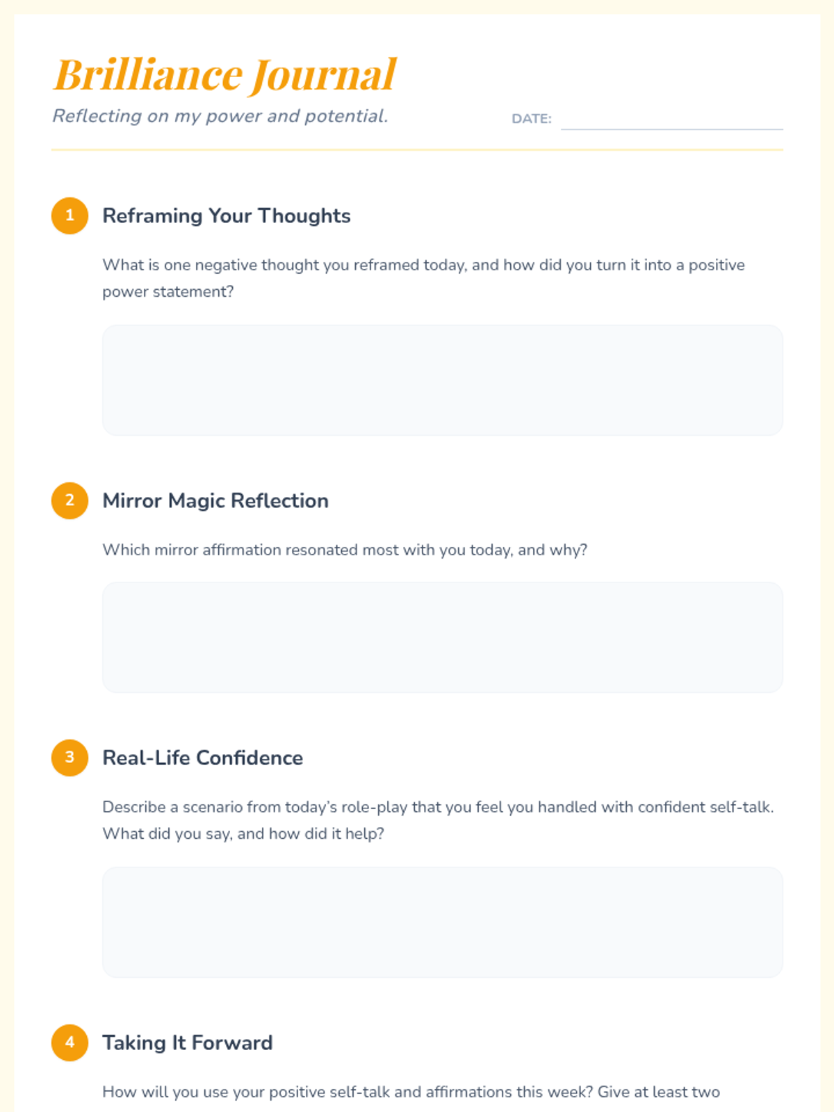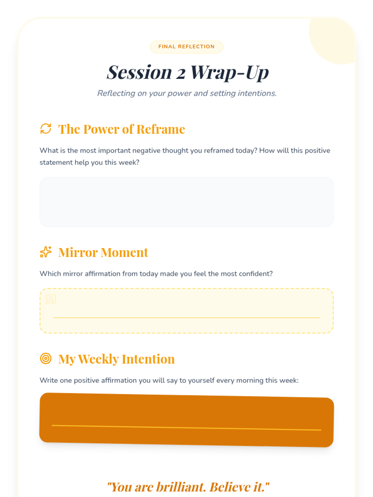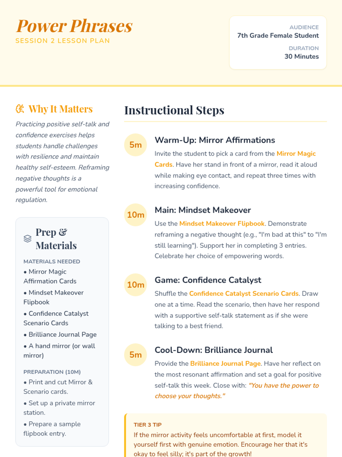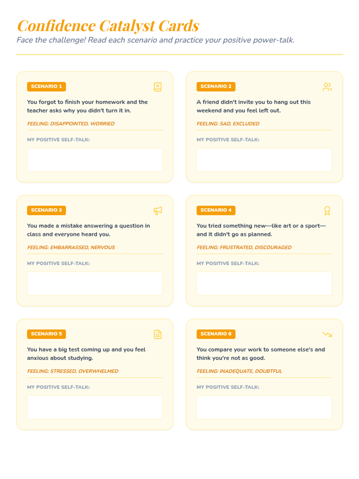 Focuses on practicing positive self-talk, reframing negative thoughts, and using affirmations to boost confidence.