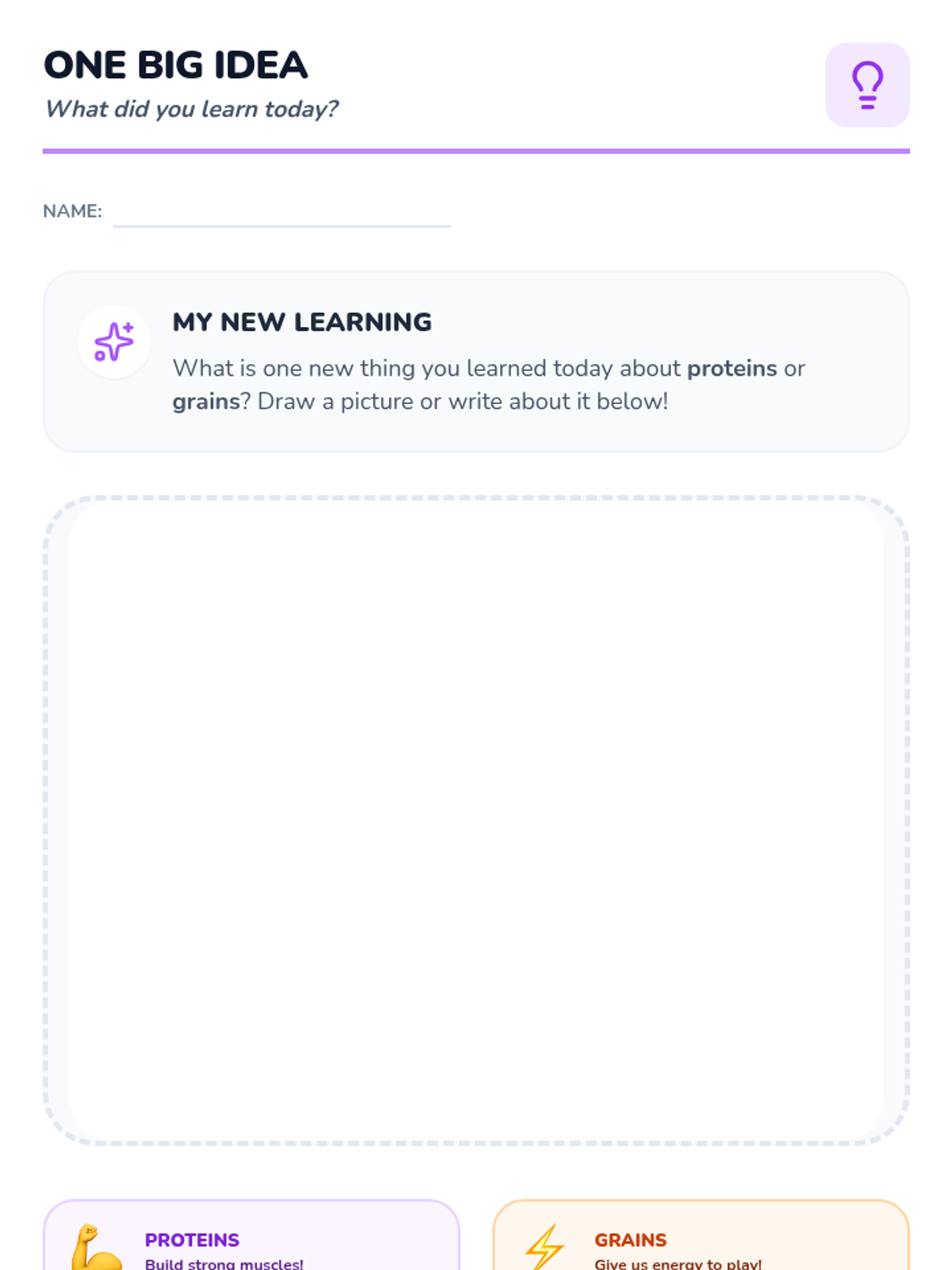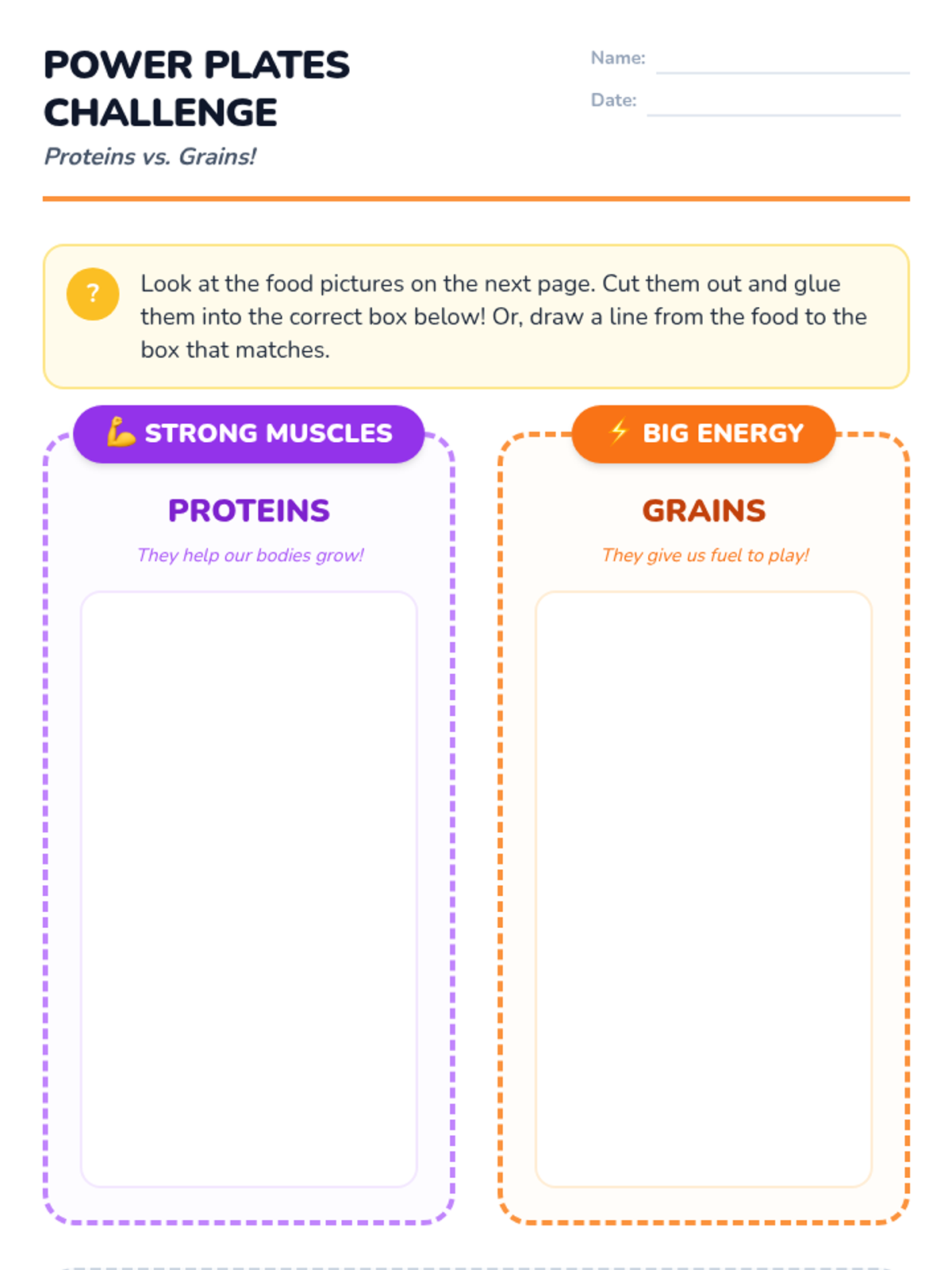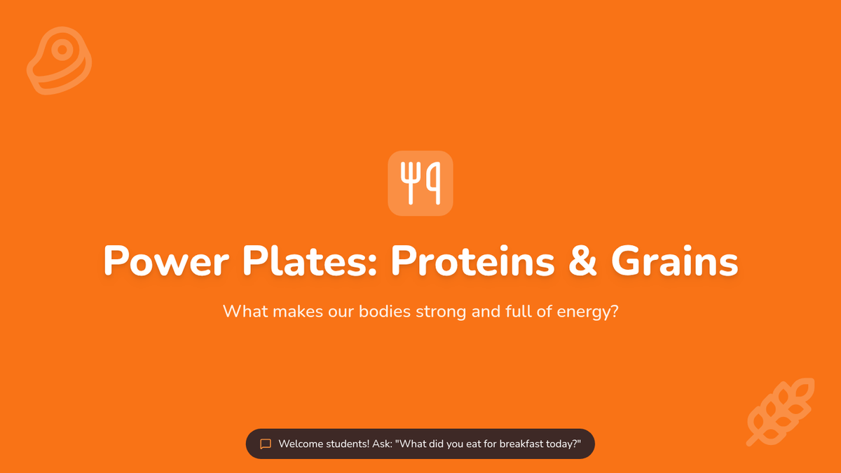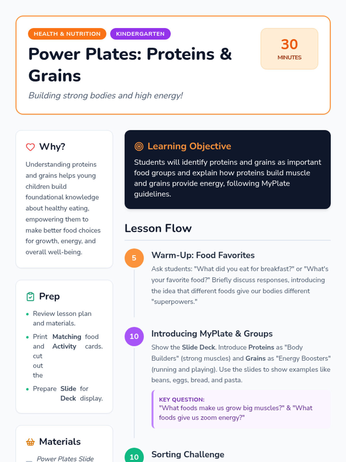 A healthy eating lesson for kindergarteners focusing on the protein and grain food groups using the MyPlate framework. Students learn how proteins build muscles and grains provide energy through interactive slides and a sorting activity.
