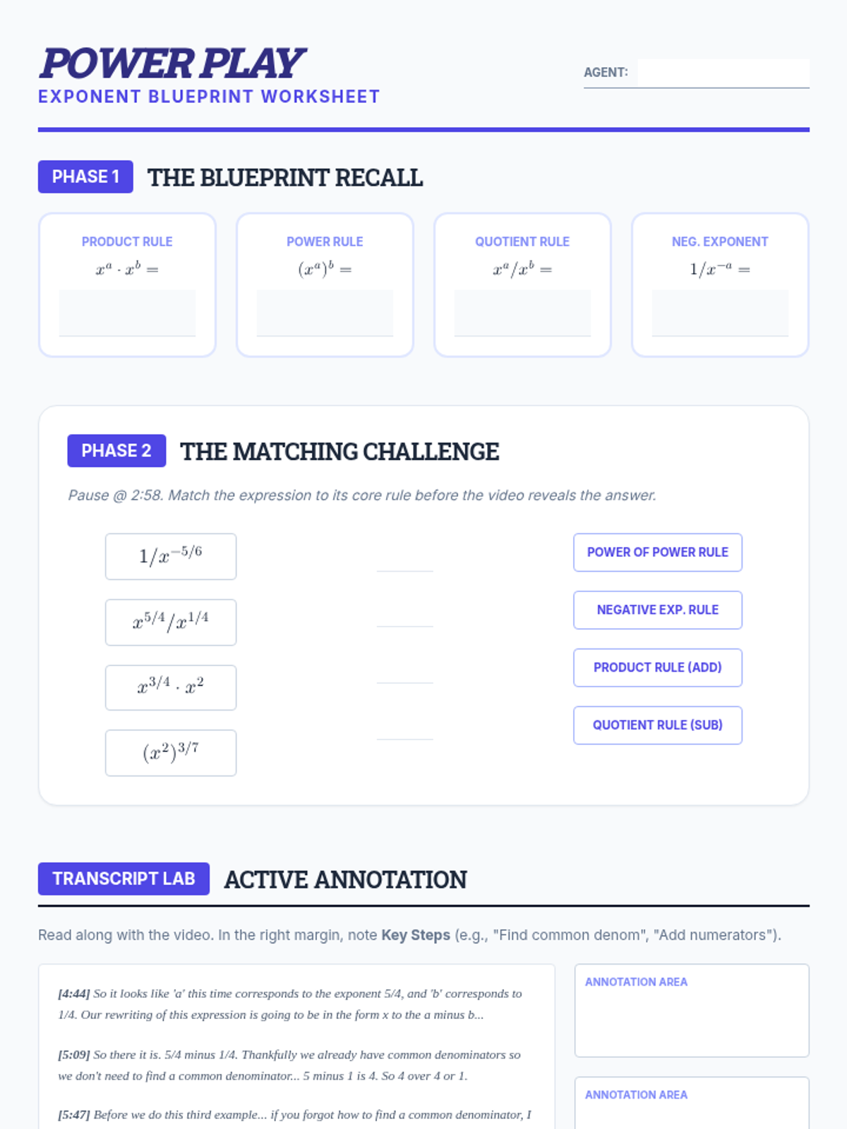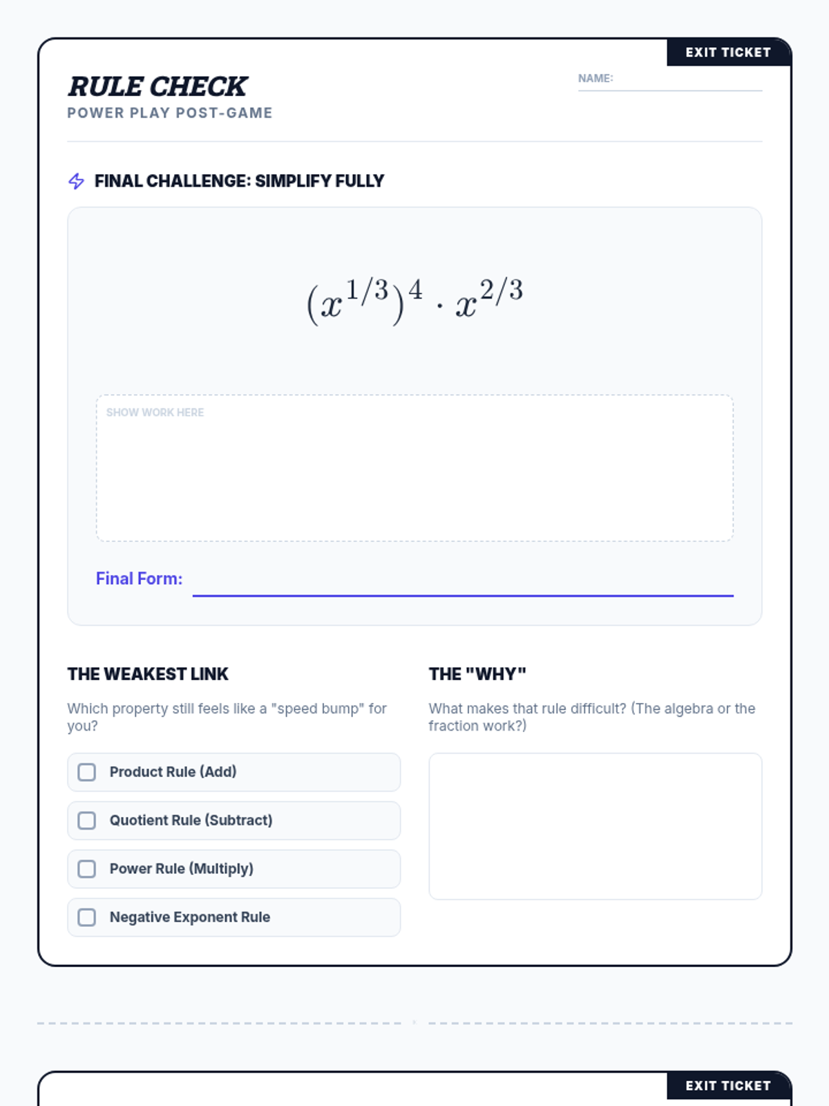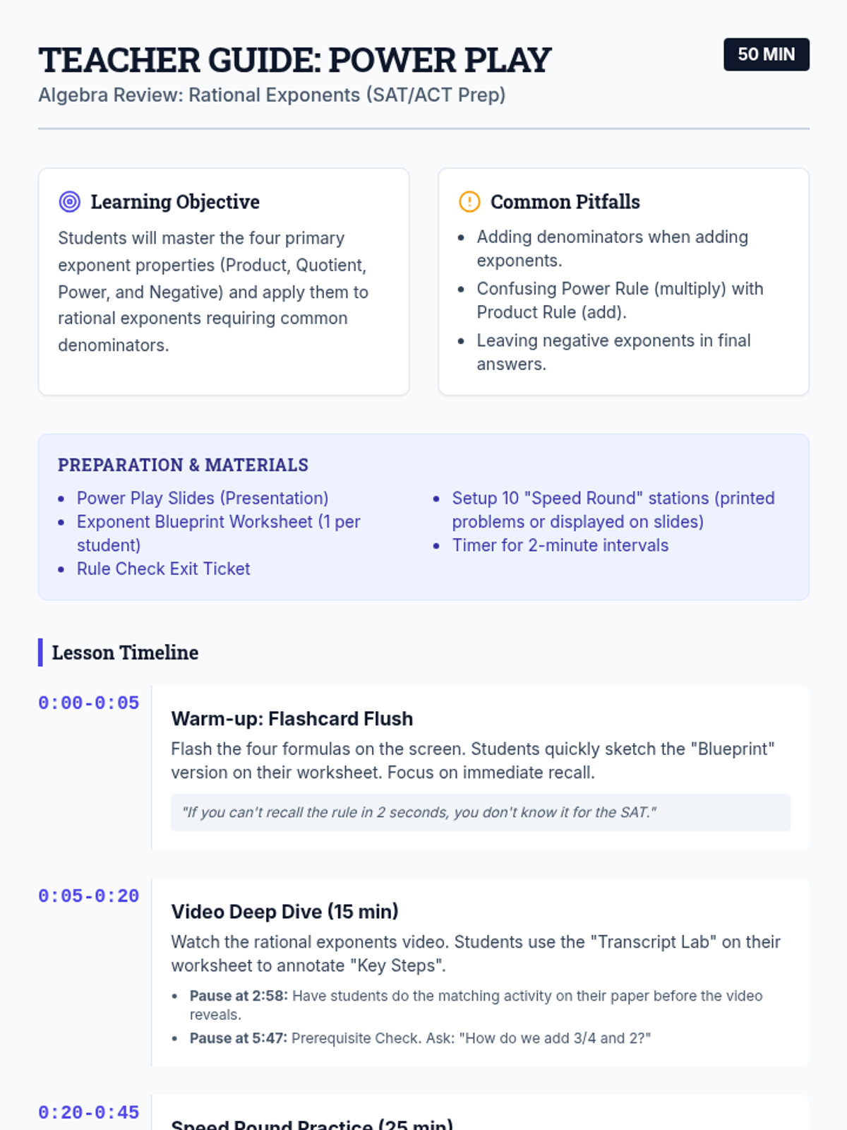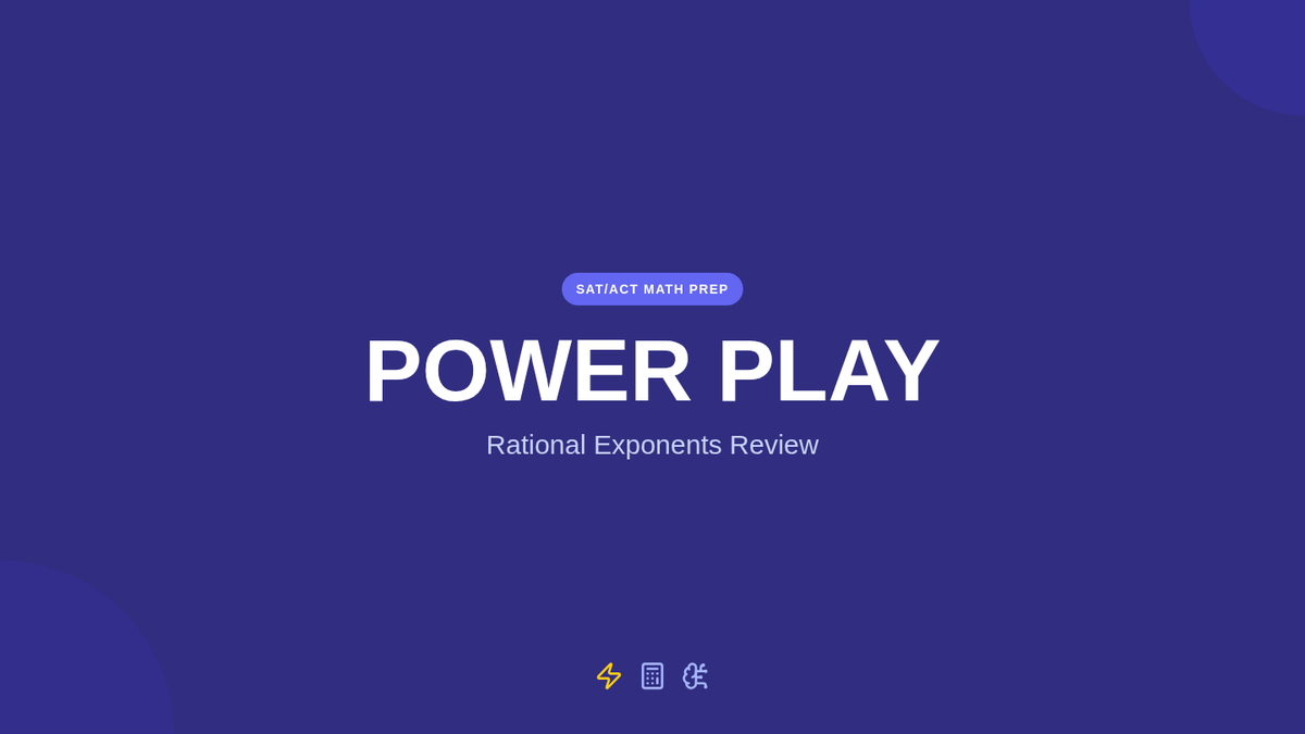 A high-energy review of rational exponent properties designed for 11th and 12th graders preparing for SAT/ACT math sections. Students transition from formula recall to strategic application, with a focus on fraction operations within exponents.