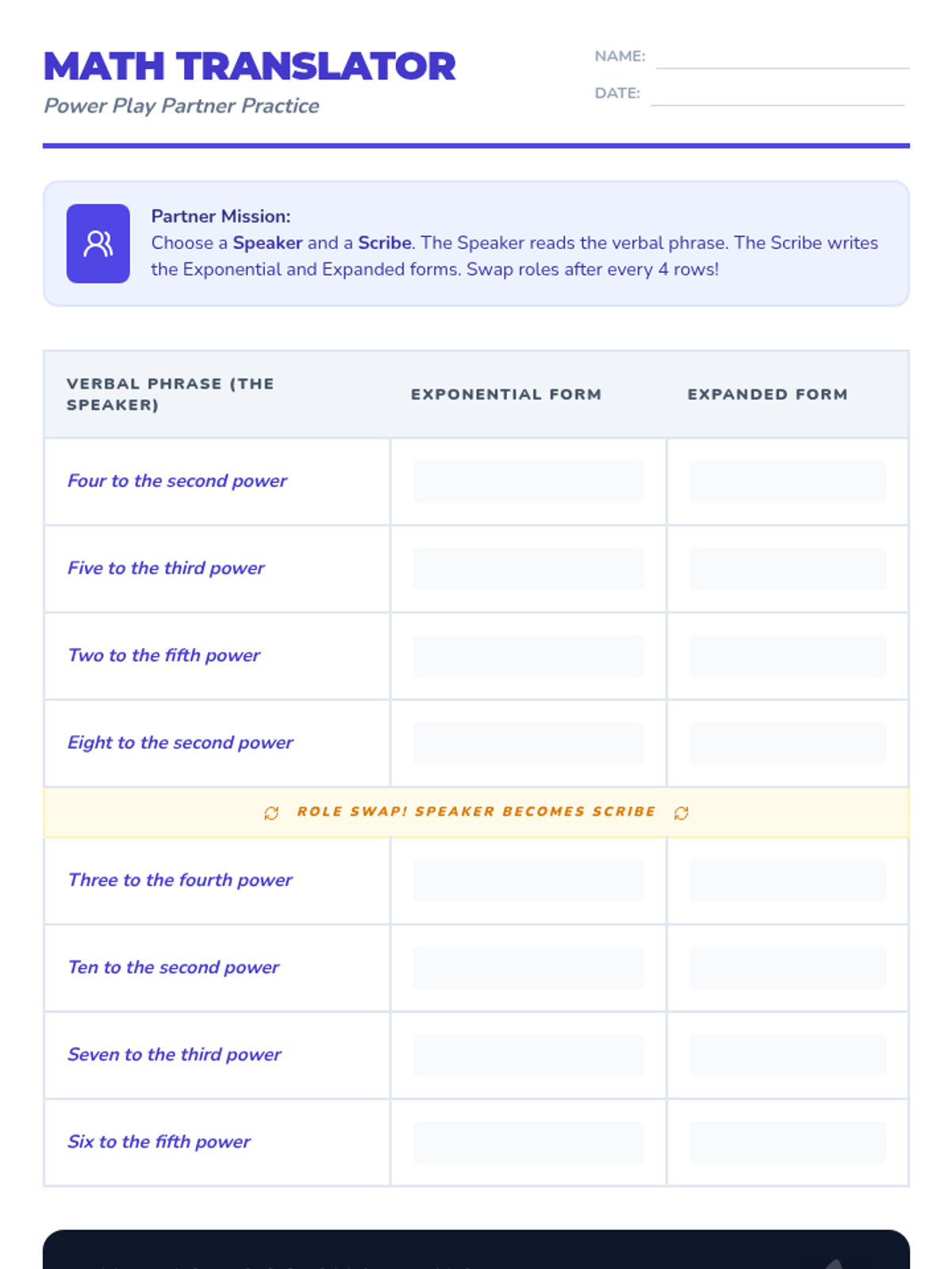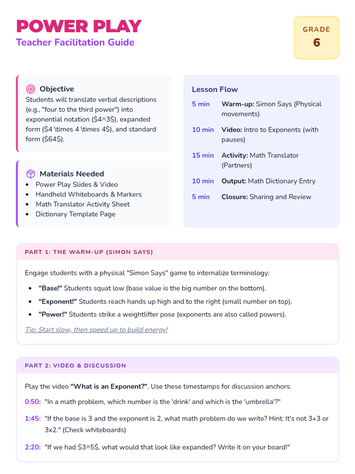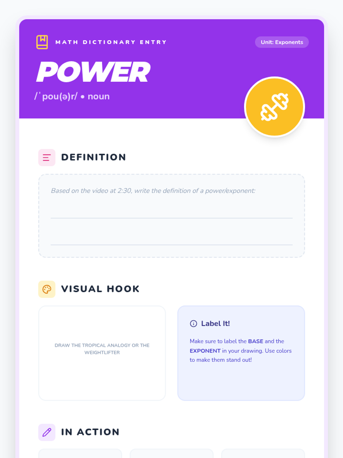 A 6th-grade math lesson introducing exponents through a tropical analogy, moving from verbal descriptions to exponential and expanded forms. Students use a 'Simon Says' warm-up and create a custom dictionary entry based on video definitions.