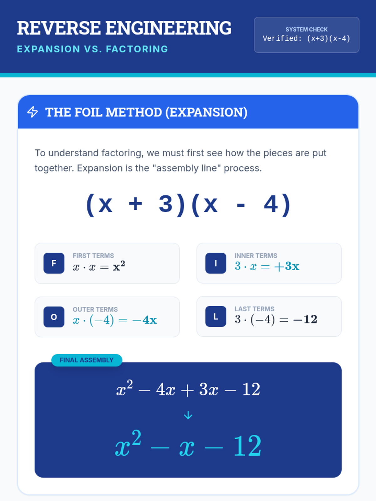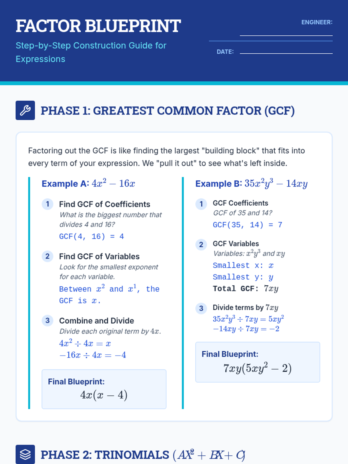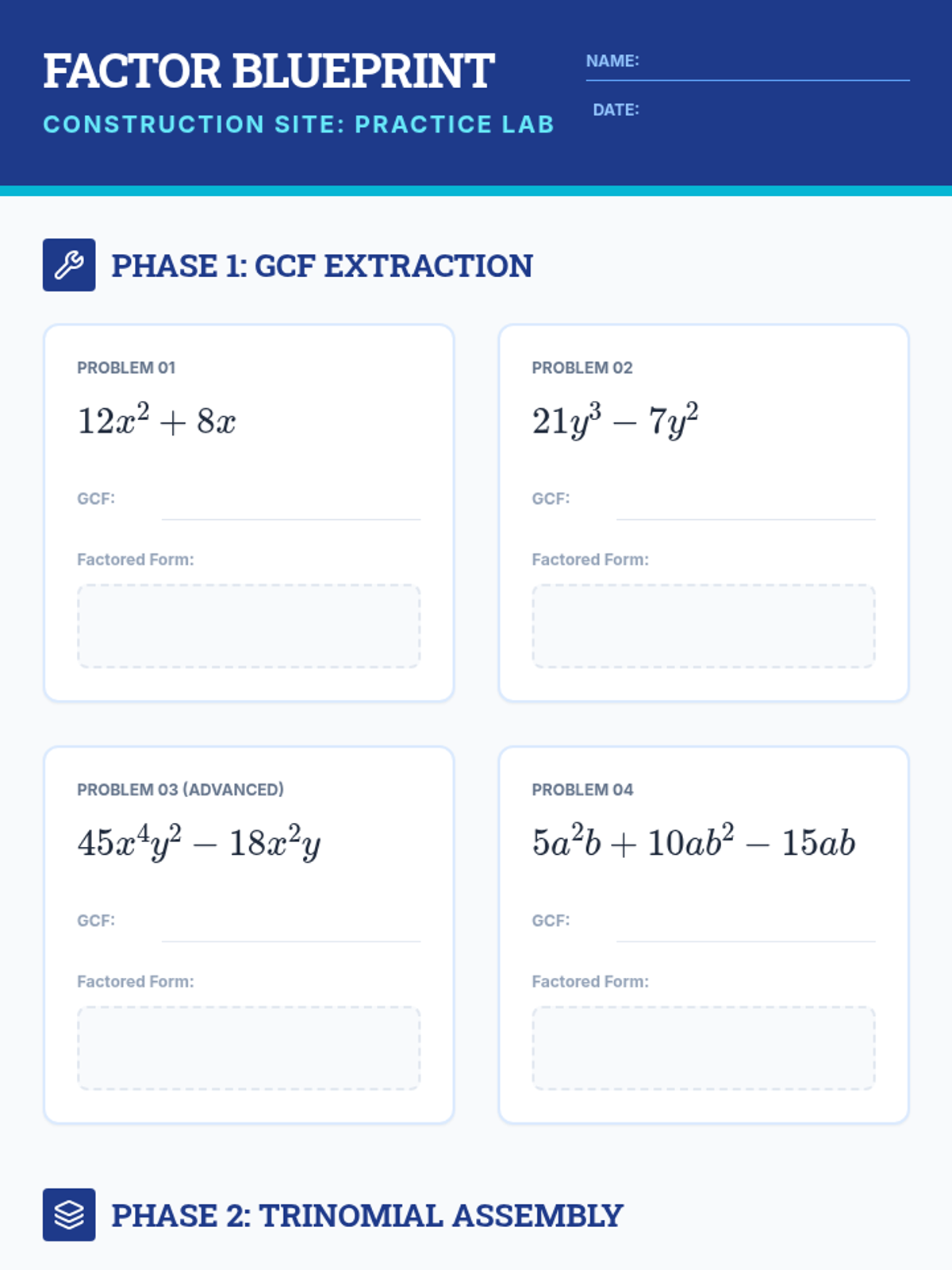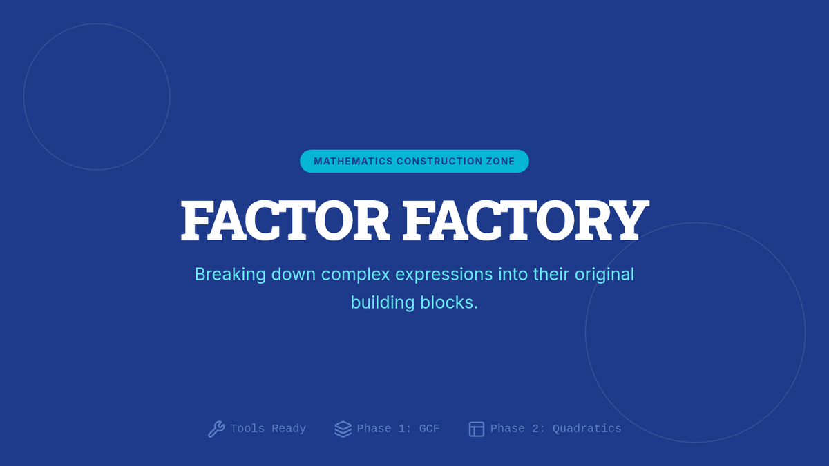 A comprehensive lesson on mastering Greatest Common Factor (GCF) and quadratic factoring techniques using a structured, step-by-step blueprint approach.