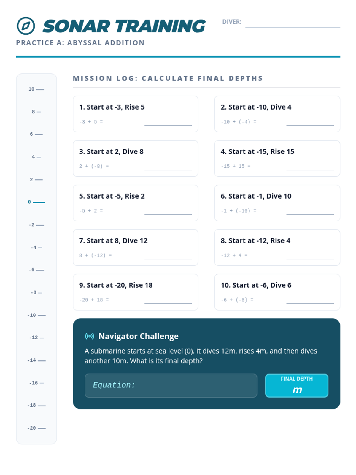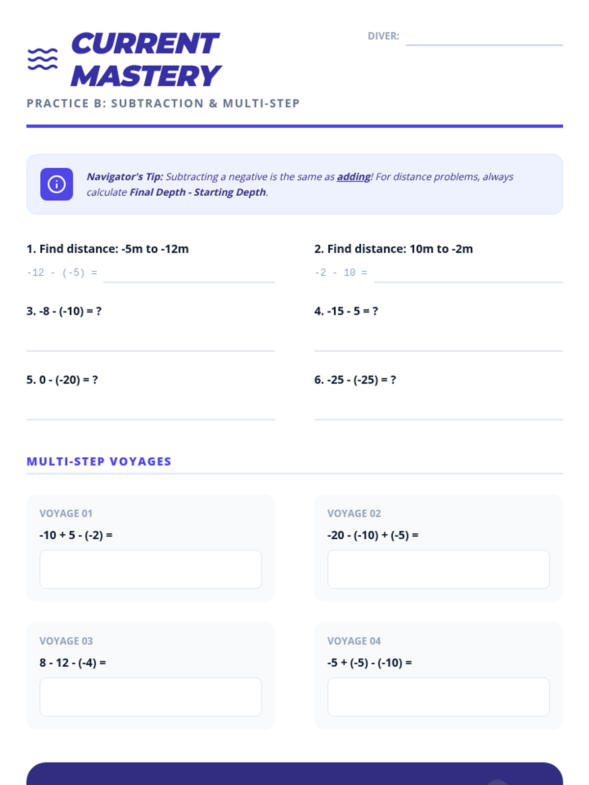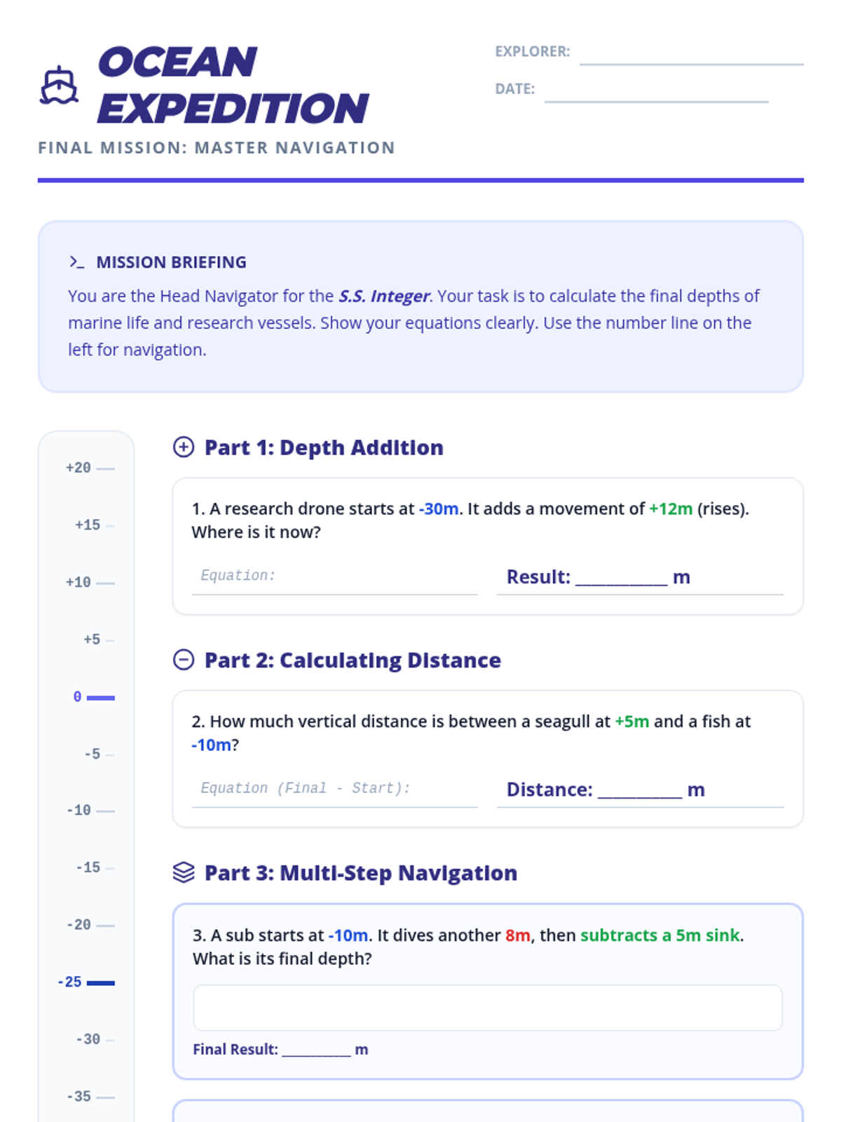 Students master integer subtraction by conceptualizing it as 'finding the distance' or 'changing direction' in ocean currents. Includes a final comprehensive homework assignment.