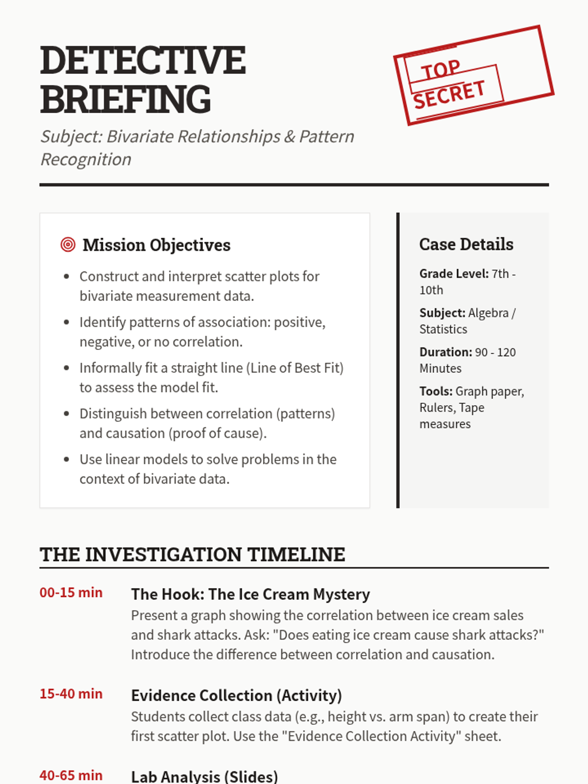 A comprehensive math lesson where students become 'Data Detectives' to explore scatter plots, lines of best fit, and the crucial distinction between correlation and causation through real-world evidence.
