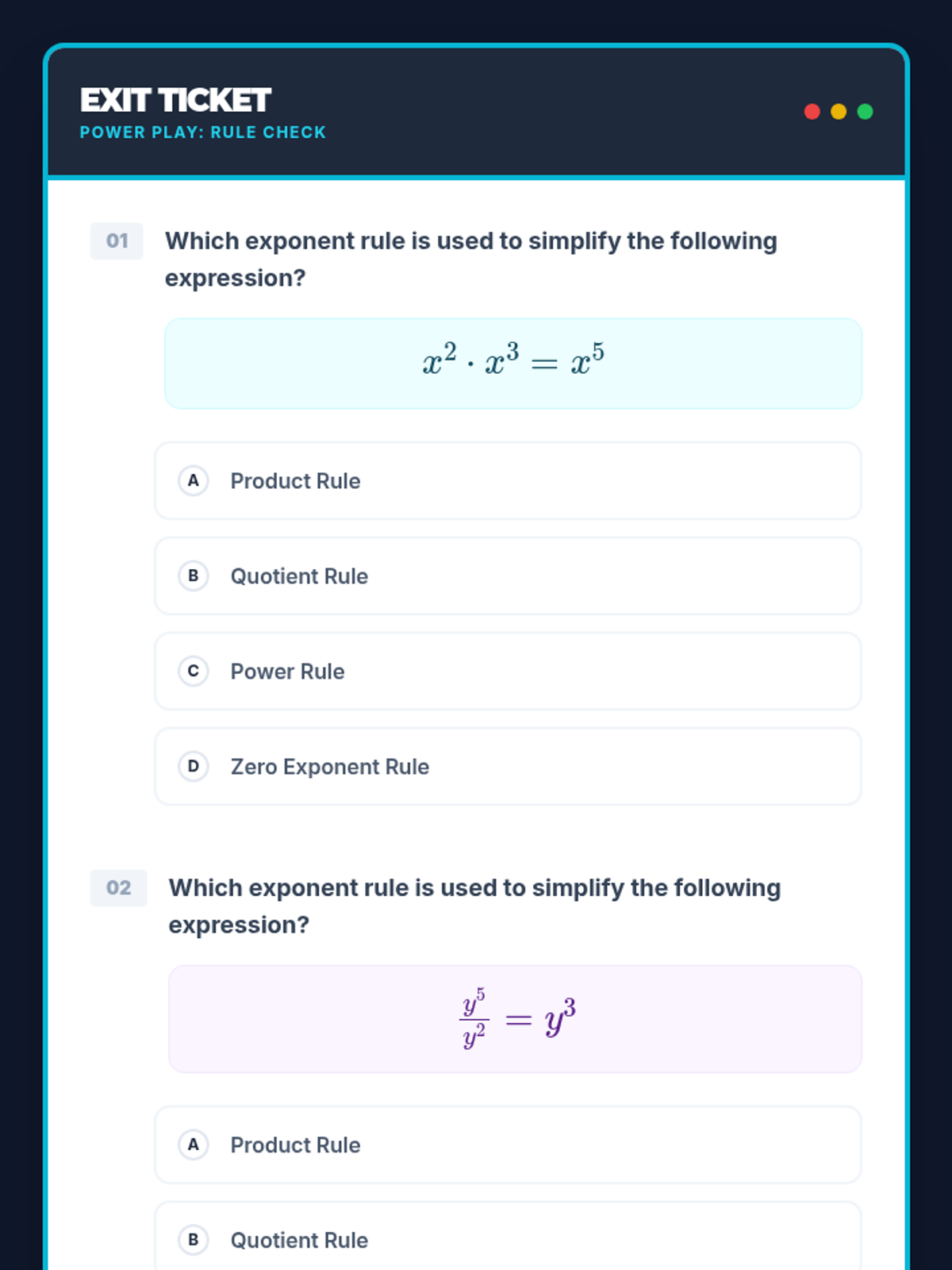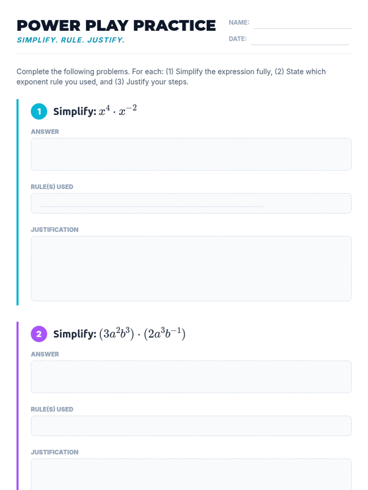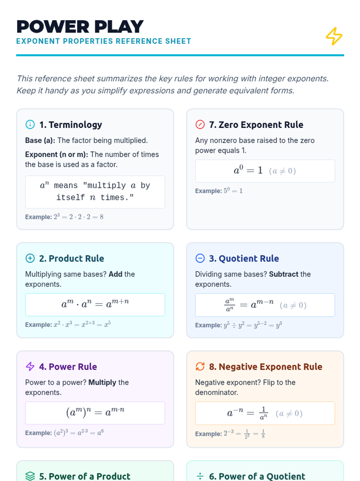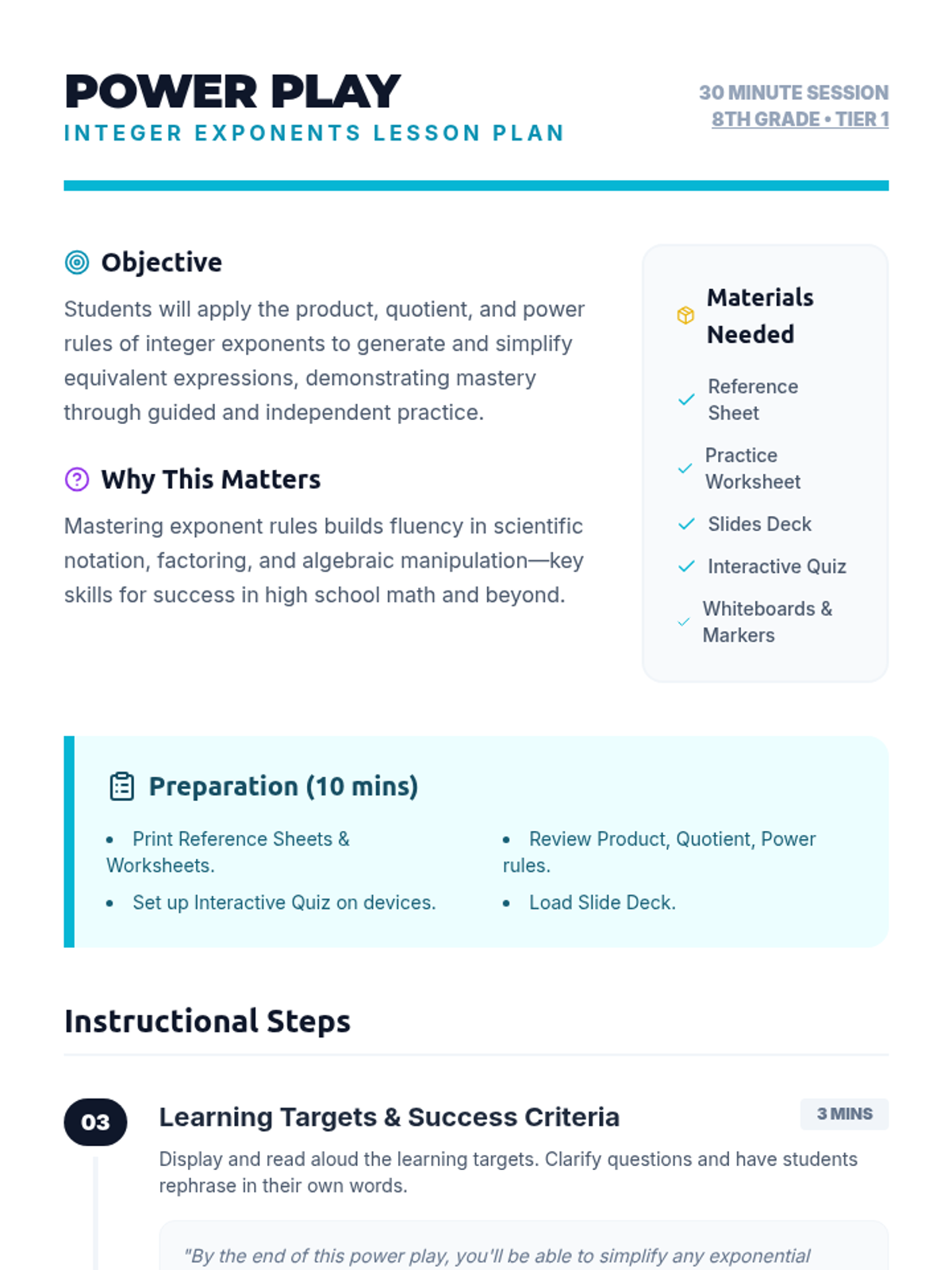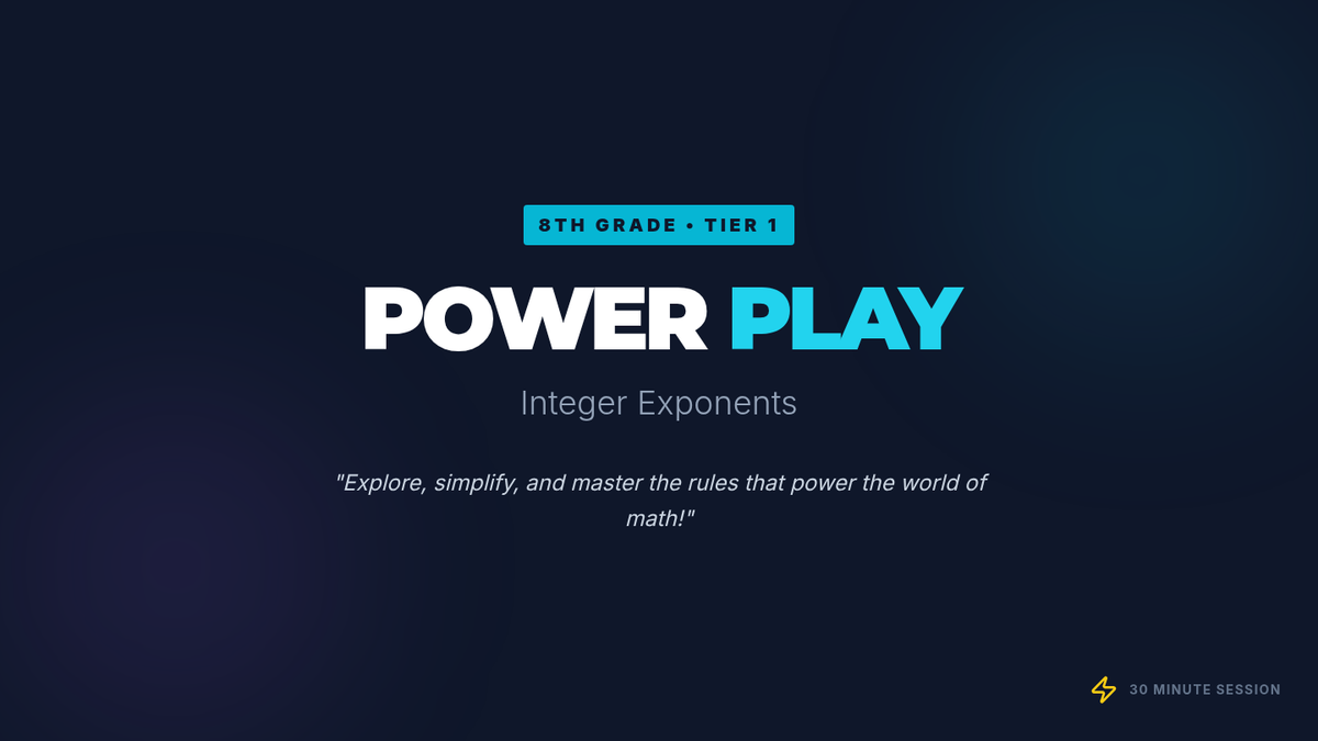 A high-energy 30-minute lesson for 8th-grade students to master the properties of integer exponents. Through guided practice and interactive checks, students learn to simplify complex expressions and justify their mathematical reasoning.